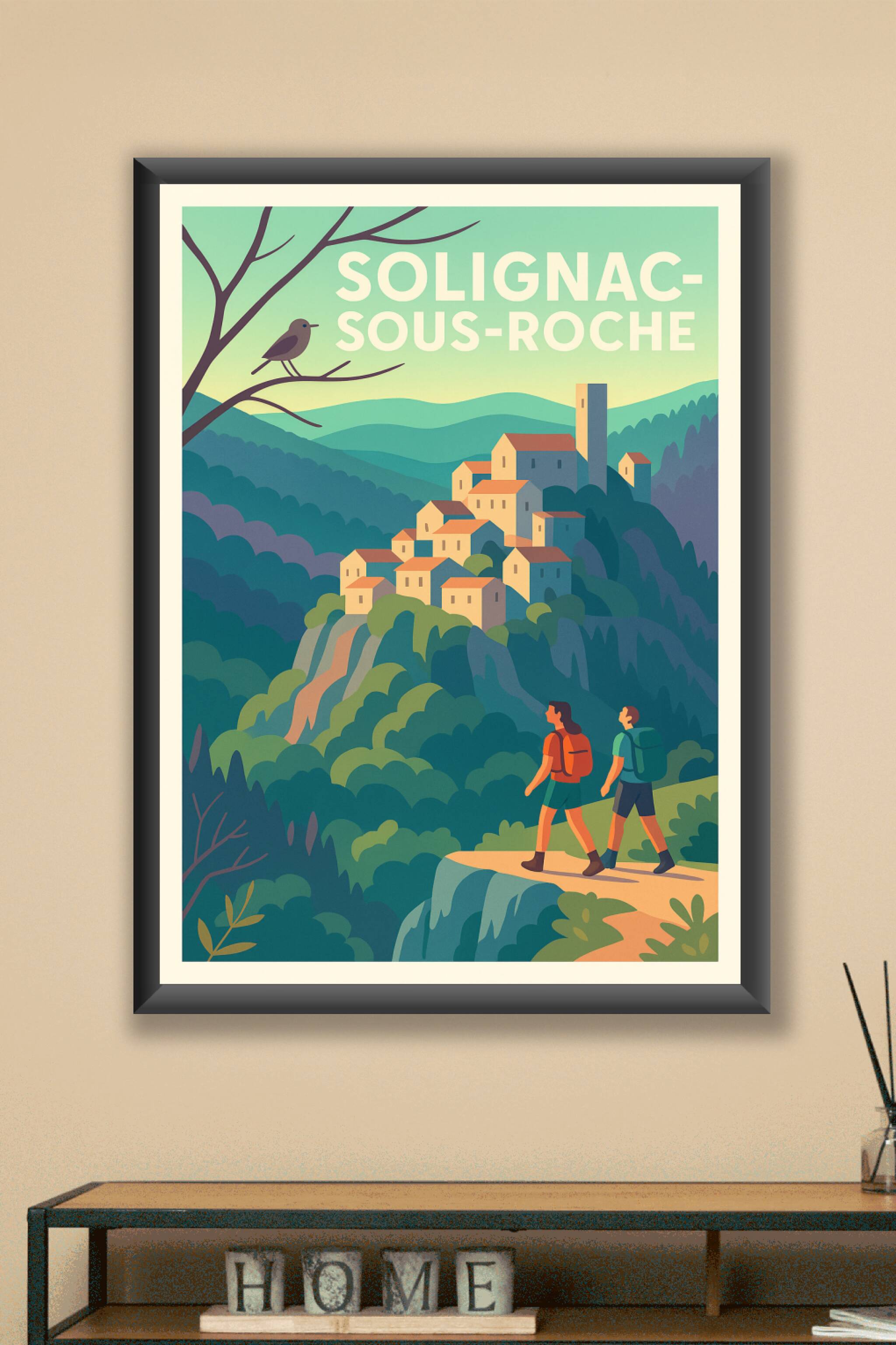 Découvrez toute la beauté authentique de Solignac-sous-Roche avec cette affiche illustrée dans un style vintage et coloré. Représentant les ruelles...
