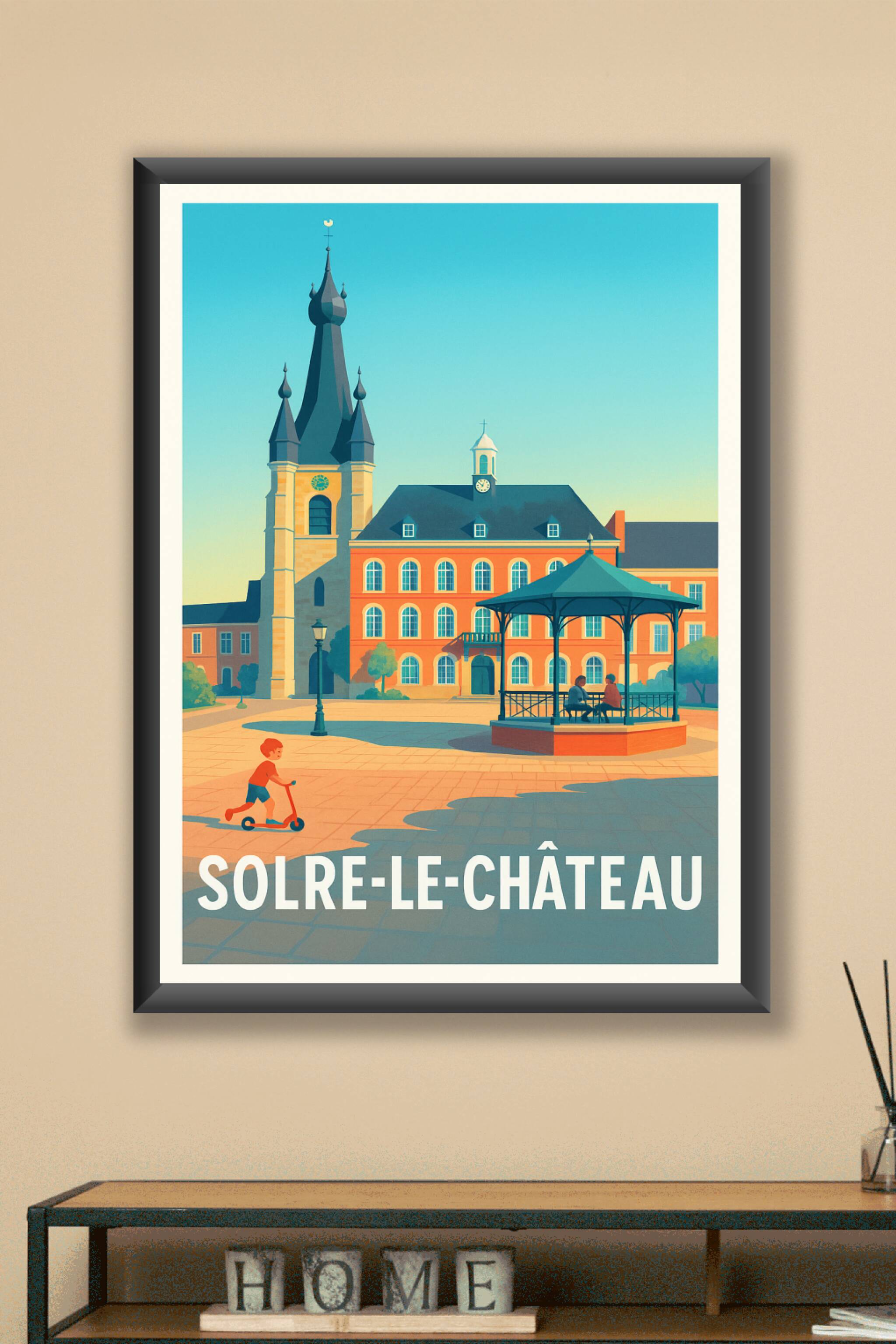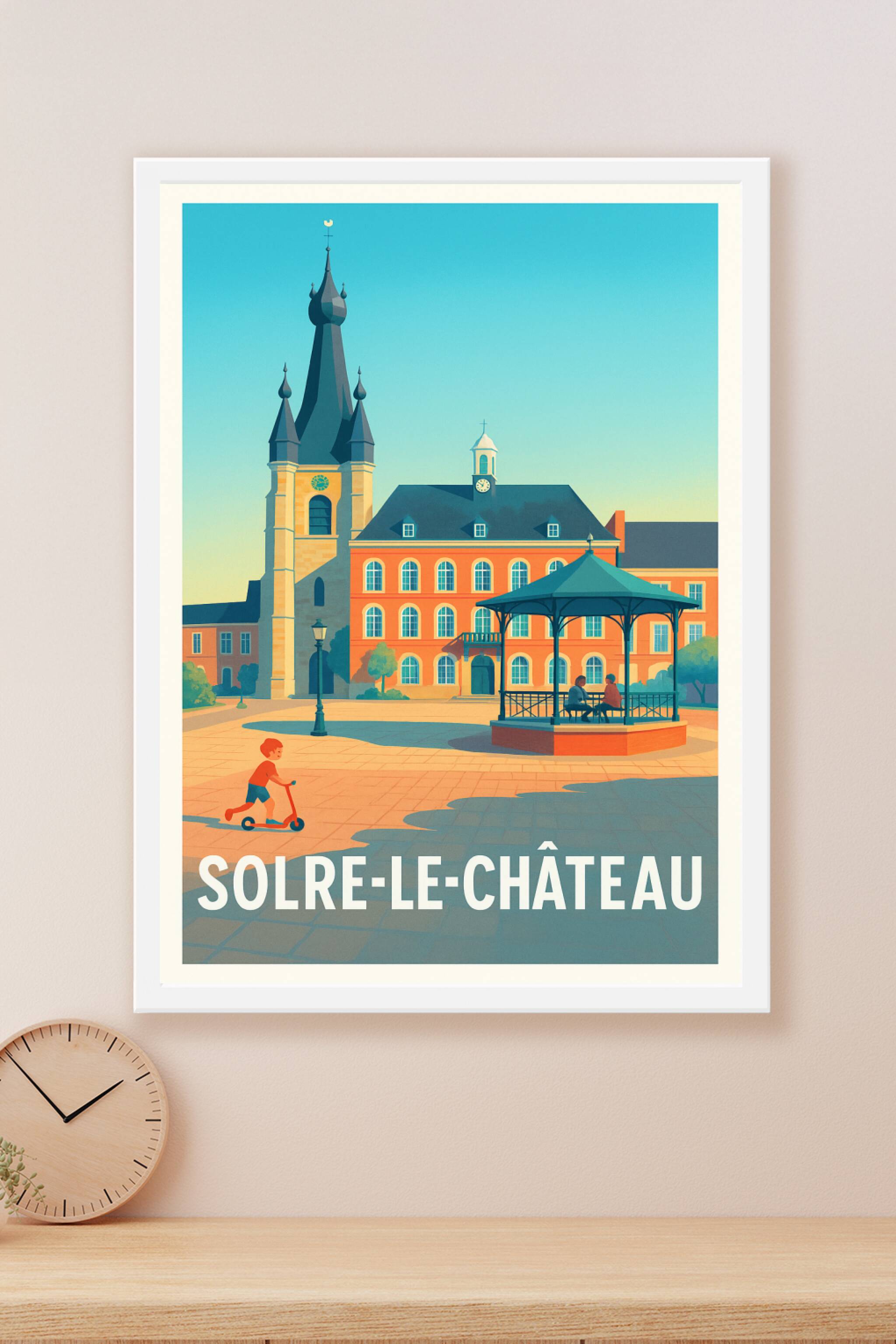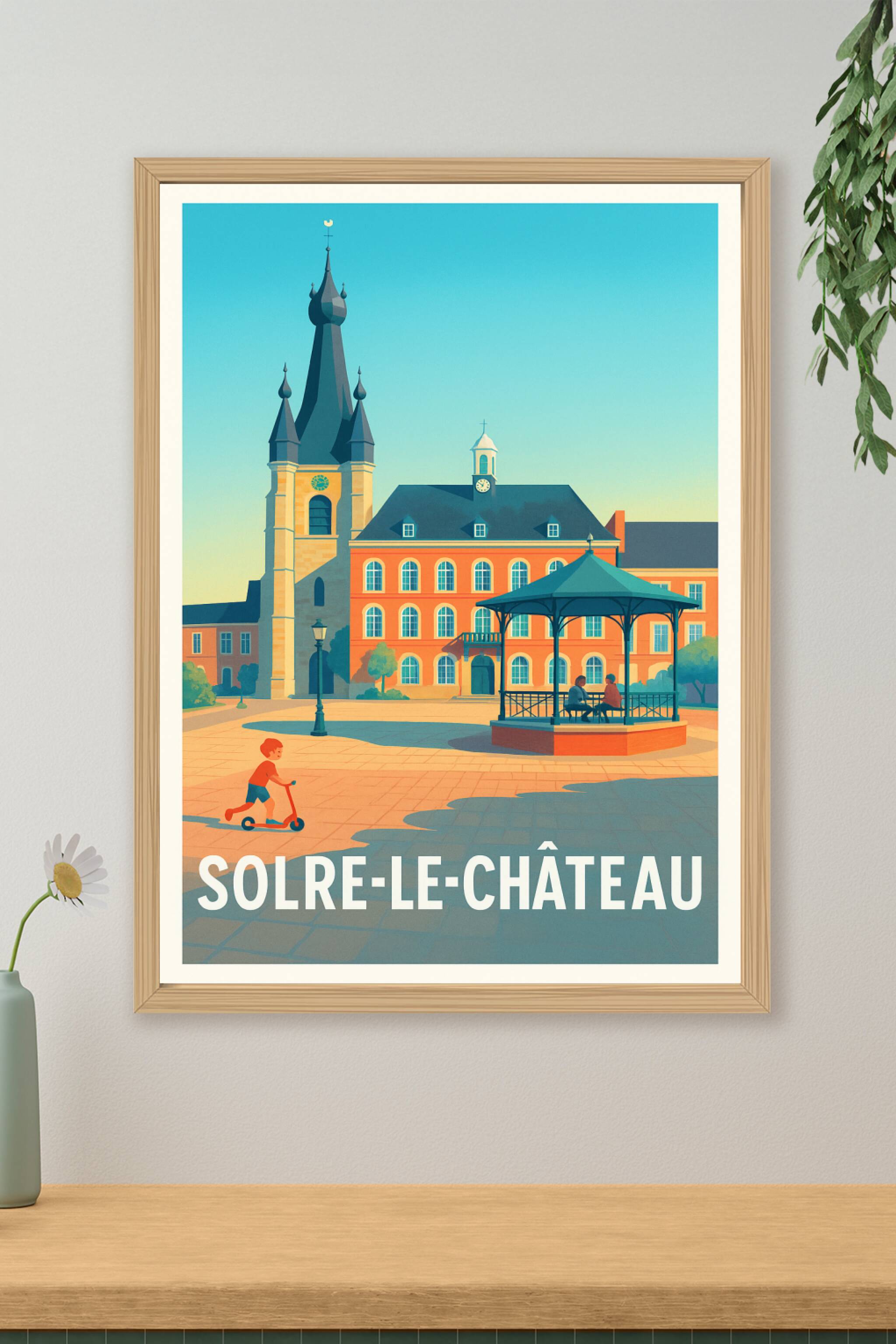 Découvrez Solre-le-Château à travers cette affiche illustrée pleine de douceur, où le patrimoine architectural et la vie locale se mêlent avec harm...