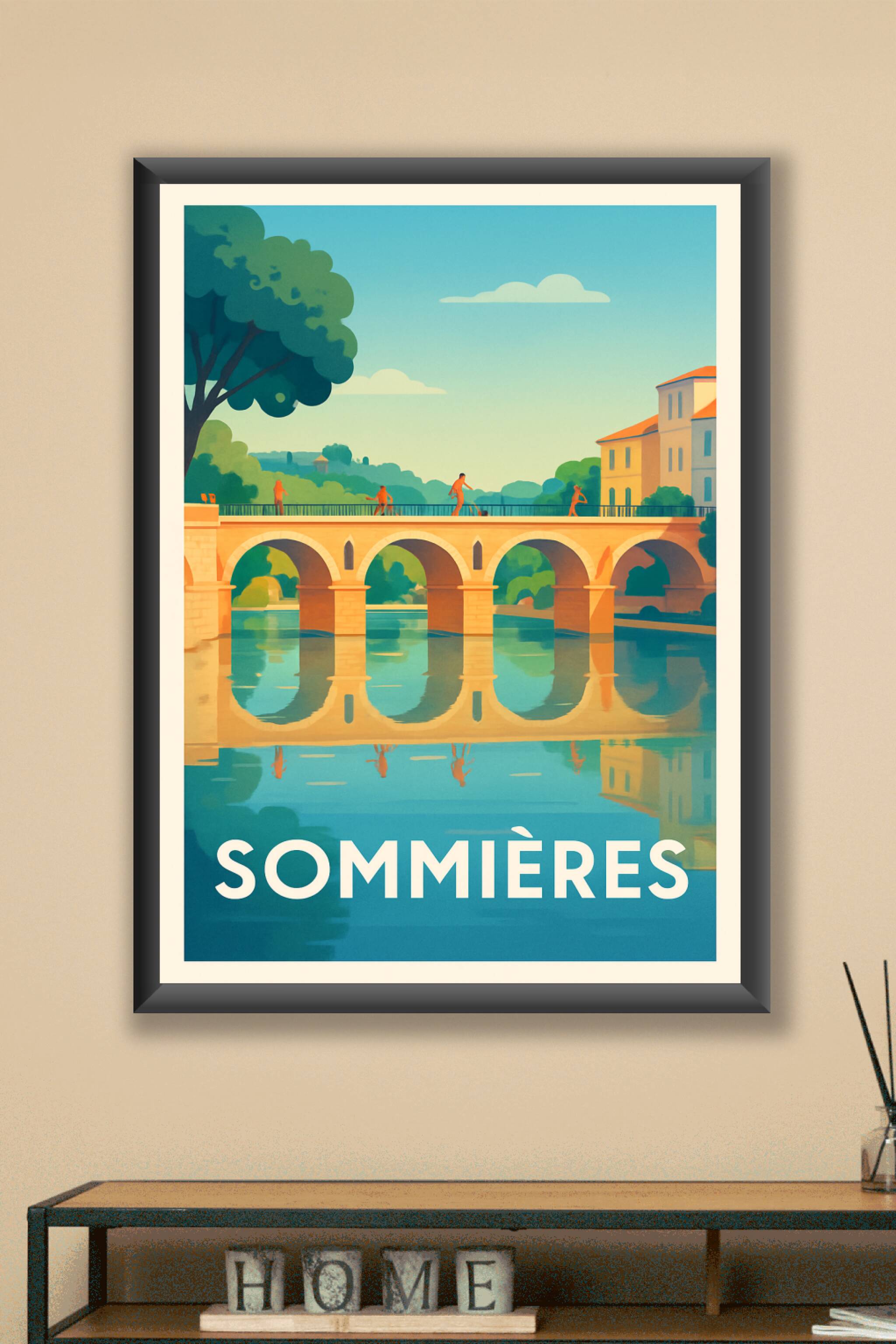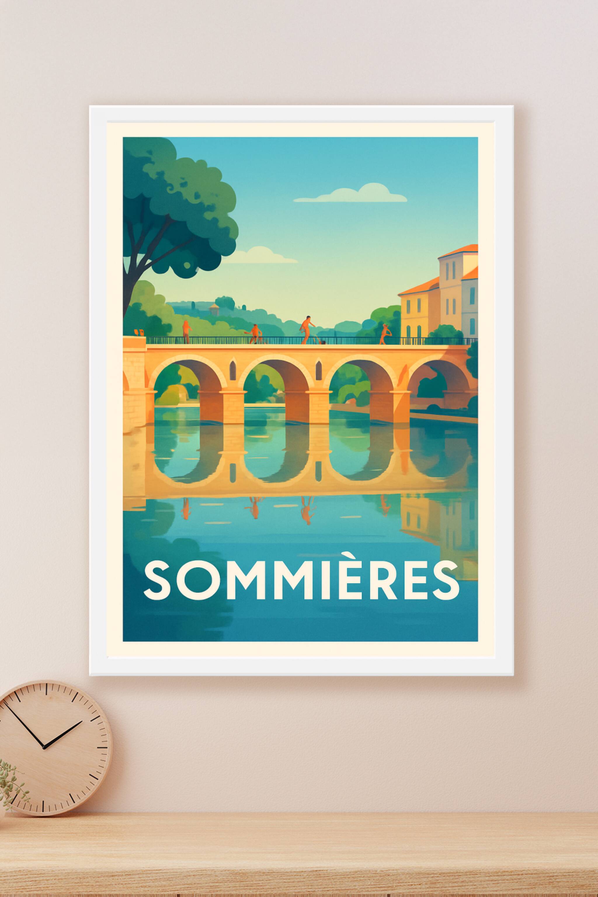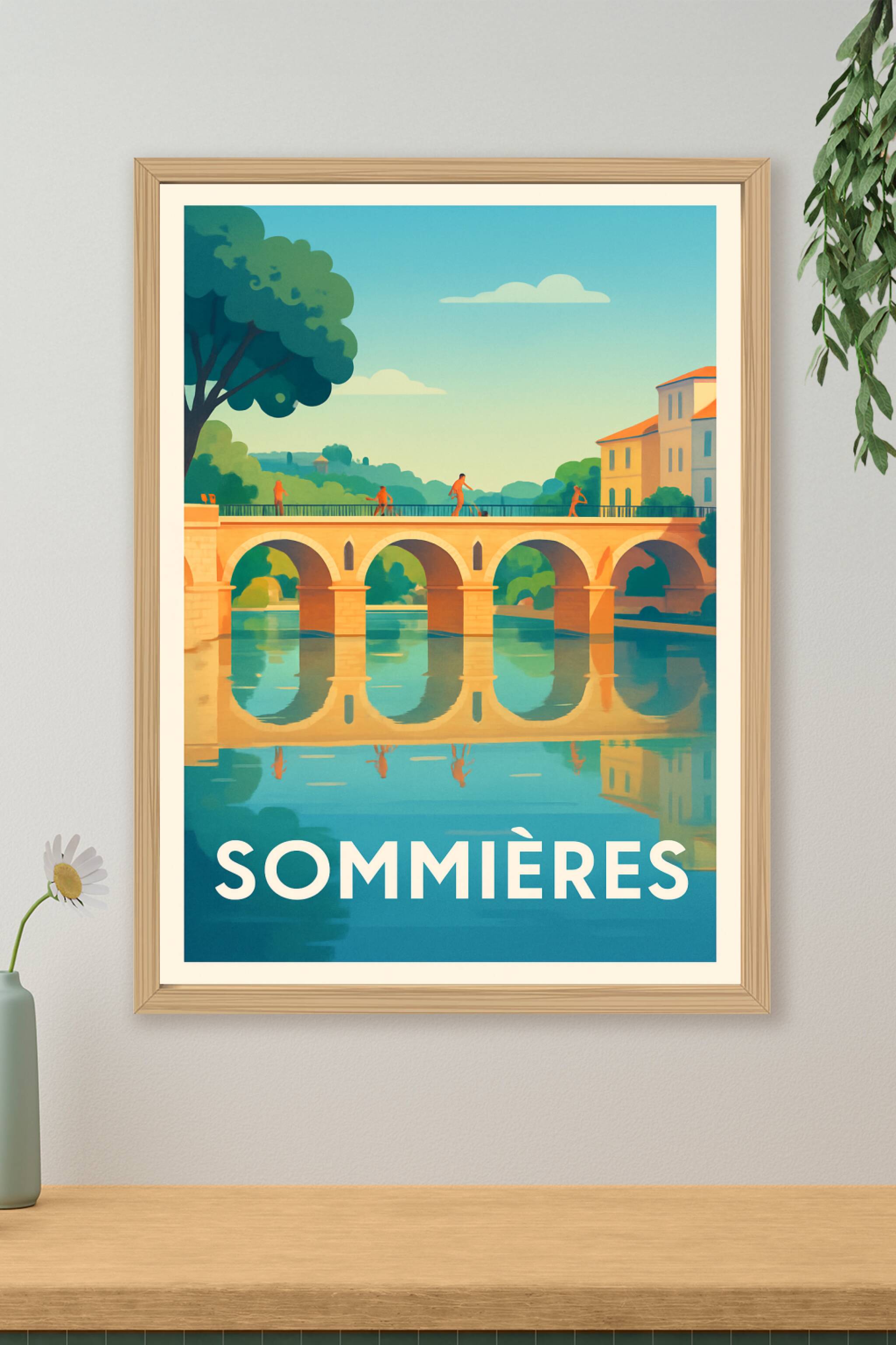 Découvrez l'élégance intemporelle de Sommières à travers cette affiche illustrée qui met en valeur le célèbre pont ancien et ses reflets tranquille...