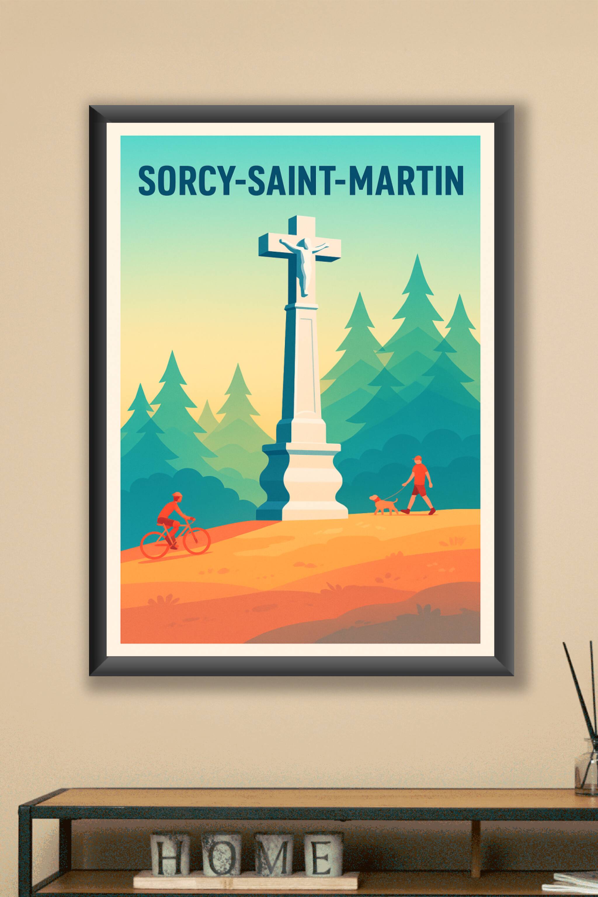 Découvrez la quiétude et la beauté naturelle de Sorcy-Saint-Martin avec cette affiche illustrée mettant en scène un monument emblématique entouré d...