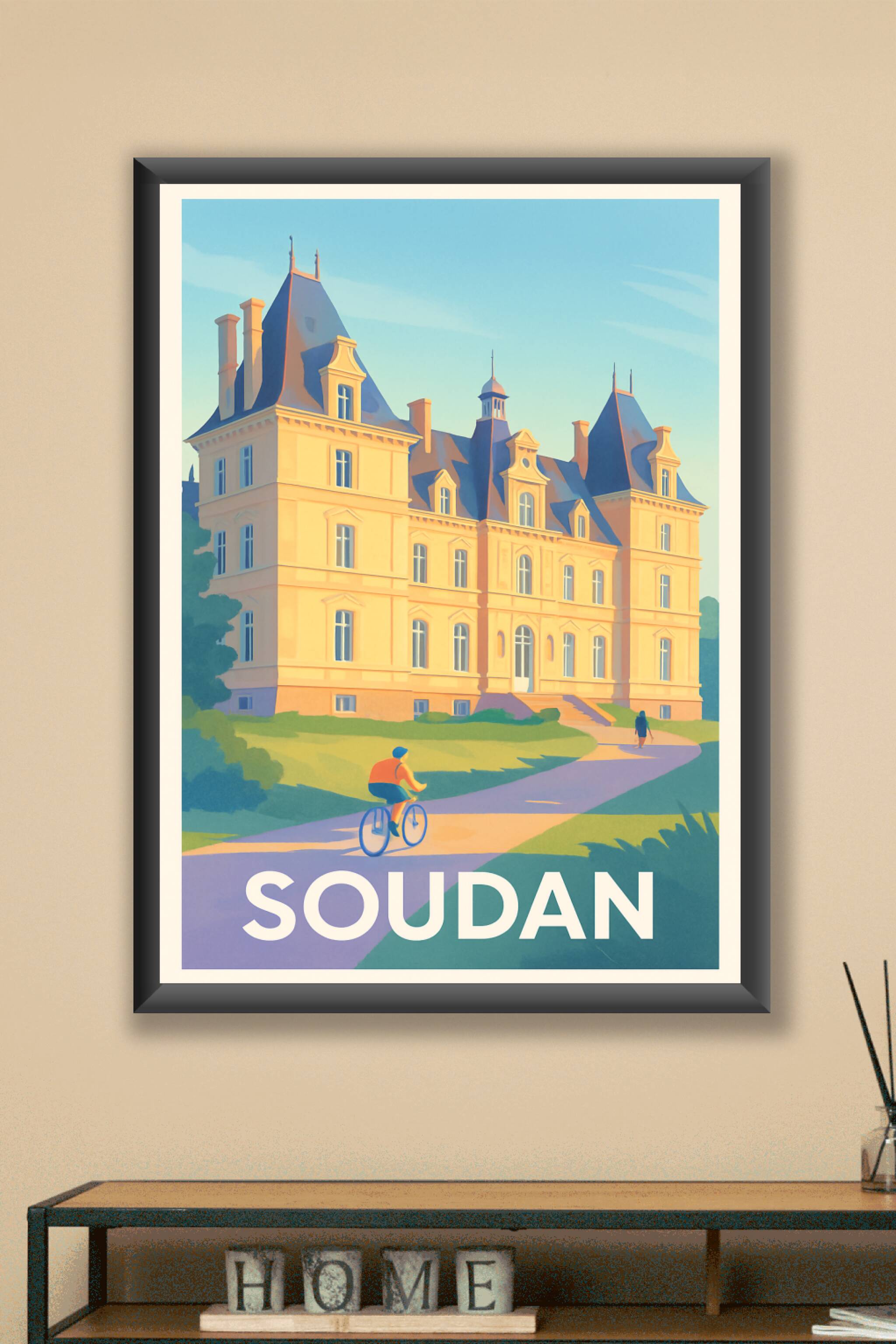 Découvrez la beauté architecturale et la quiétude du château de Soudan à travers cette affiche illustrée au style doux et lumineux. Le poster met en scène une scène paisible avec un cycliste et un promeneur, évoquant le charme bucolique de cette ville. Imprimée en tirage "Fine Art" sur papier 305g coton, cette affiche offre une qualité d'impression exceptionnelle, aux couleurs vibrantes et à la finesse de détails remarquable. Disponible en formats du A1 au A4, avec ou sans cadre, elle s'adapte parfaitement à votre intérieur pour y apporter une touche de raffinement et d'élégance. Sublimez votre décoration ou offrez un cadeau unique avec ce poster premium, 100% fabriqué en France.