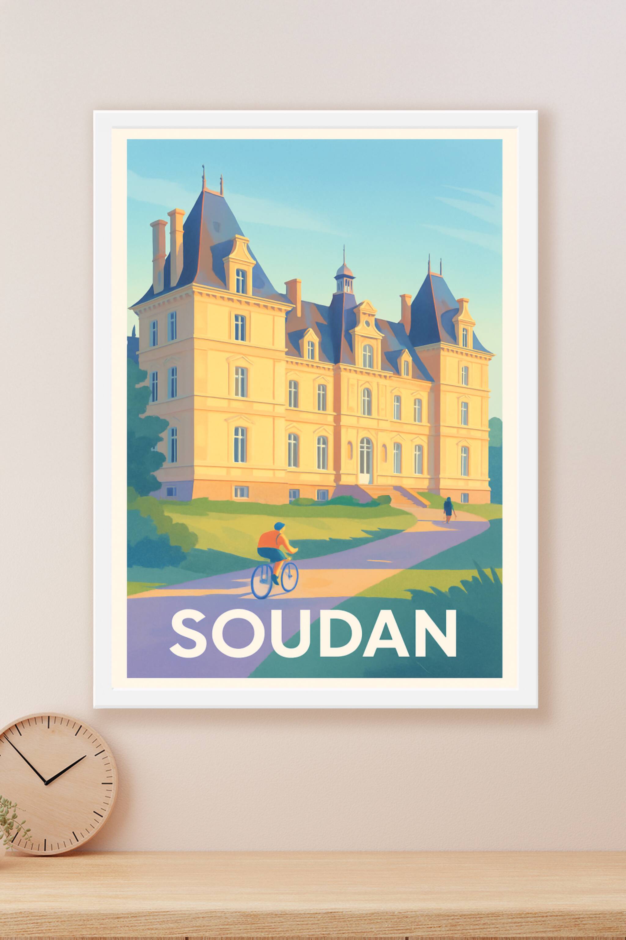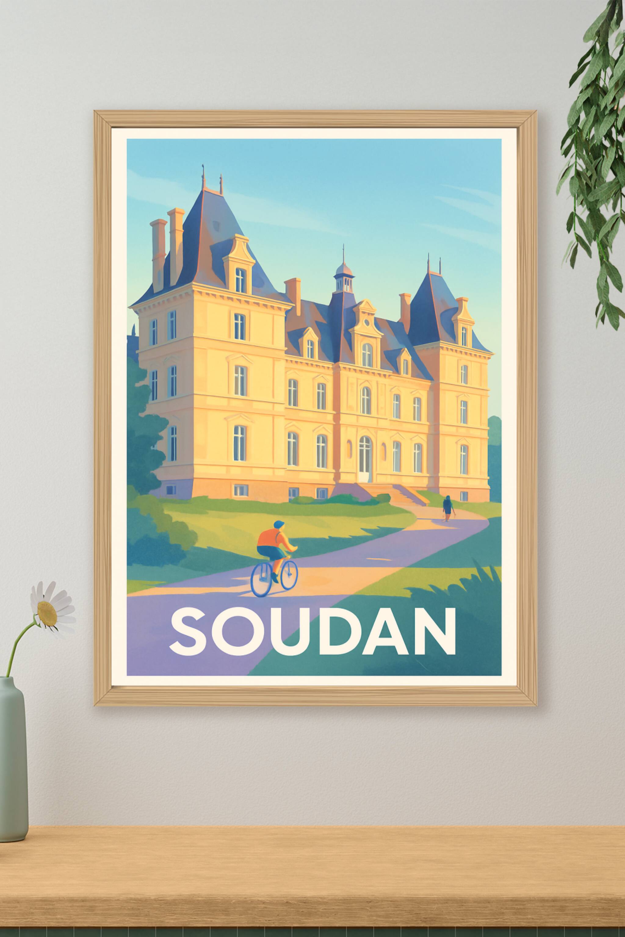 Découvrez la beauté architecturale et la quiétude du château de Soudan à travers cette affiche illustrée au style doux et lumineux. Le poster met e...