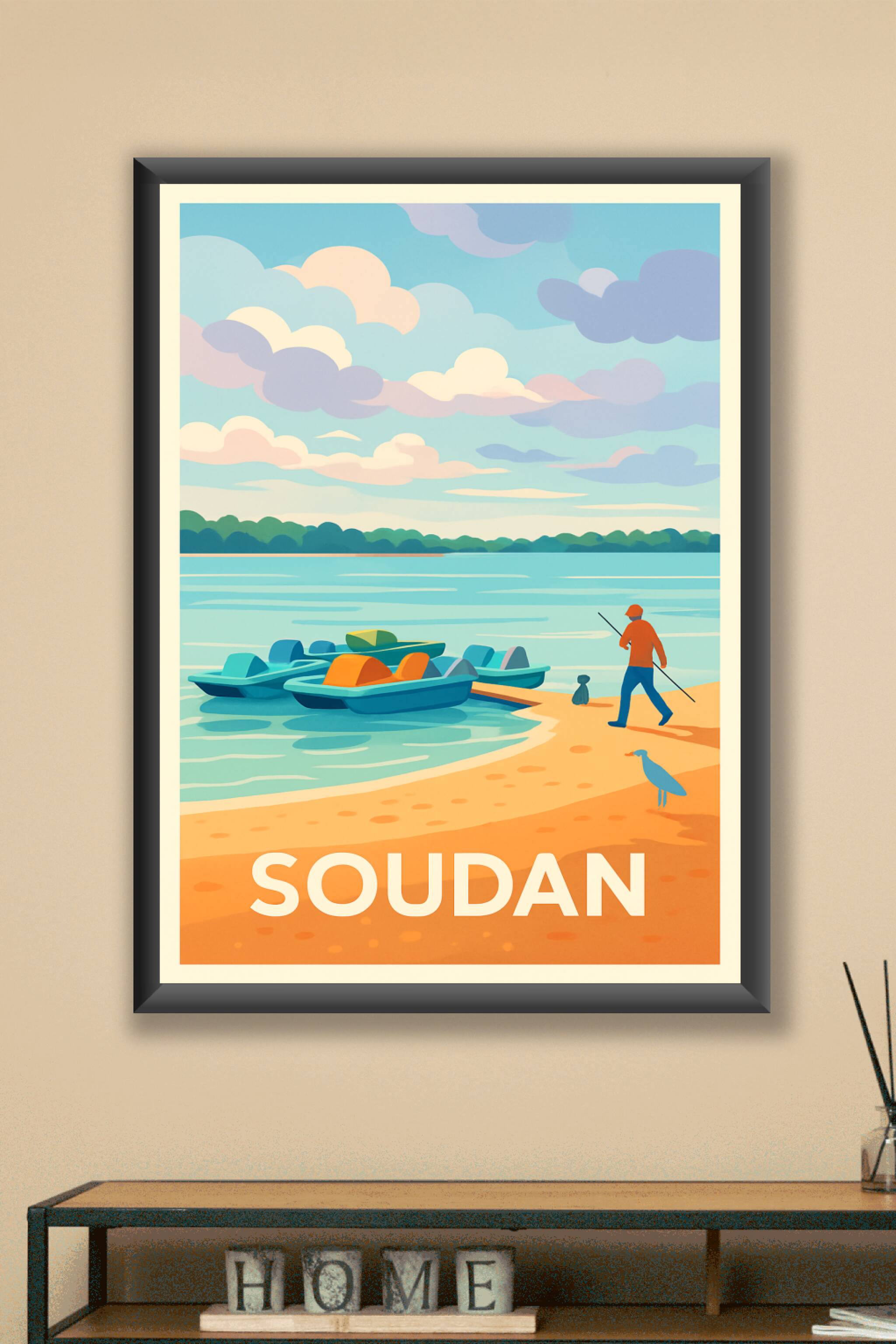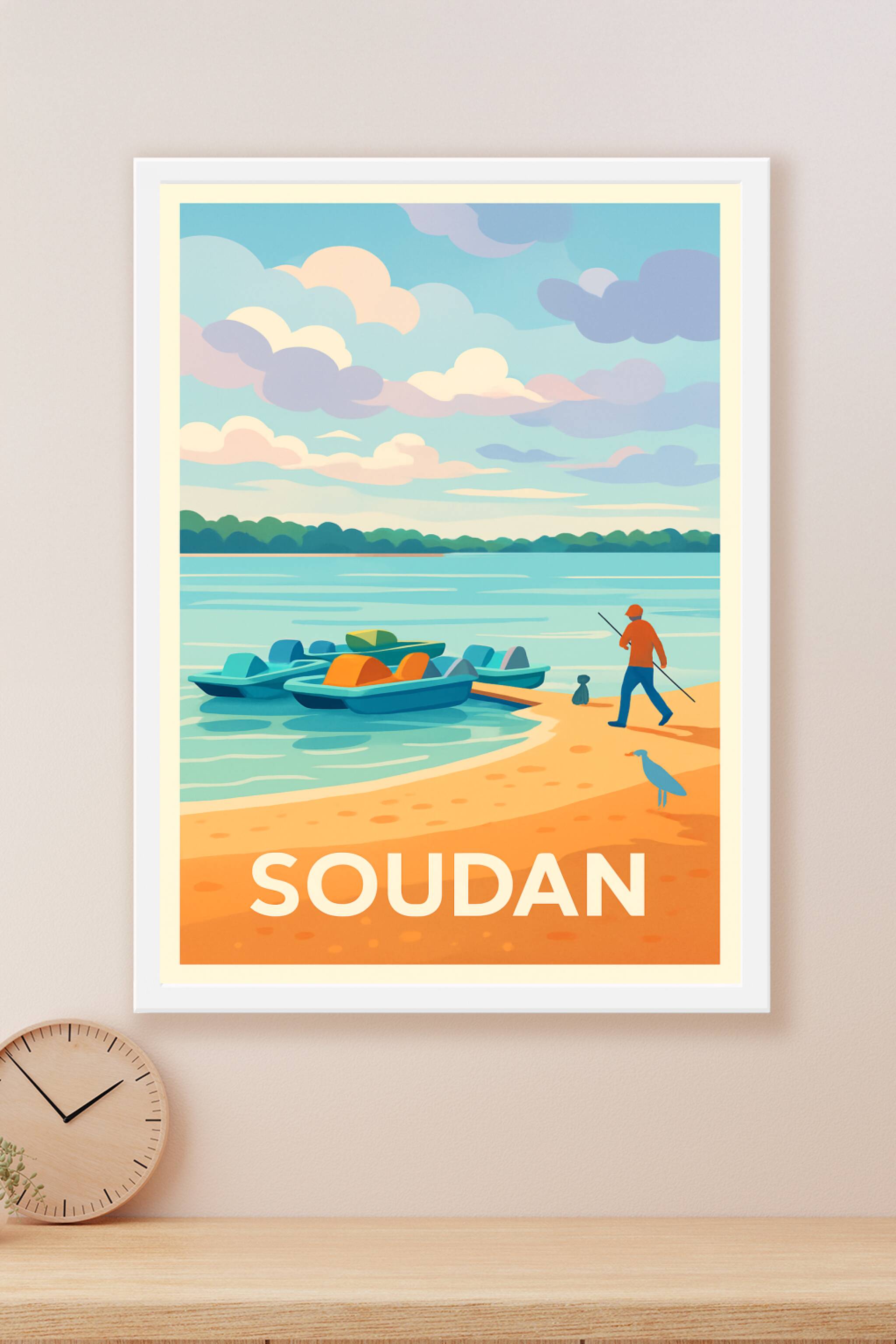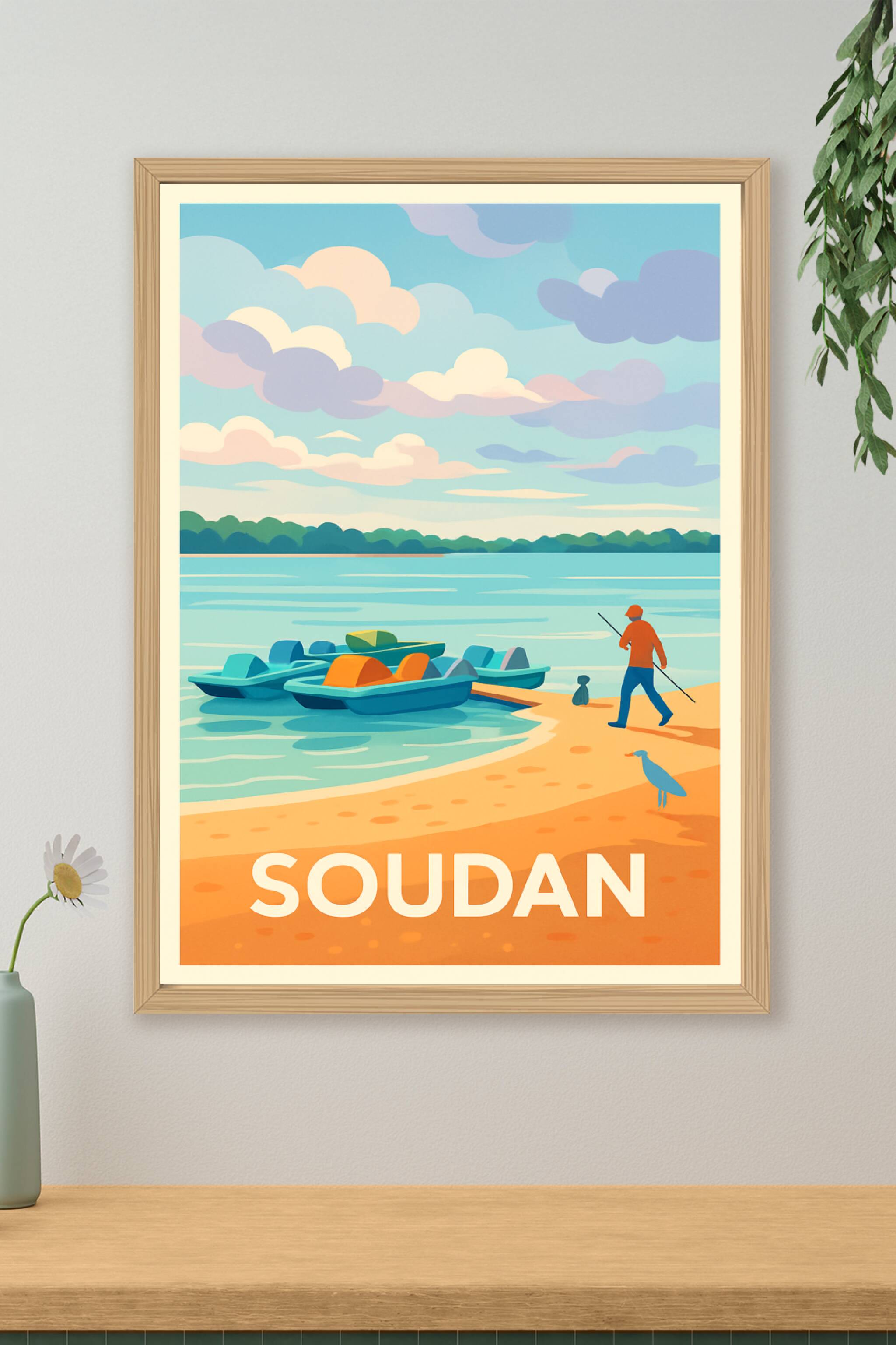 Découvrez la sérénité et la beauté naturelle du Soudan avec cette affiche illustrée, représentant un paysage paisible au bord d’un lac aux couleurs...