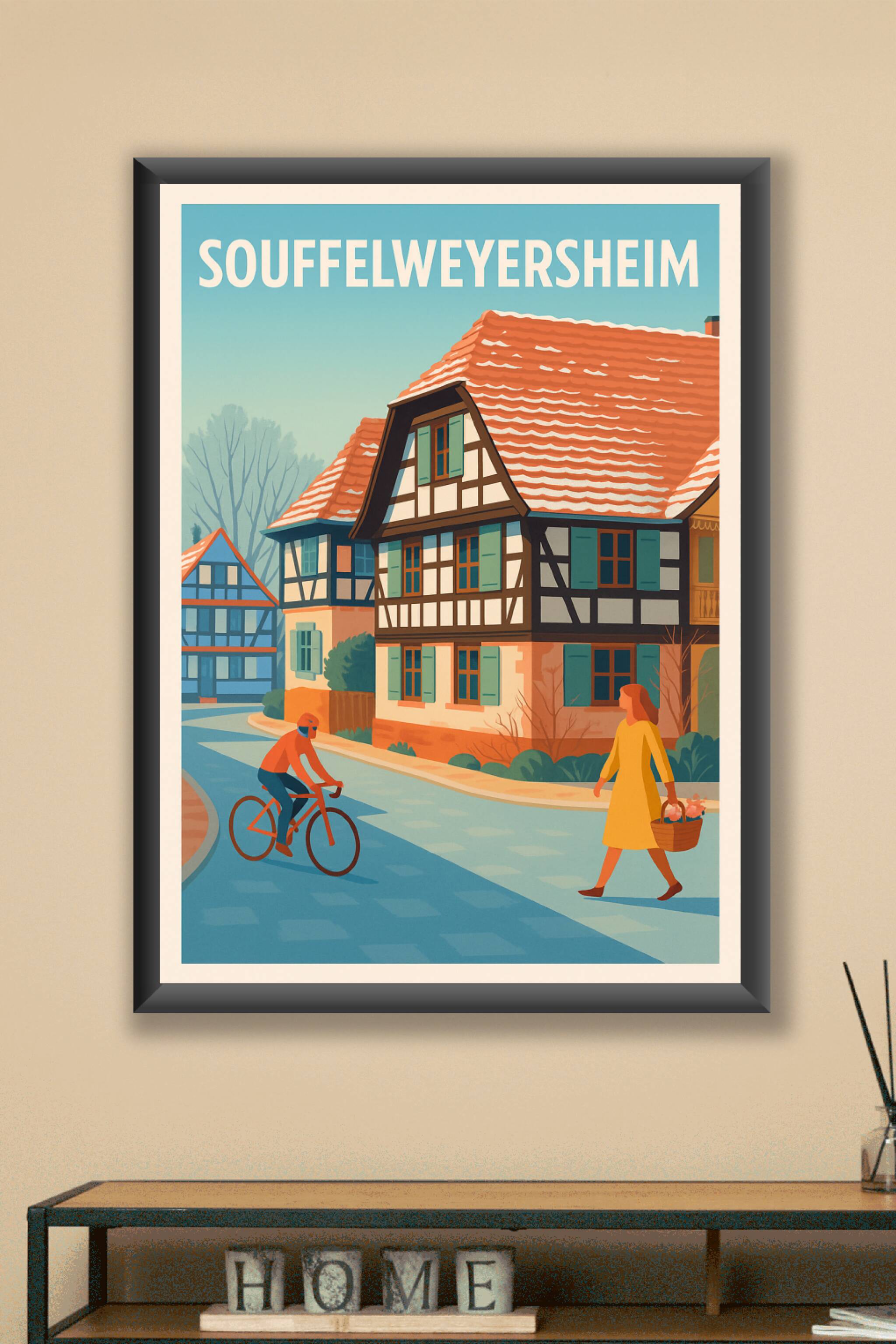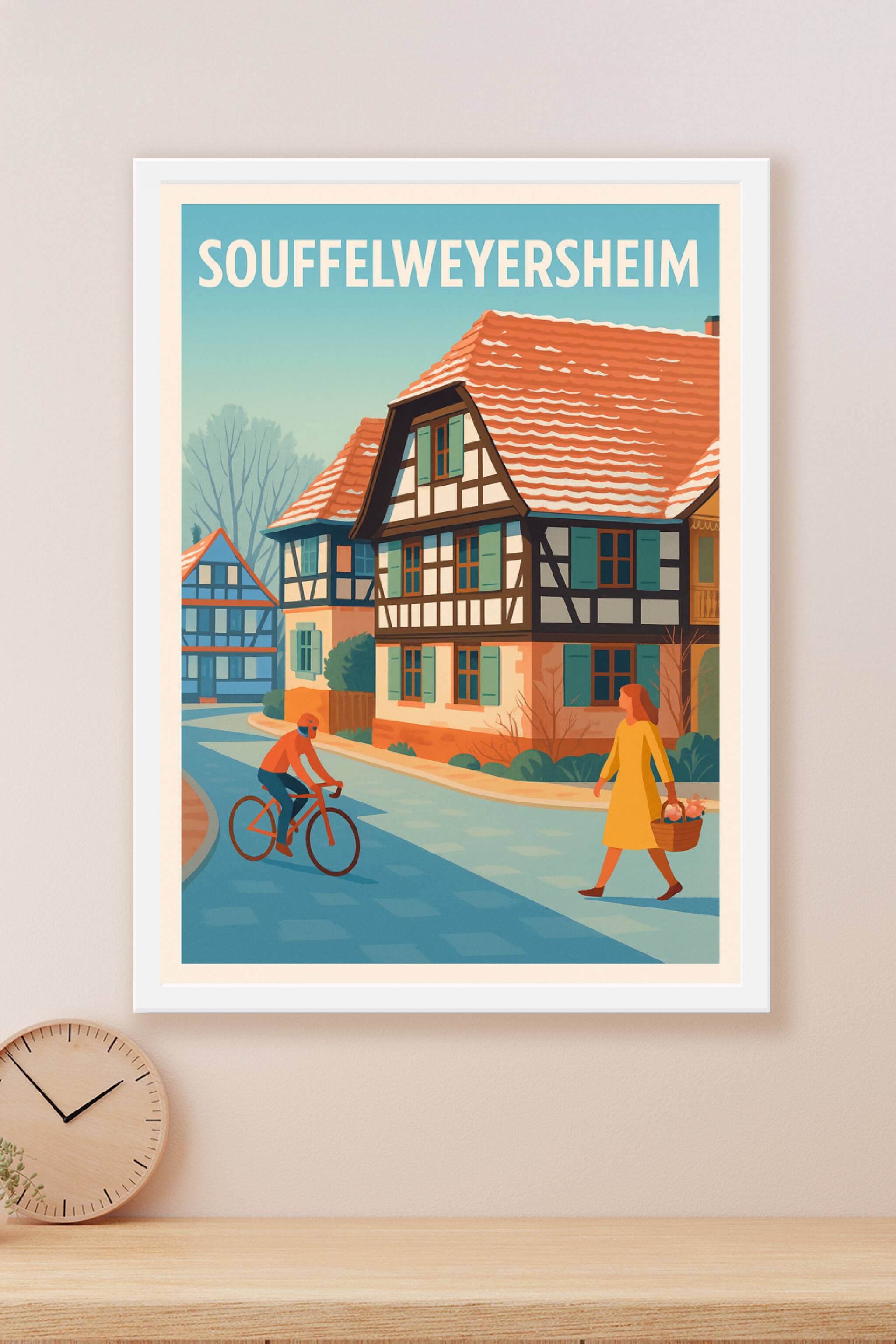 Découvrez le charme pittoresque de Souffelweyersheim avec cette affiche illustrée mettant en scène une balade tranquille dans ses rues bordées de m...