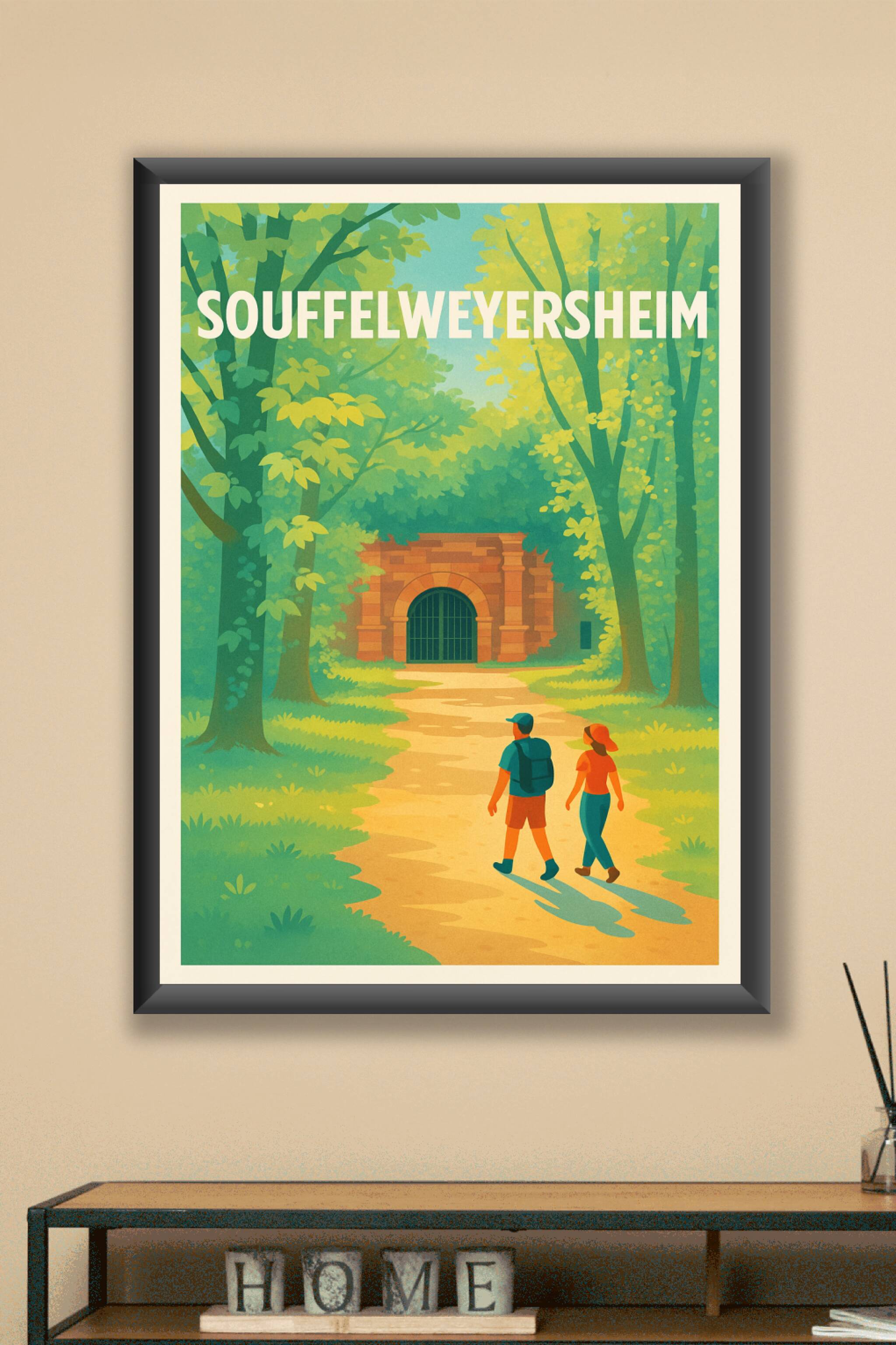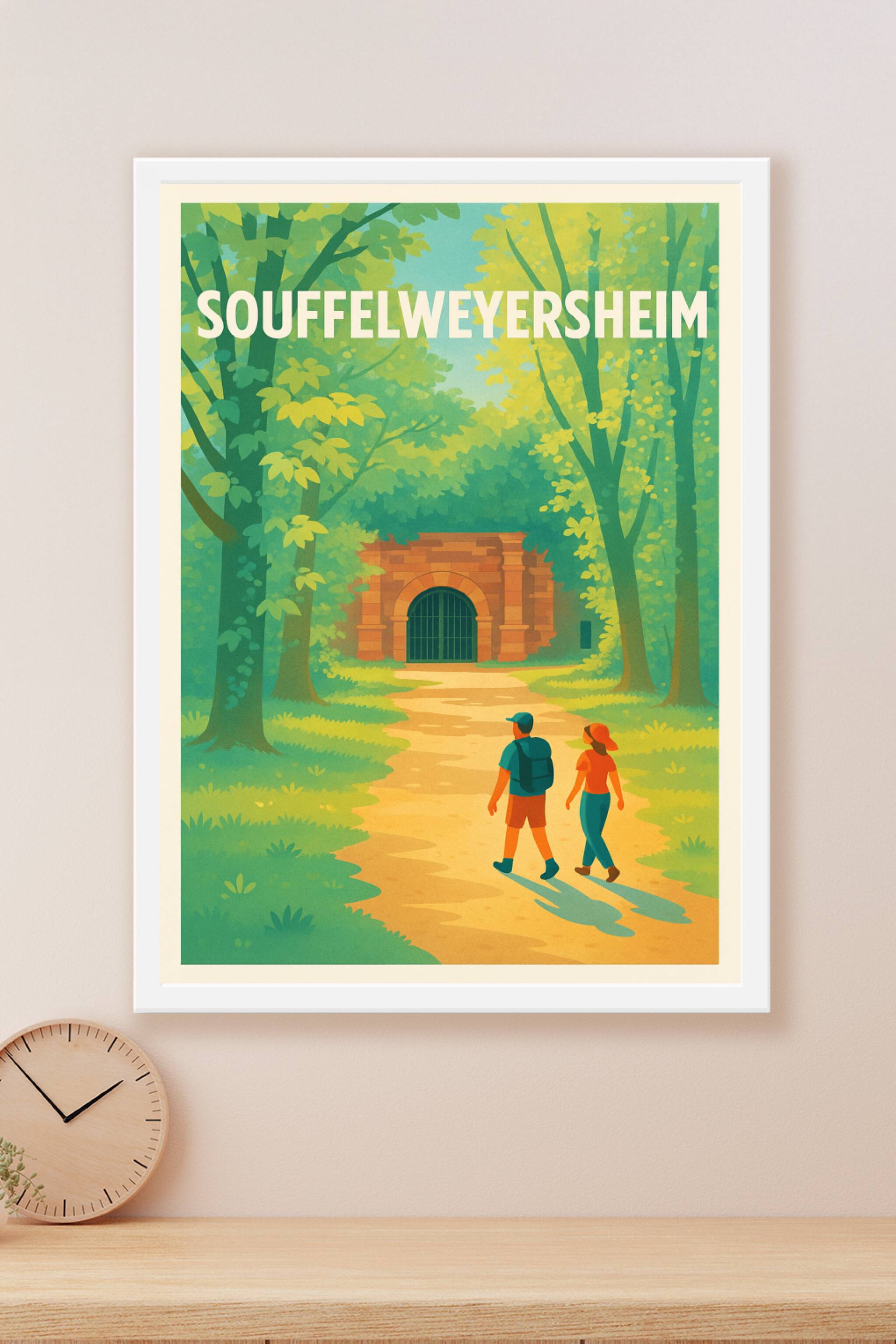 Découvrez l'atmosphère paisible et verdoyante de Souffelweyersheim avec cette affiche illustrée captivante. Représentant un sentier forestier menan...