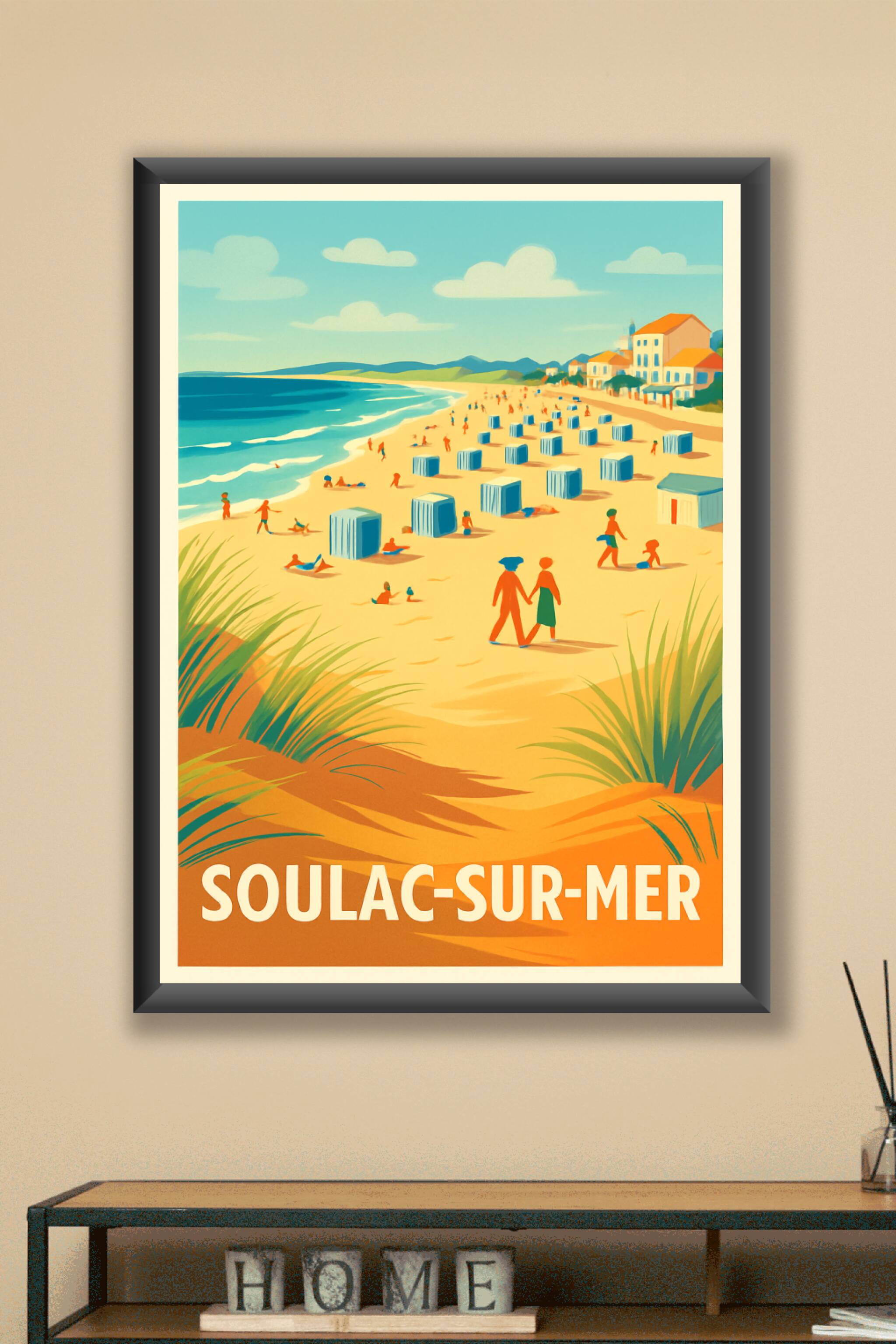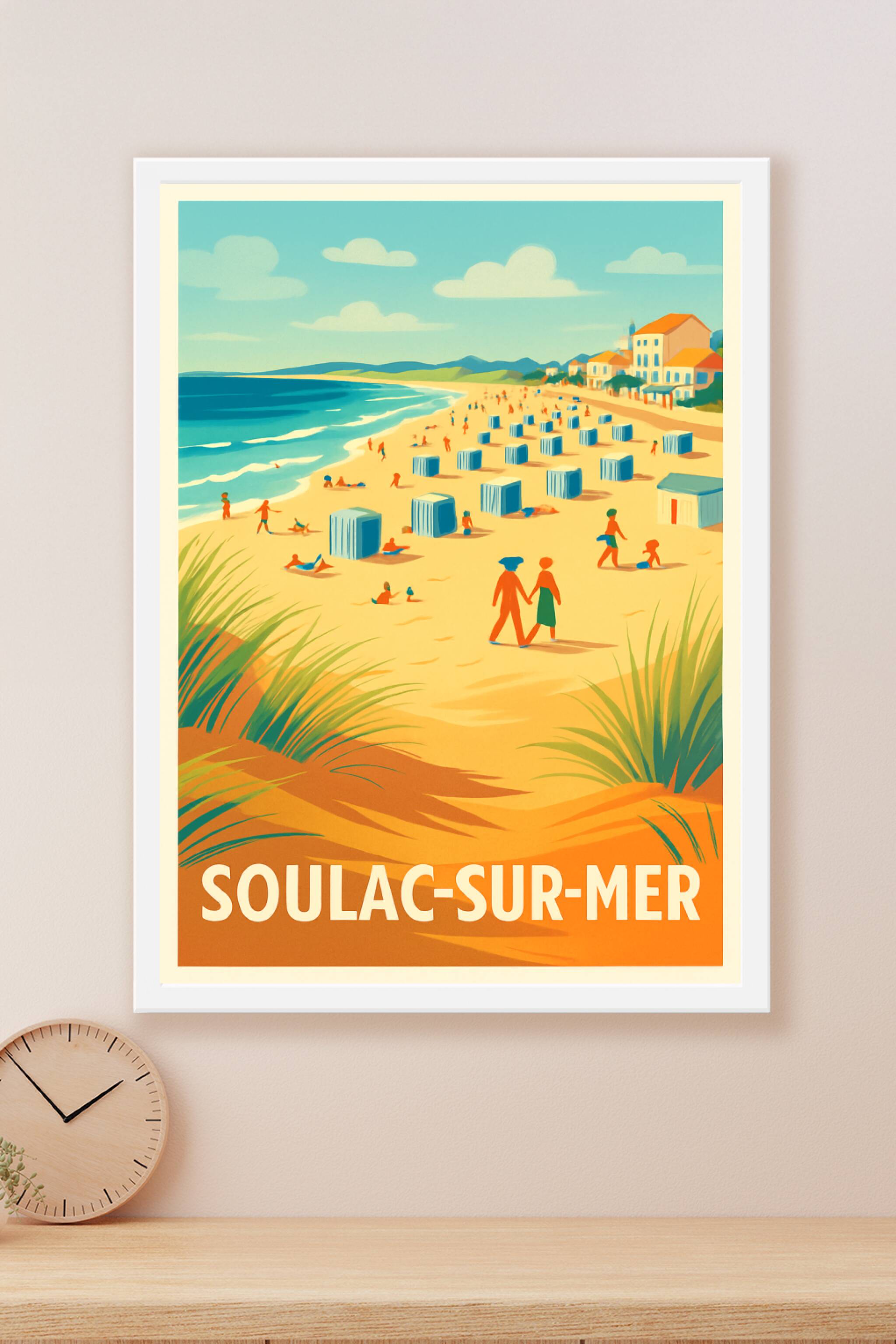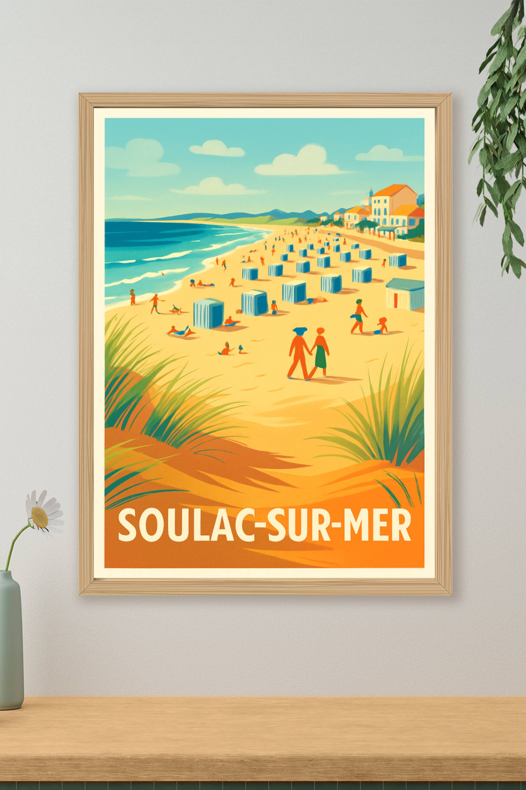 Découvrez l'élégance balnéaire de Soulac-sur-Mer avec cette magnifique affiche illustrée, inspirée des plages dorées et des cabines de plage emblém...