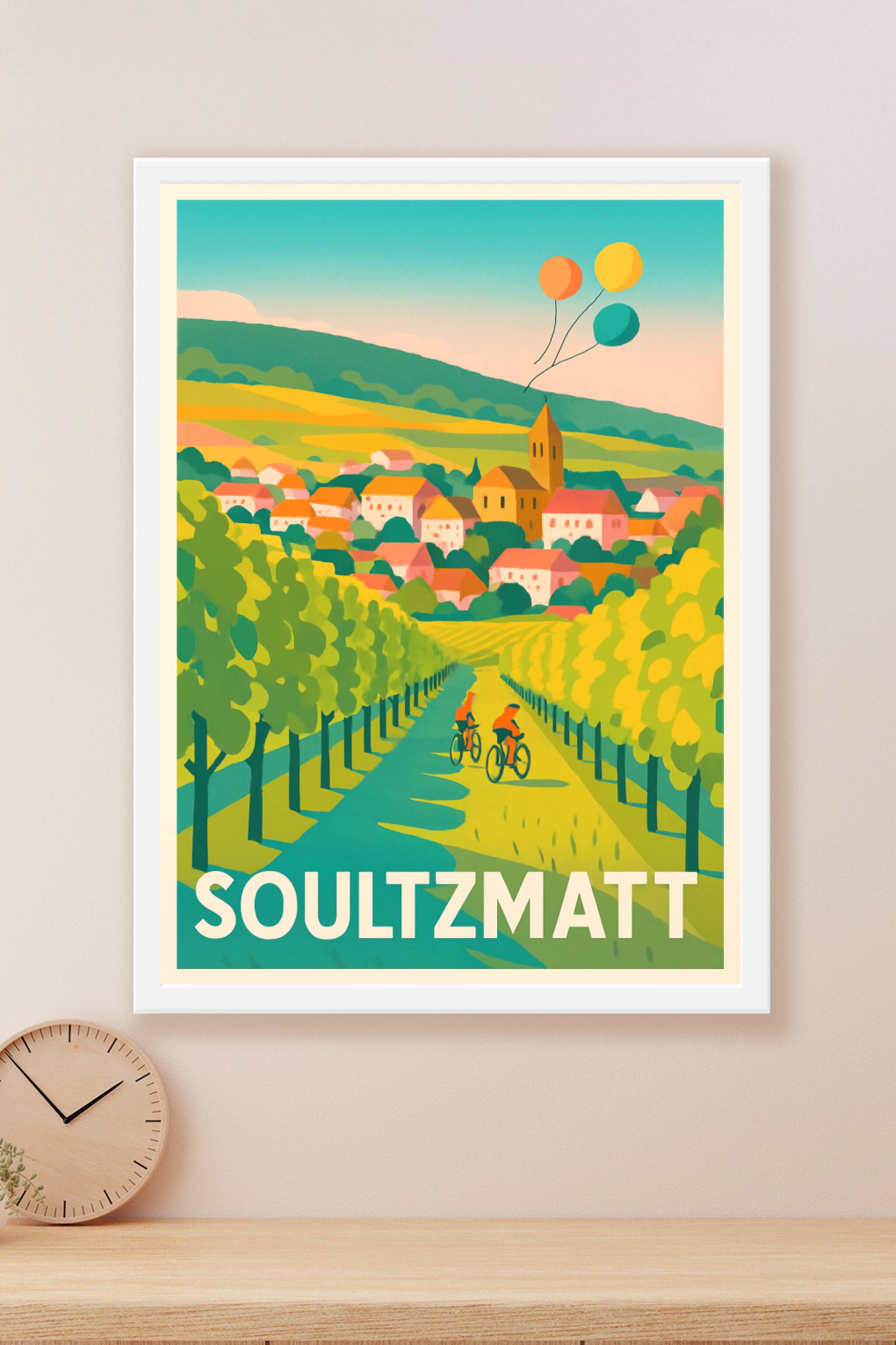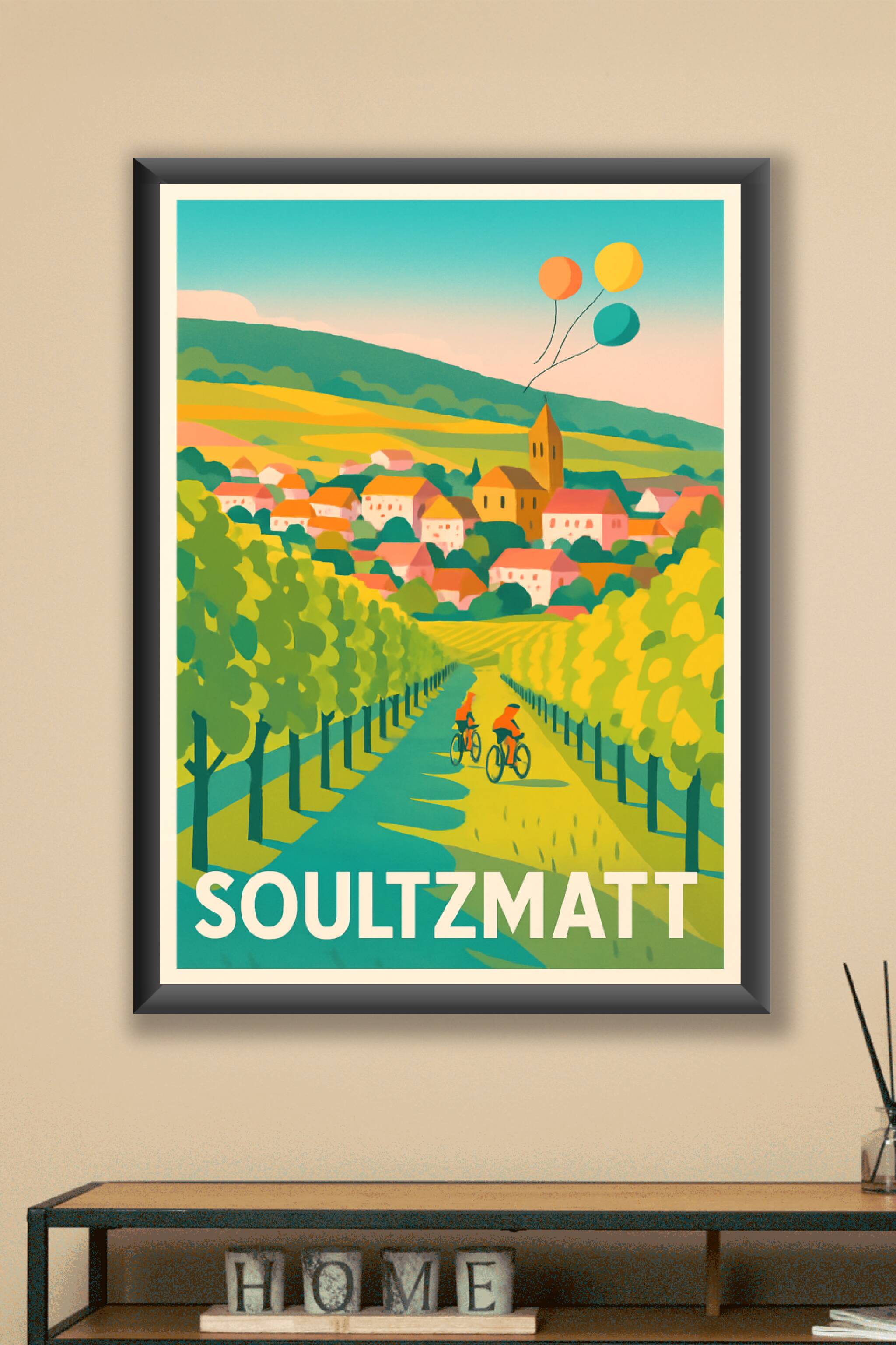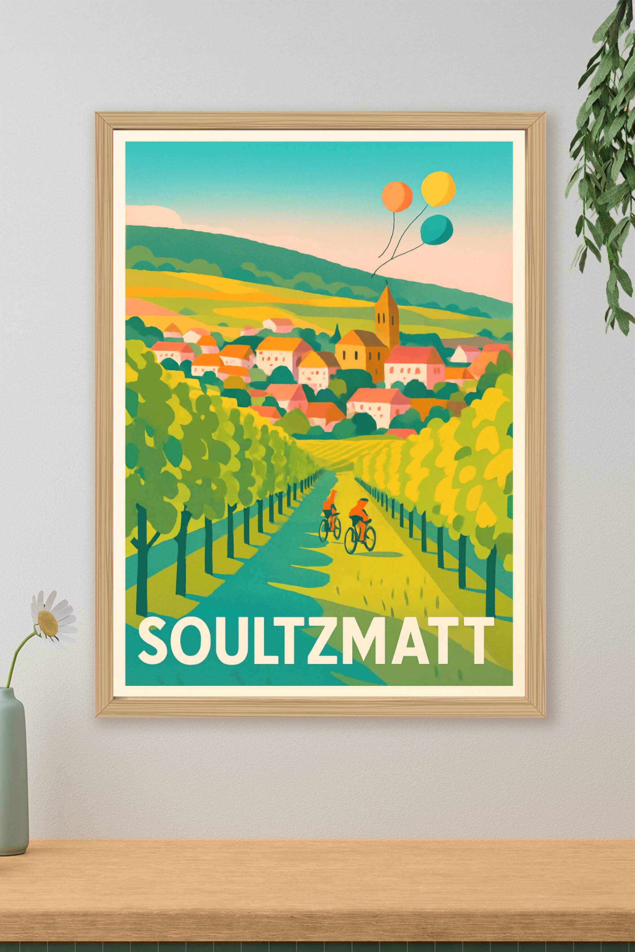 Découvrez la douceur de vivre alsacienne avec cette affiche illustrée représentant une balade à vélo à travers les vignobles colorés de Soultzmatt....