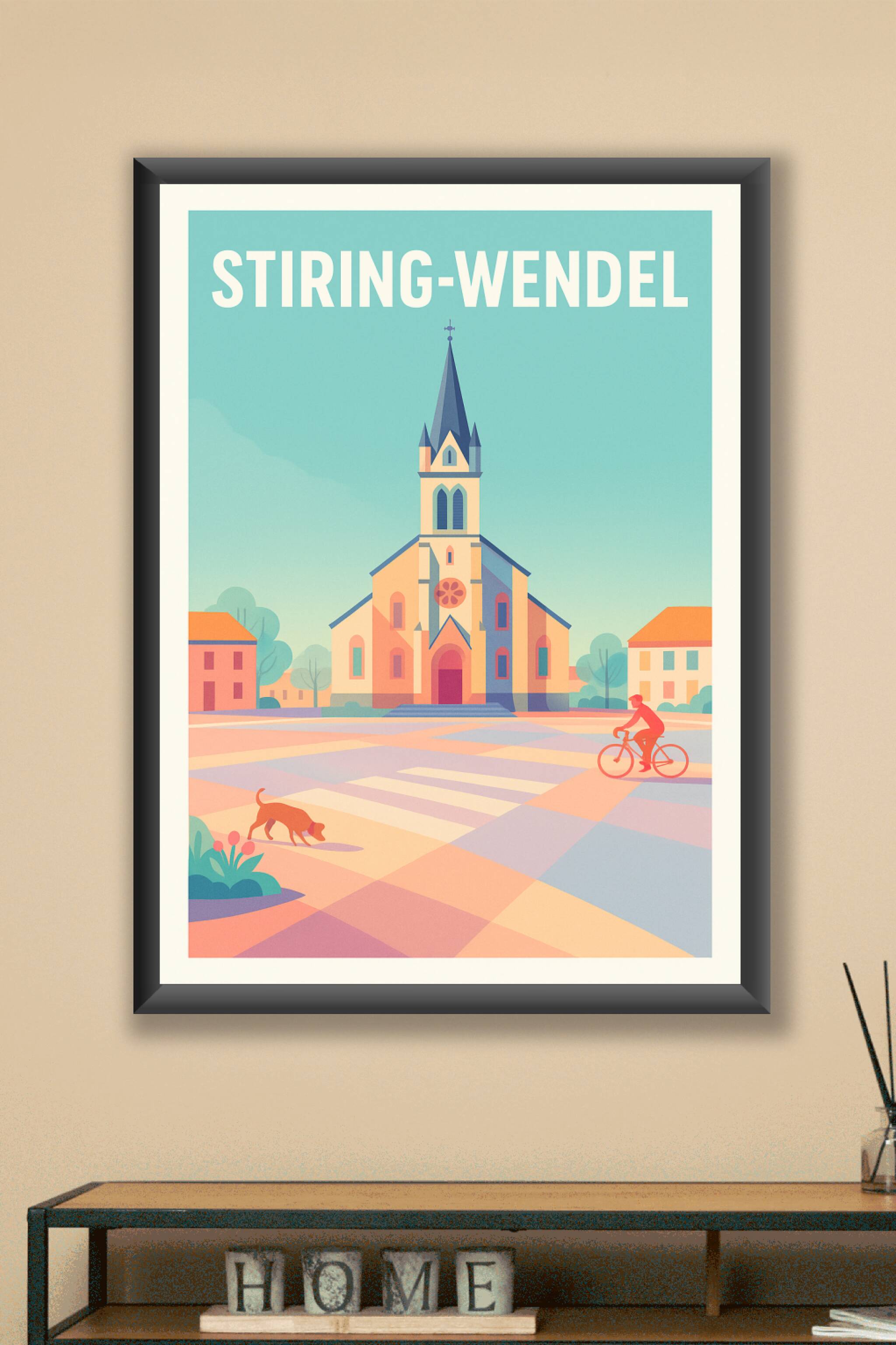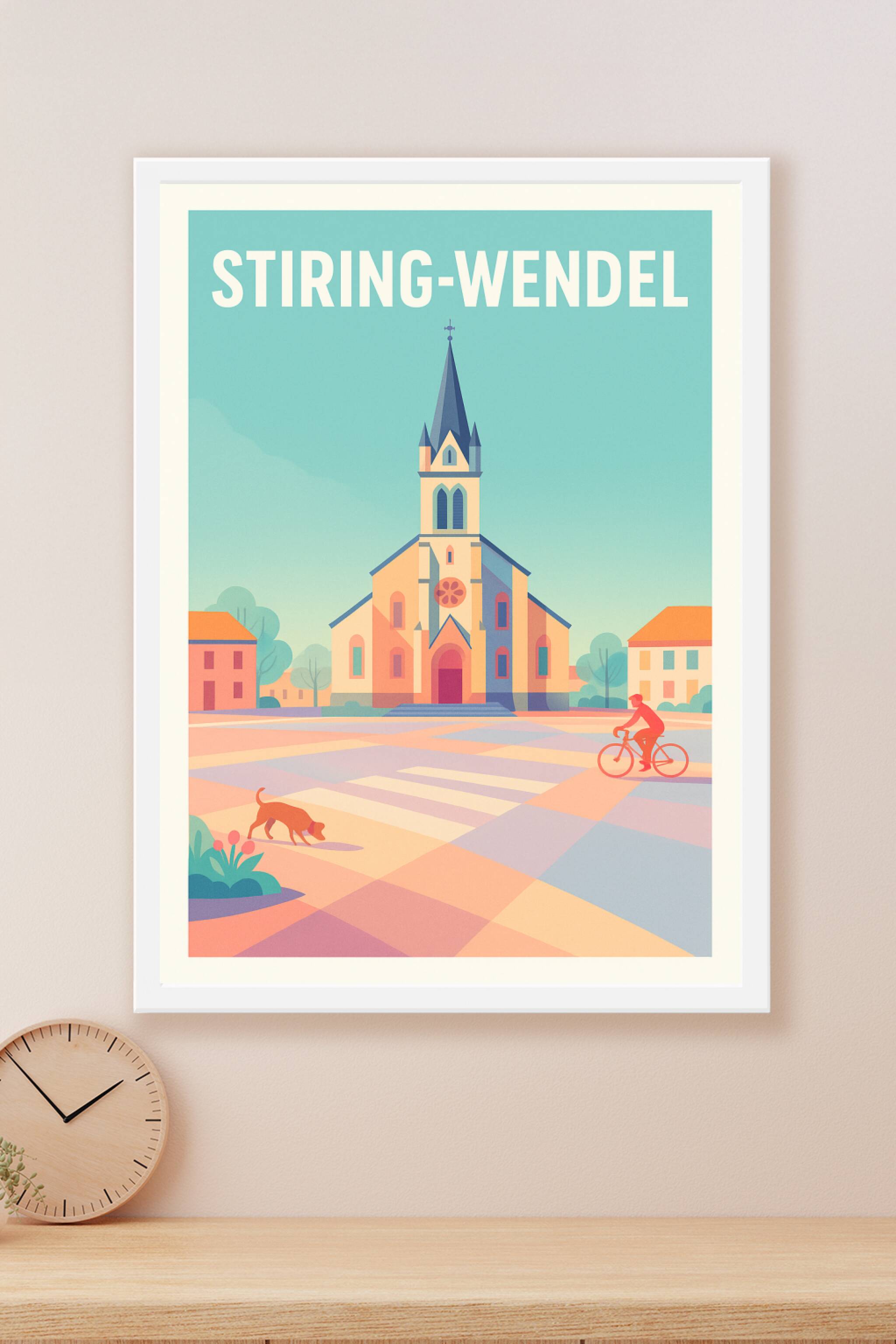 Découvrez le charme tranquille de Stiring-Wendel à travers cette affiche au style doux et pastel, mettant en scène une église majestueuse dans un c...
