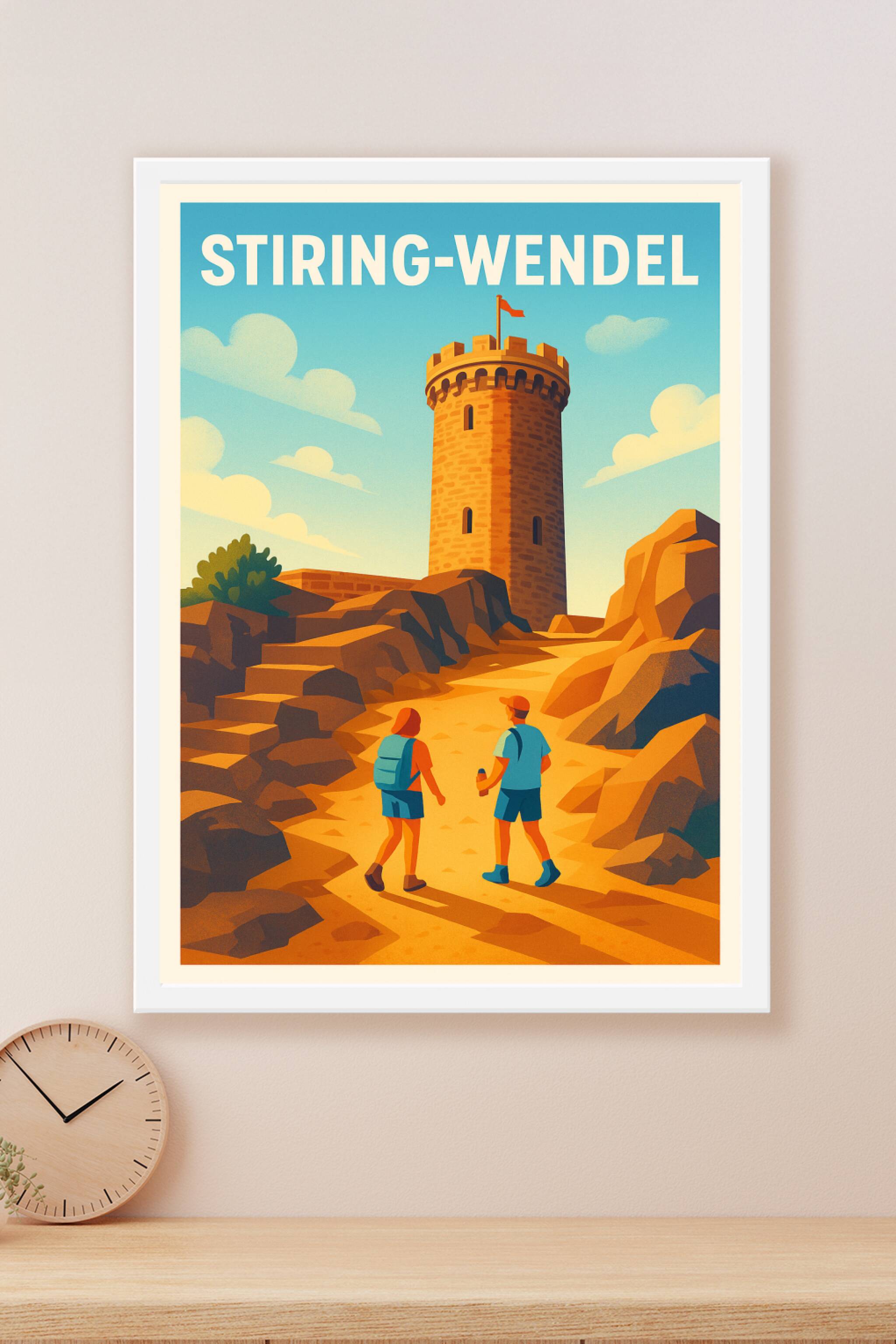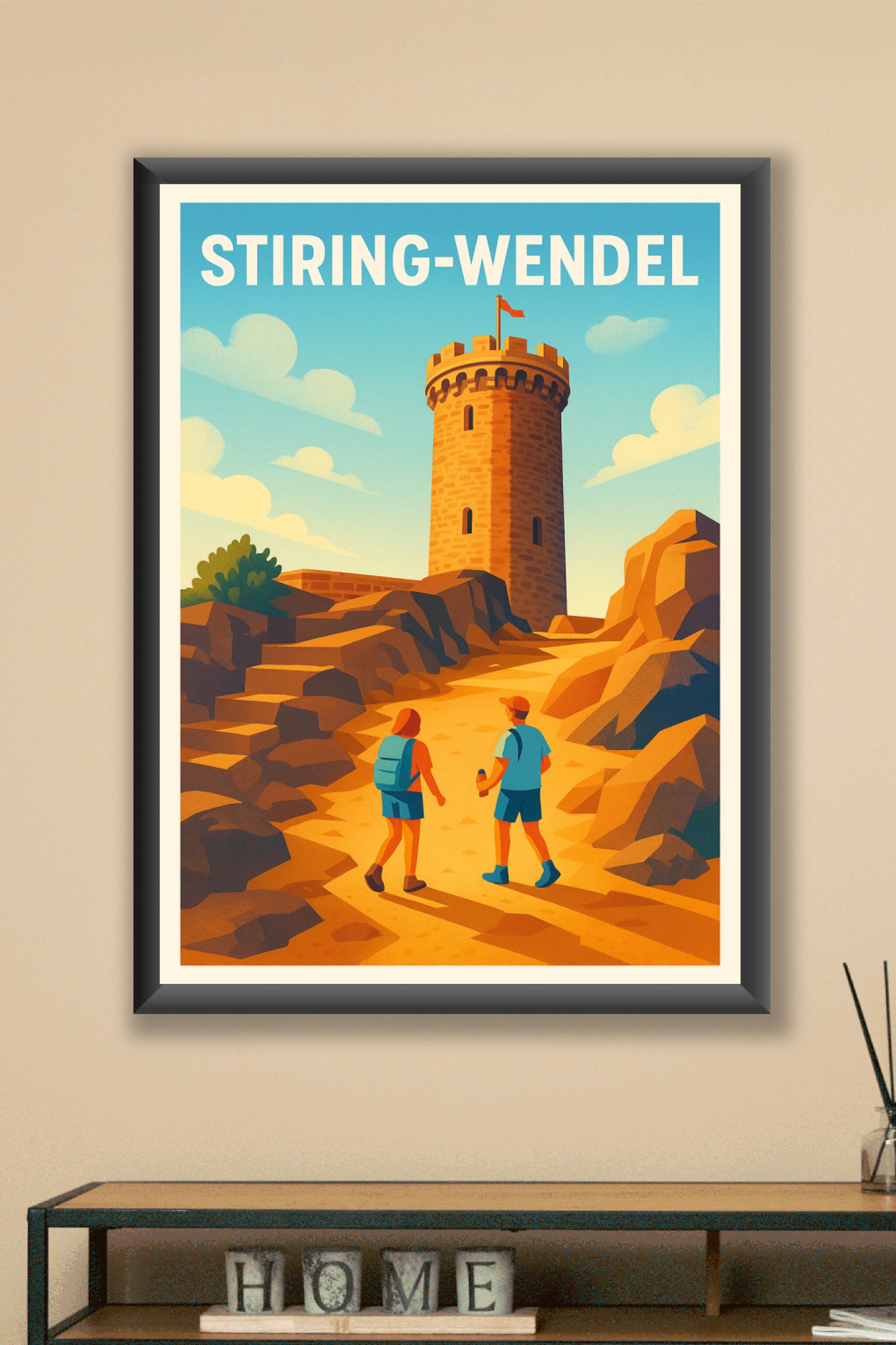 Découvrez la beauté naturelle et l'histoire de Stiring-Wendel avec cette affiche illustrée qui met en scène une promenade vers la tour emblématique...