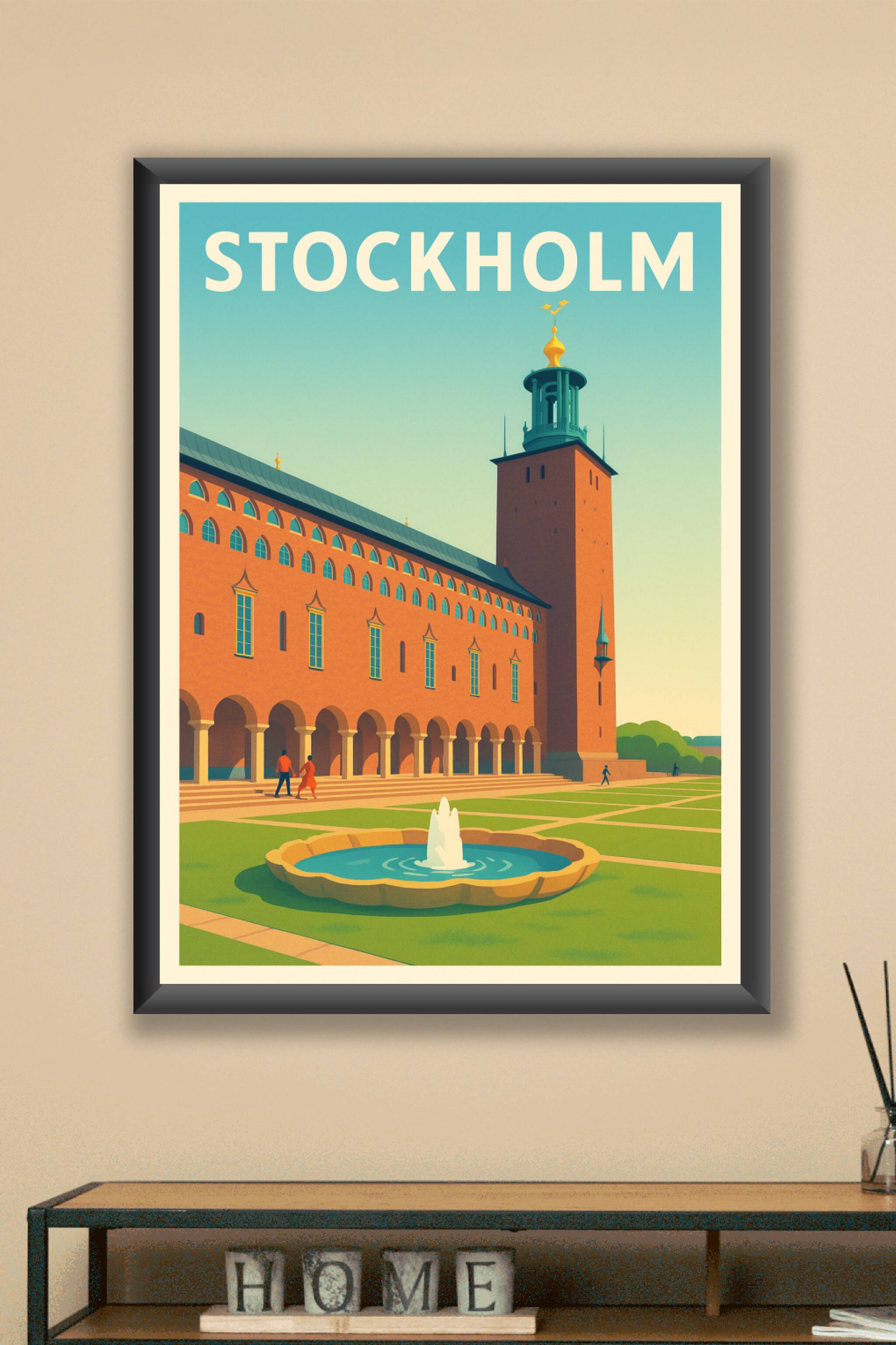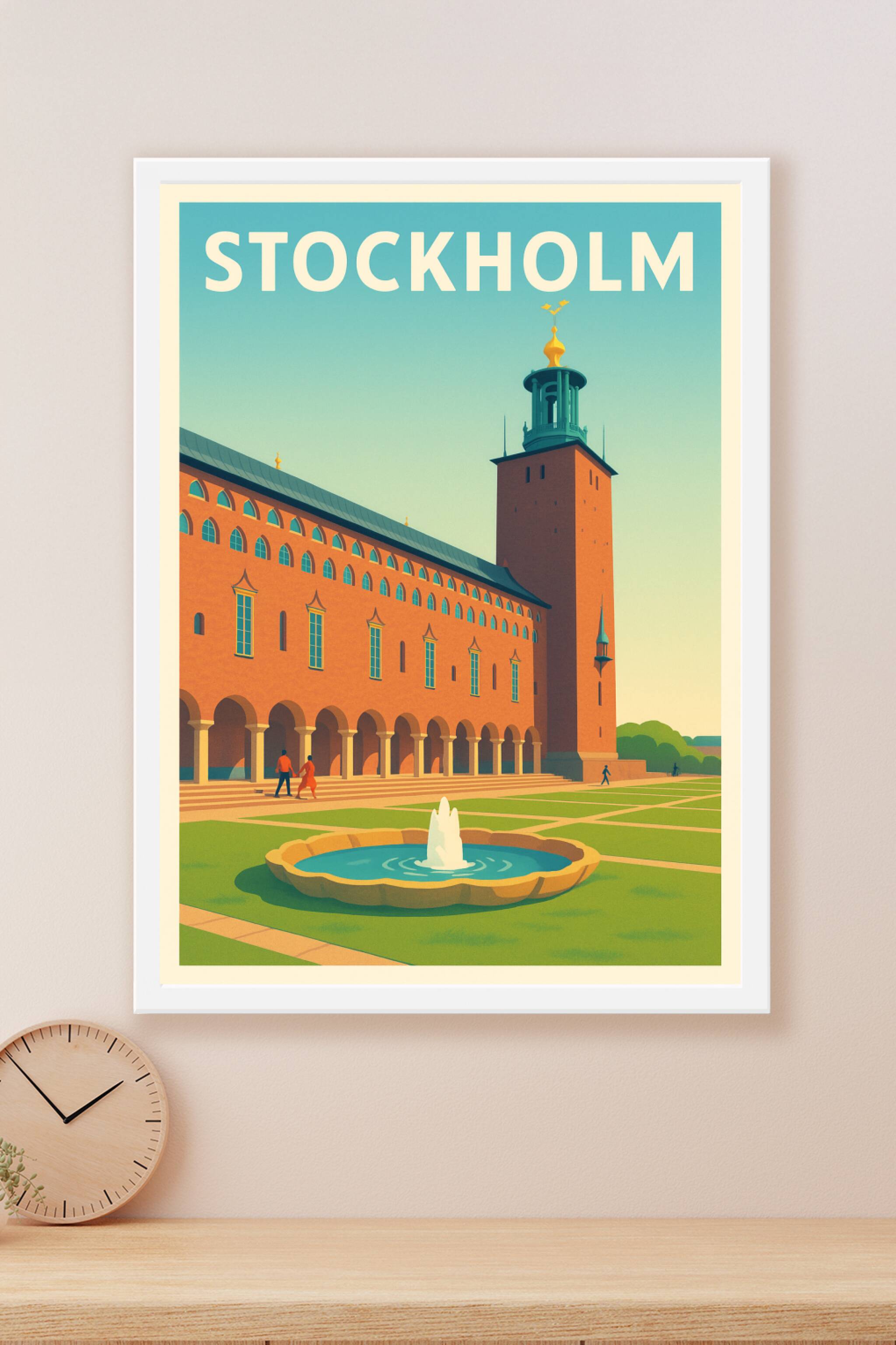 Découvrez la beauté intemporelle de Stockholm à travers cette affiche au style rétro chic mettant en scène l'emblématique hôtel de ville et son jar...