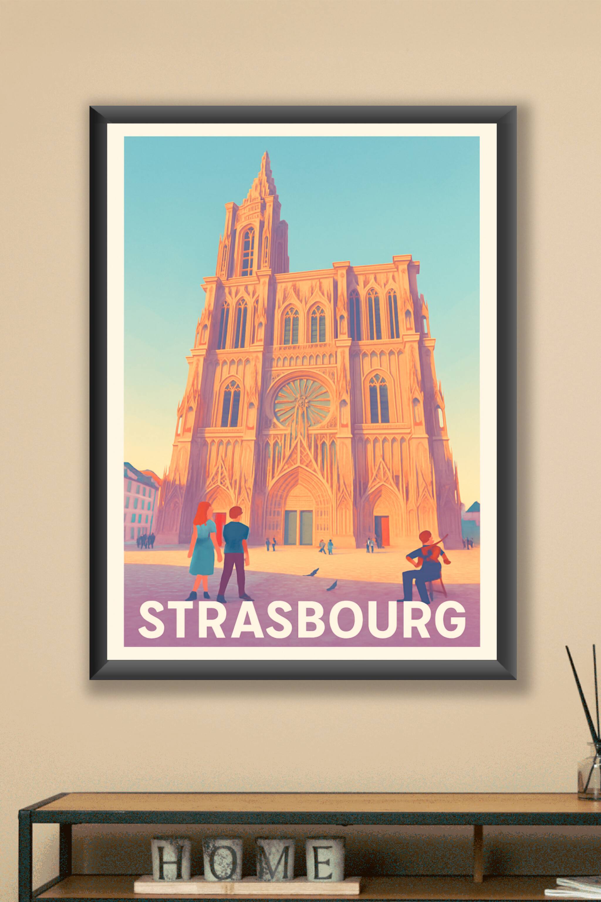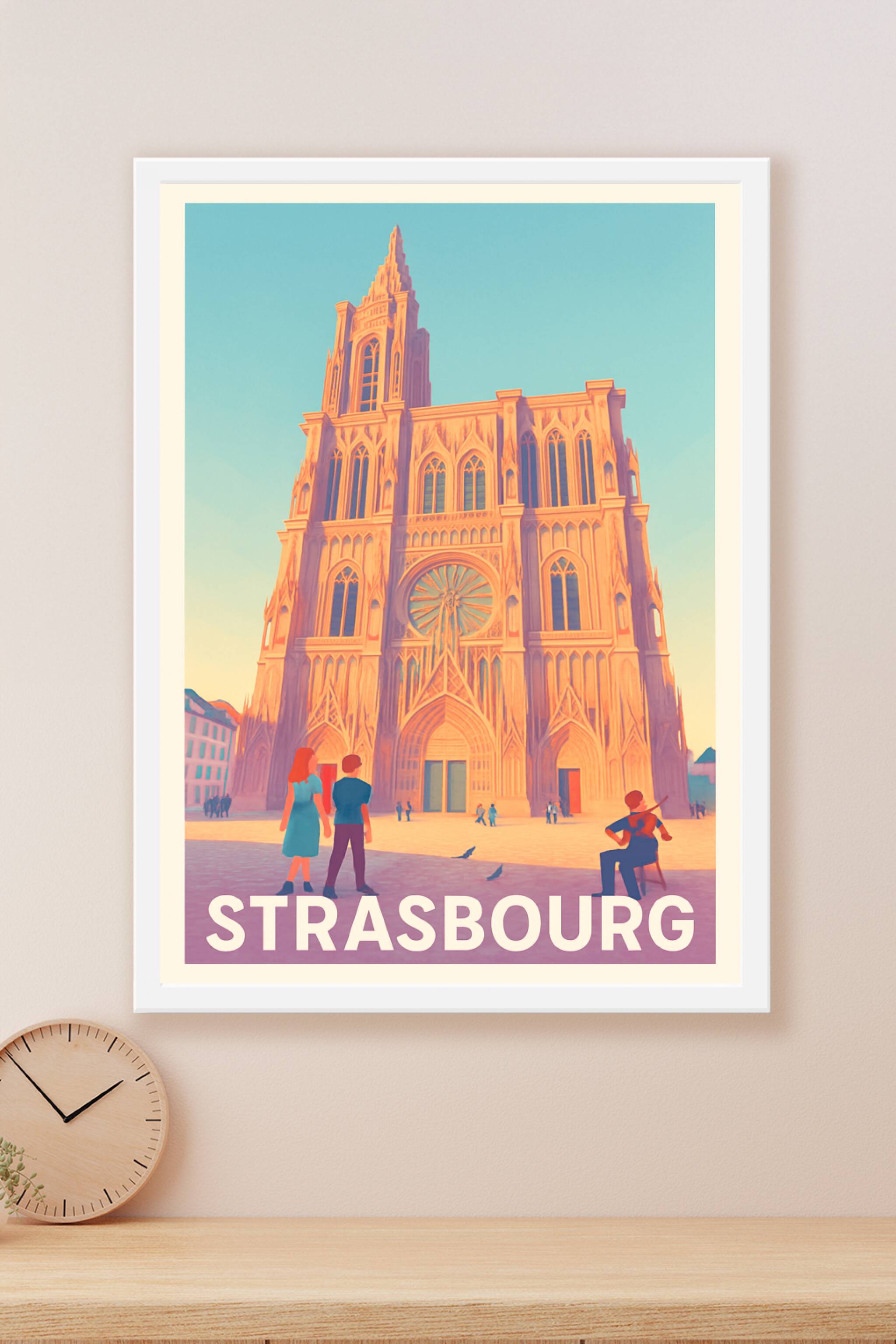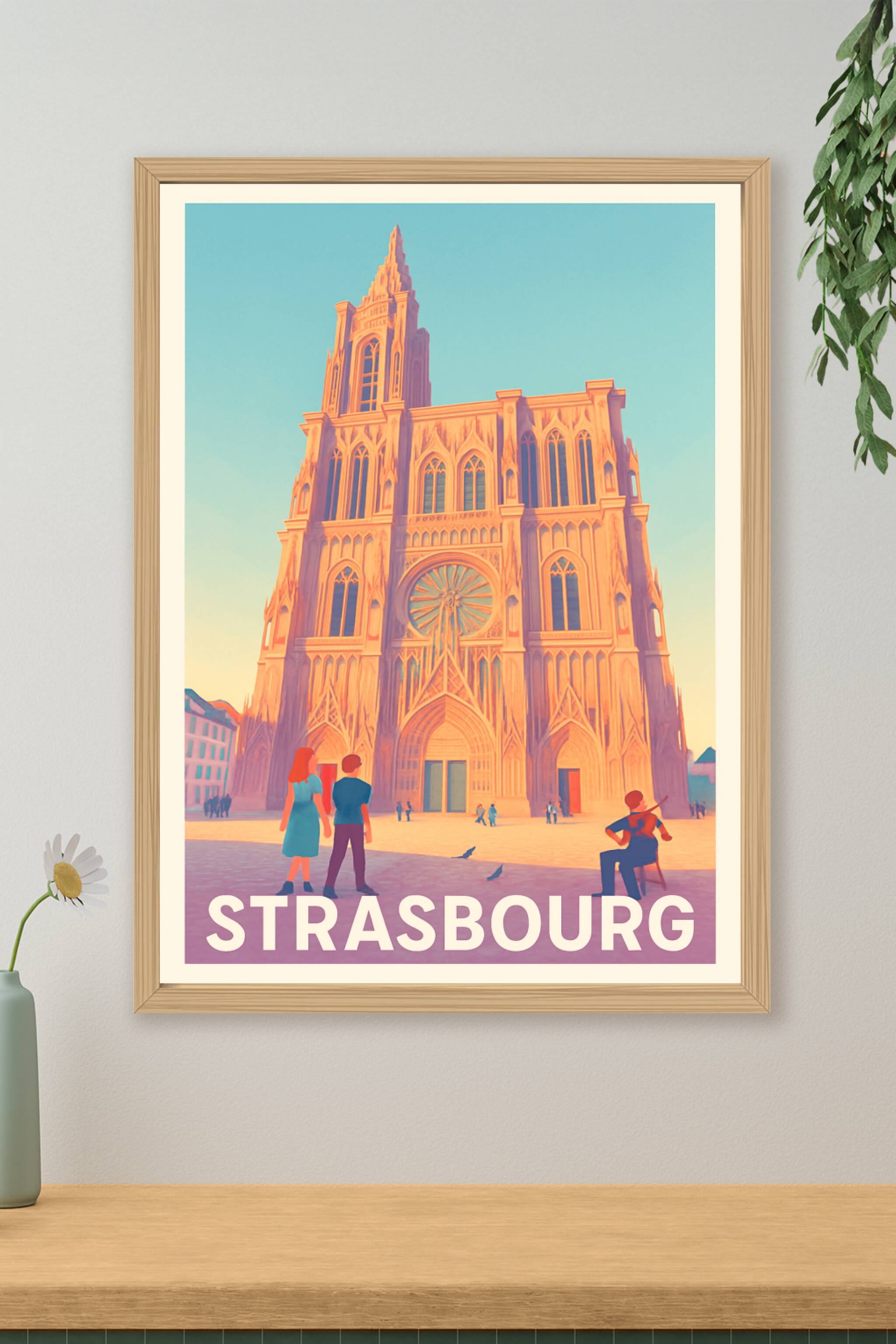 Découvrez la majesté de la cathédrale de Strasbourg à travers cette affiche au style rétro et chaleureux qui capte l'atmosphère unique de la place....