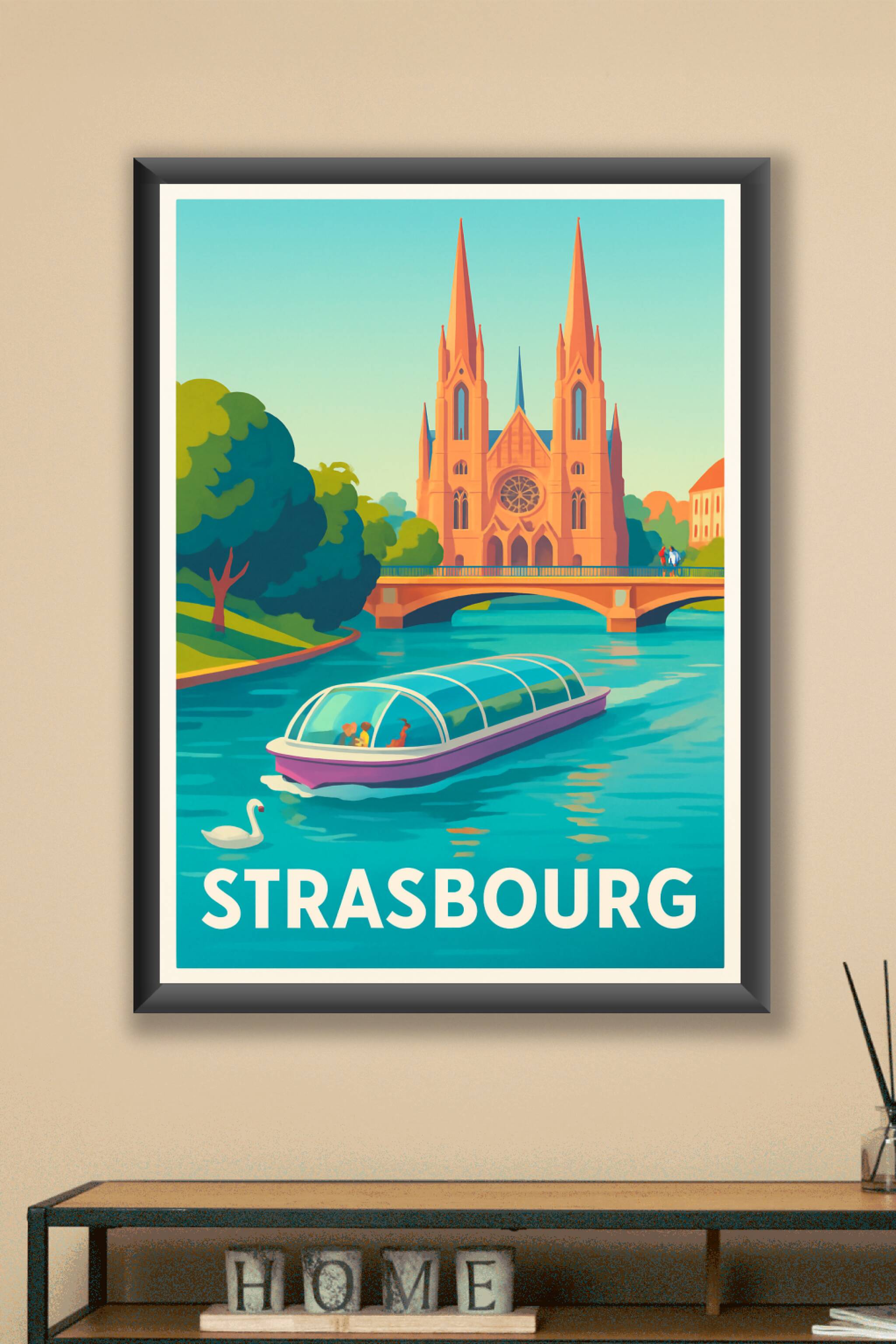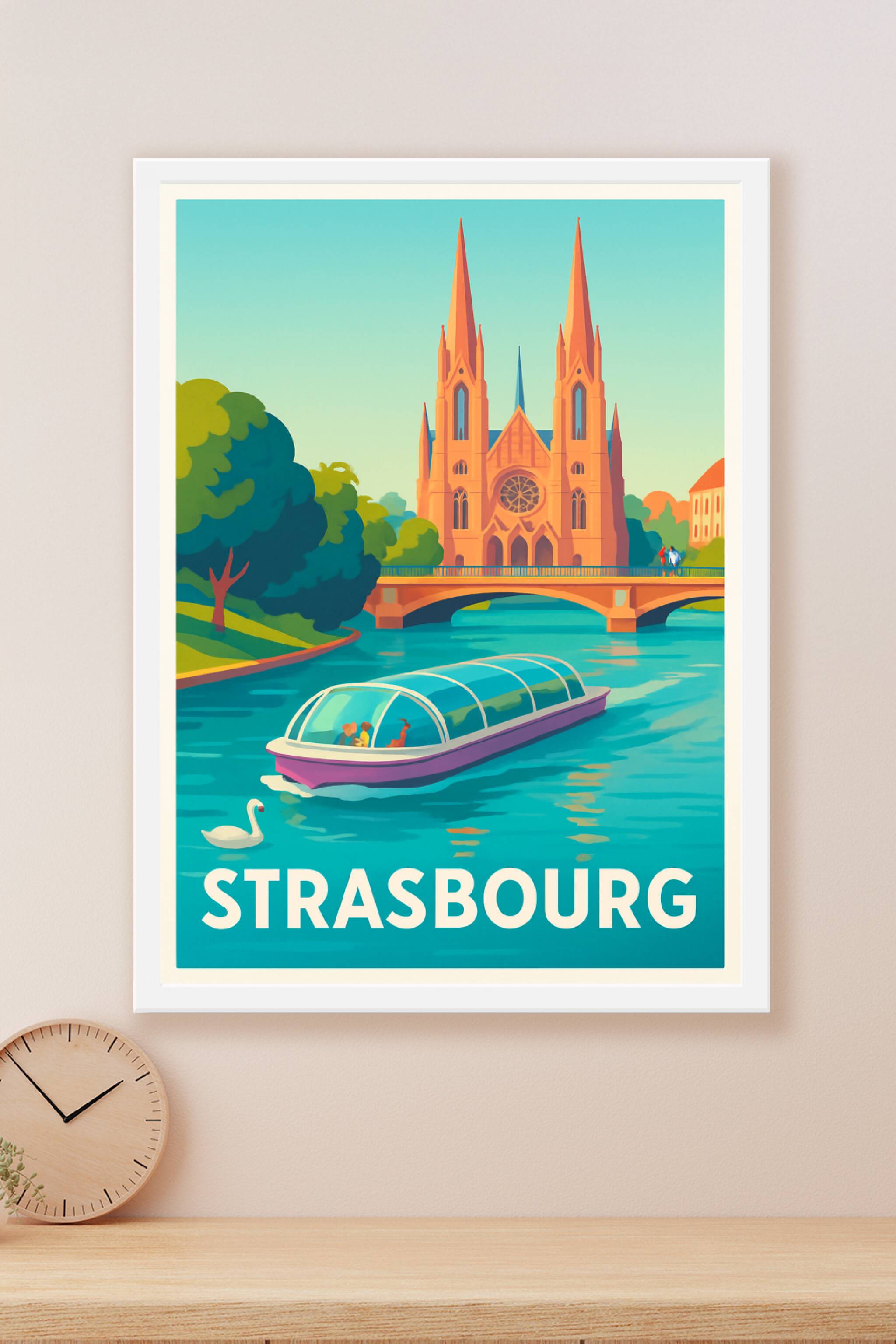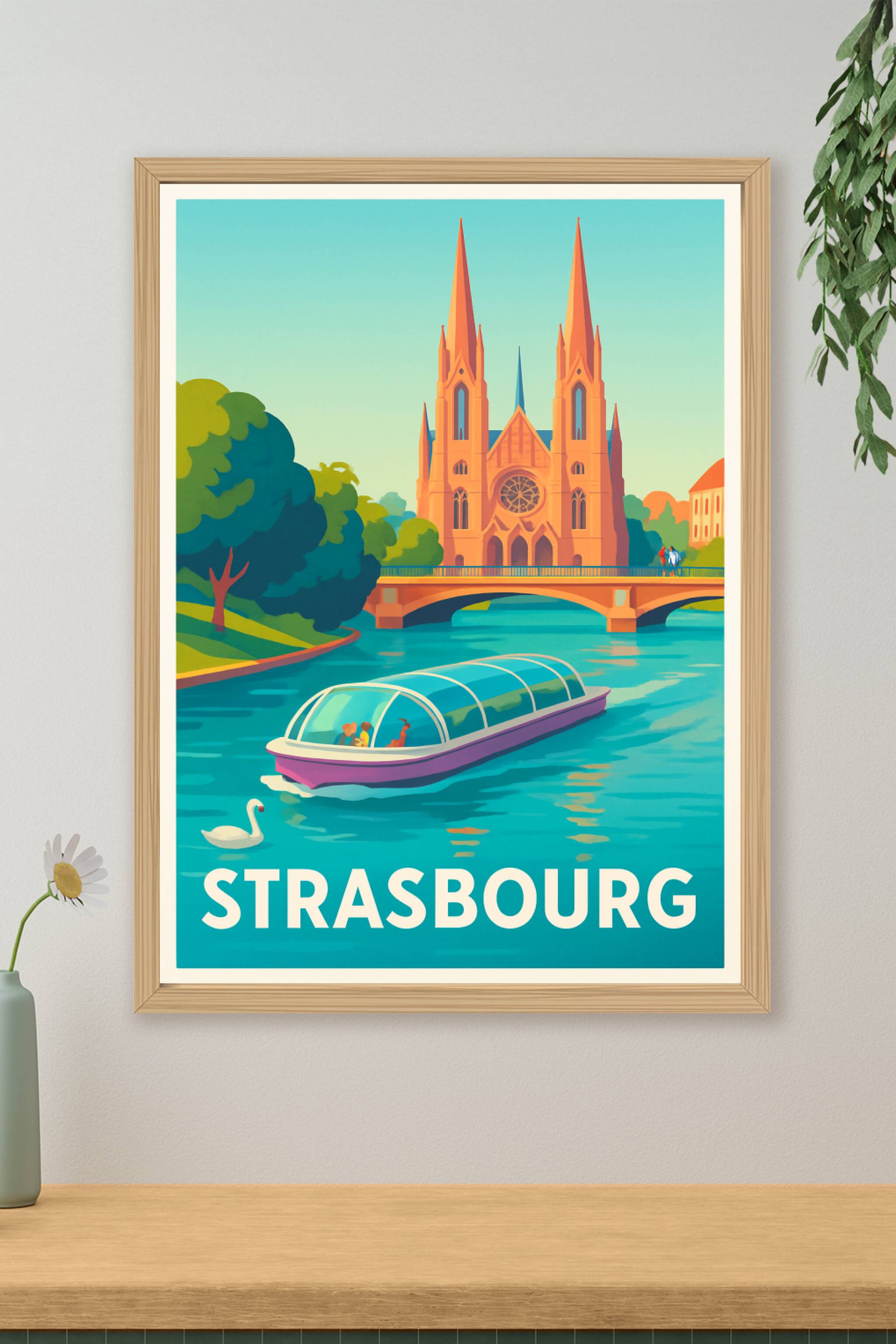Découvrez la douceur de vivre strasbourgeoise avec cette affiche charmante illustrant une croisière paisible sur la rivière Ill, face à la célèbre ...