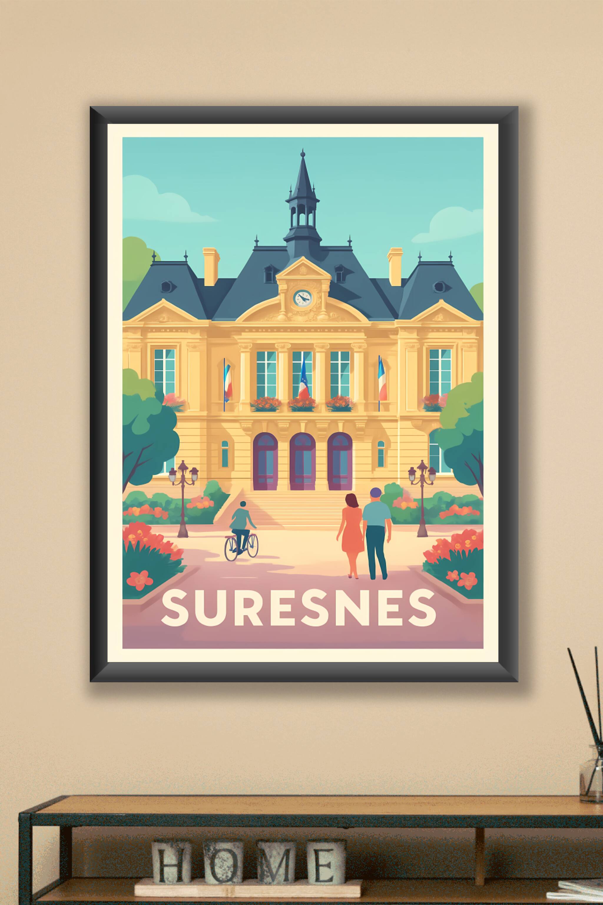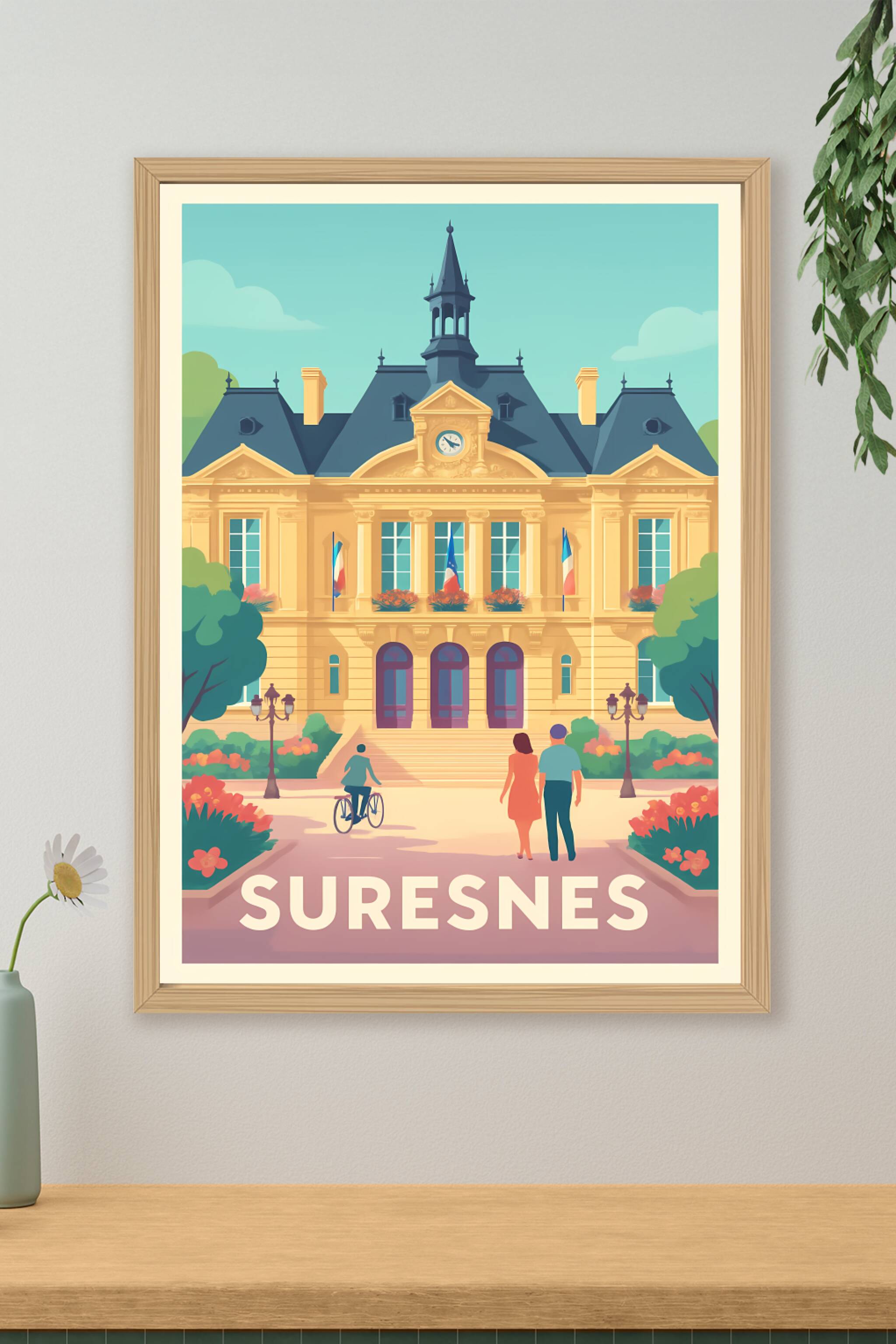 Découvrez la douceur de vivre de Suresnes avec cette affiche illustrée mettant en avant l'architecture majestueuse de la mairie, baignée de lumière...