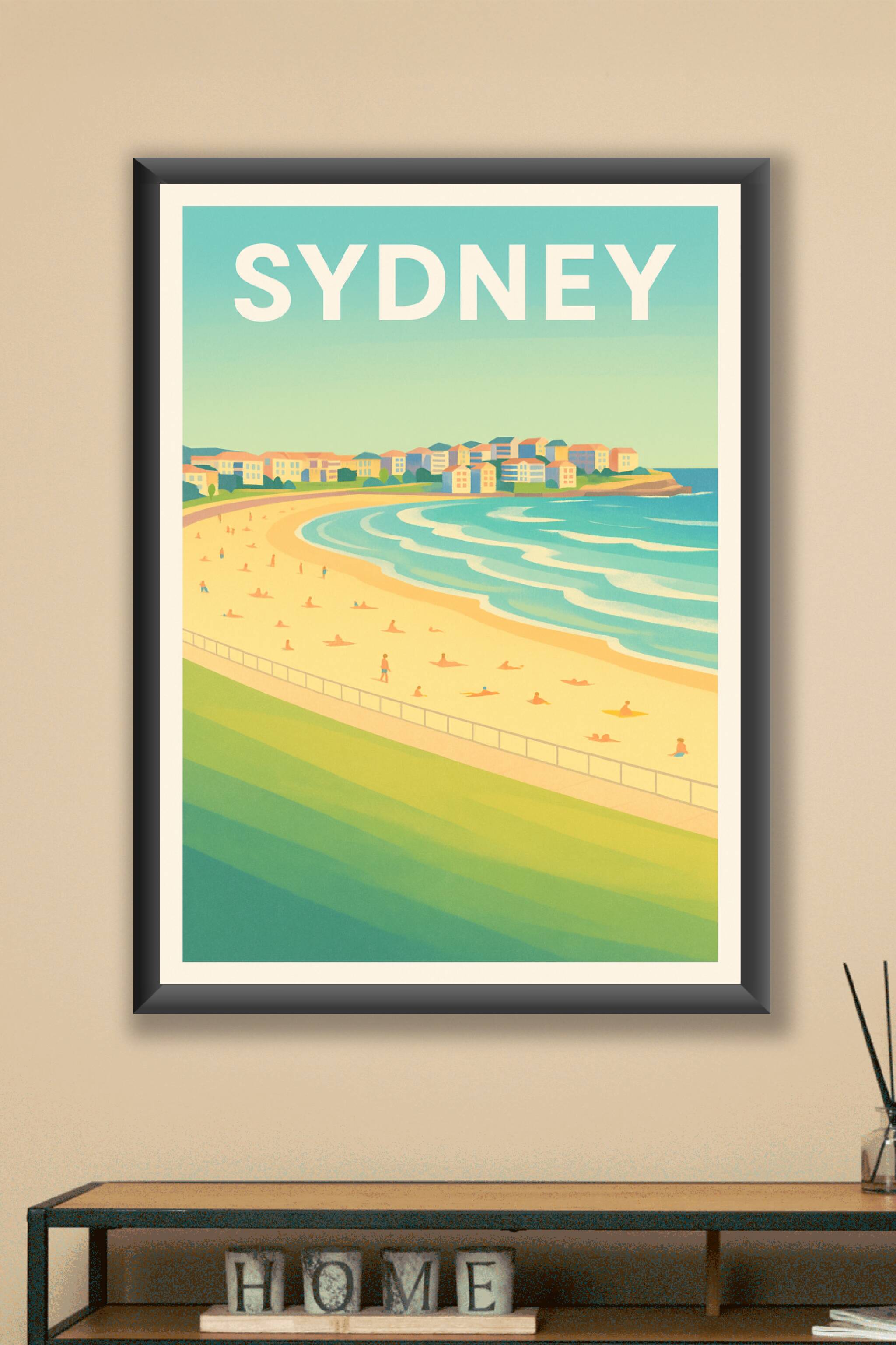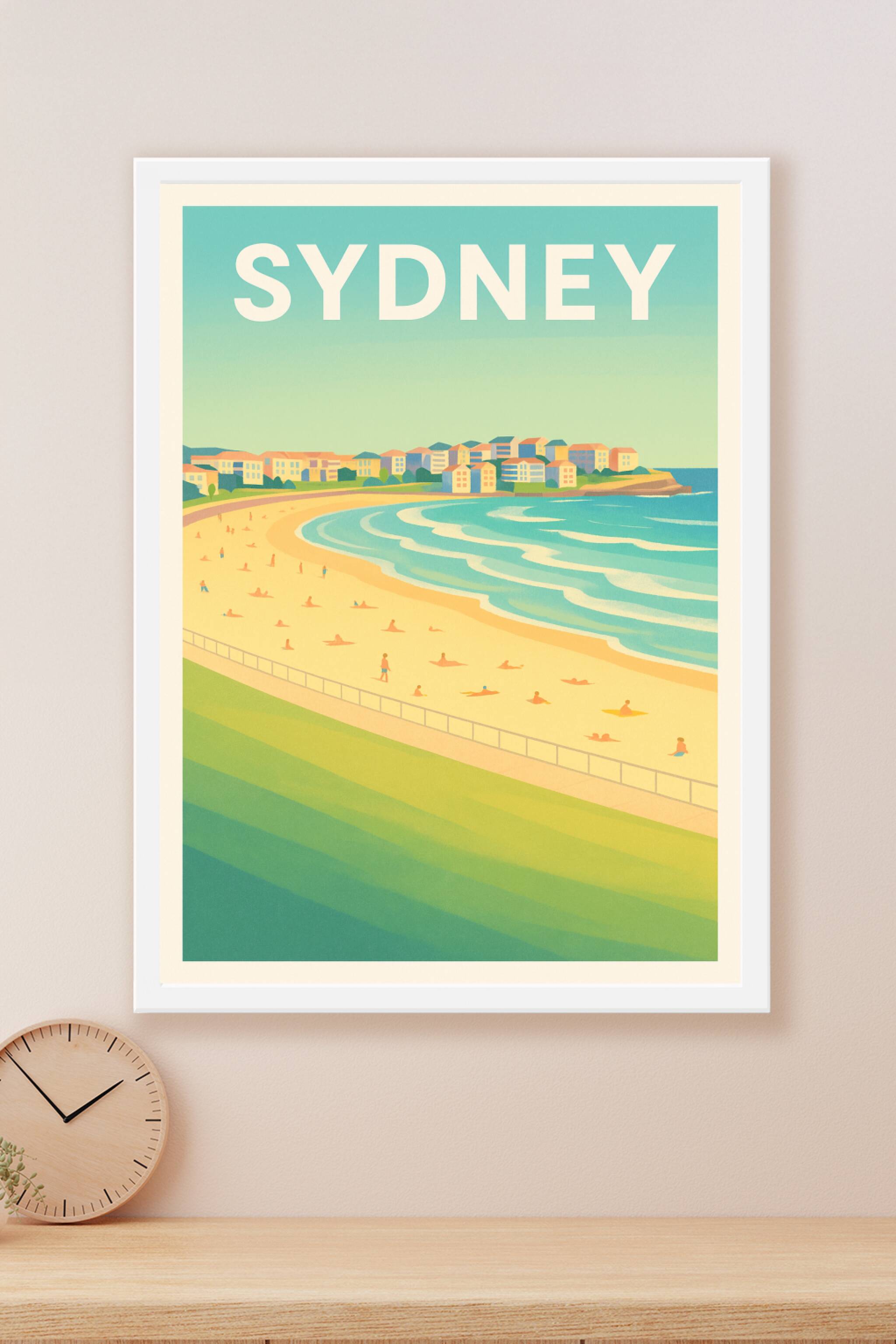 Découvrez l'ambiance apaisante des plages de Sydney avec cette affiche au style rétro et coloré qui capture l'essence des journées baignées de sole...