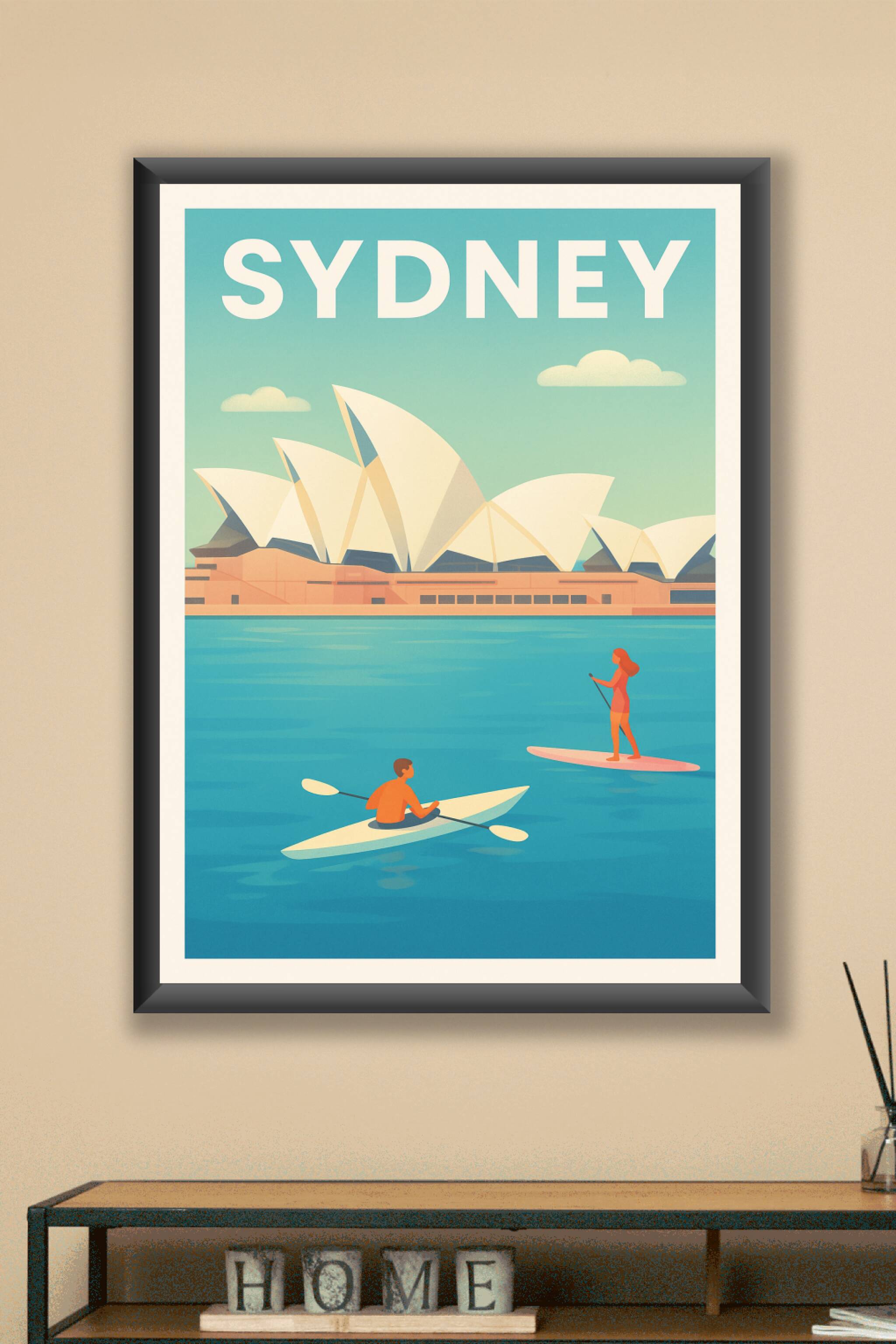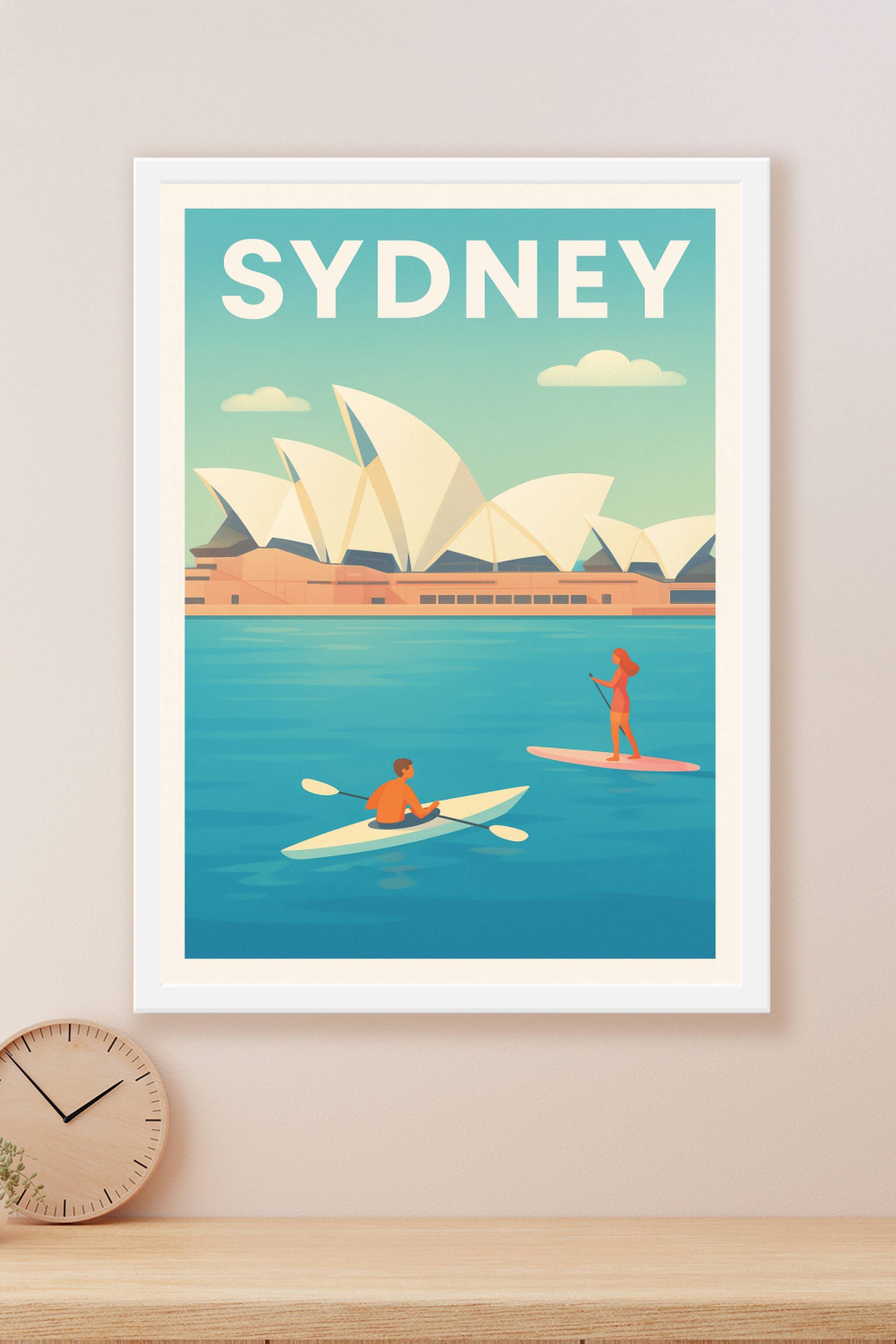 Découvrez toute la beauté emblématique de Sydney avec cette affiche vintage inspirée par l'architecture unique de l'Opéra de Sydney, mise en valeur dans un cadre nautique apaisant. Le poster capture une scène de loisirs sur l'eau où canoë et paddle se côtoient sous un ciel clair et lumineux. Imprimée en tirage "Fine Art" sur un papier 305g coton de haute qualité, cette affiche offre une finition irréprochable et une longévité exceptionnelle. Disponible en plusieurs formats allant de A1 à A4 et proposée avec ou sans cadre, cette création fine art saura apporter une touche de lumière australienne élégante à votre décoration intérieure. Sublimez vos murs avec ce poster de qualité premium, un hommage parfait à Sydney et à ses eaux calmes.
