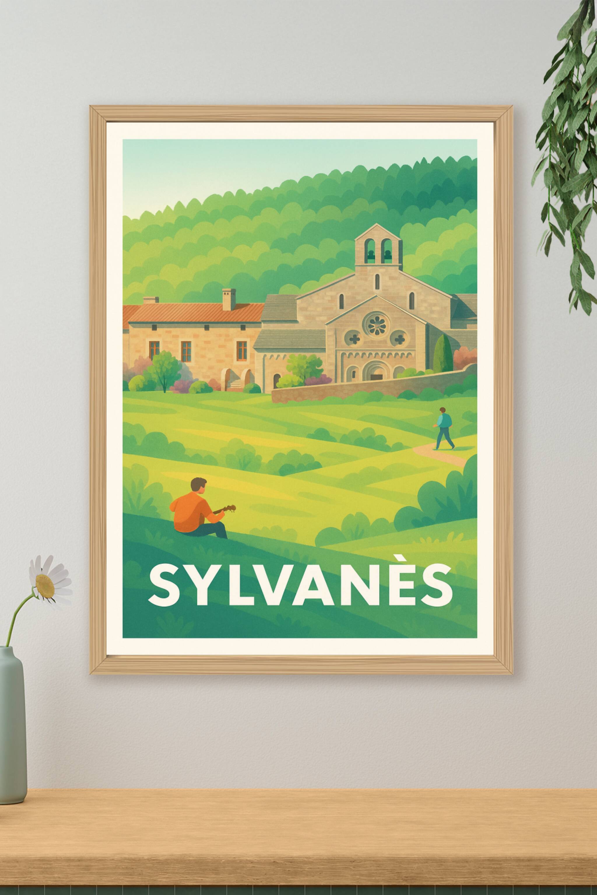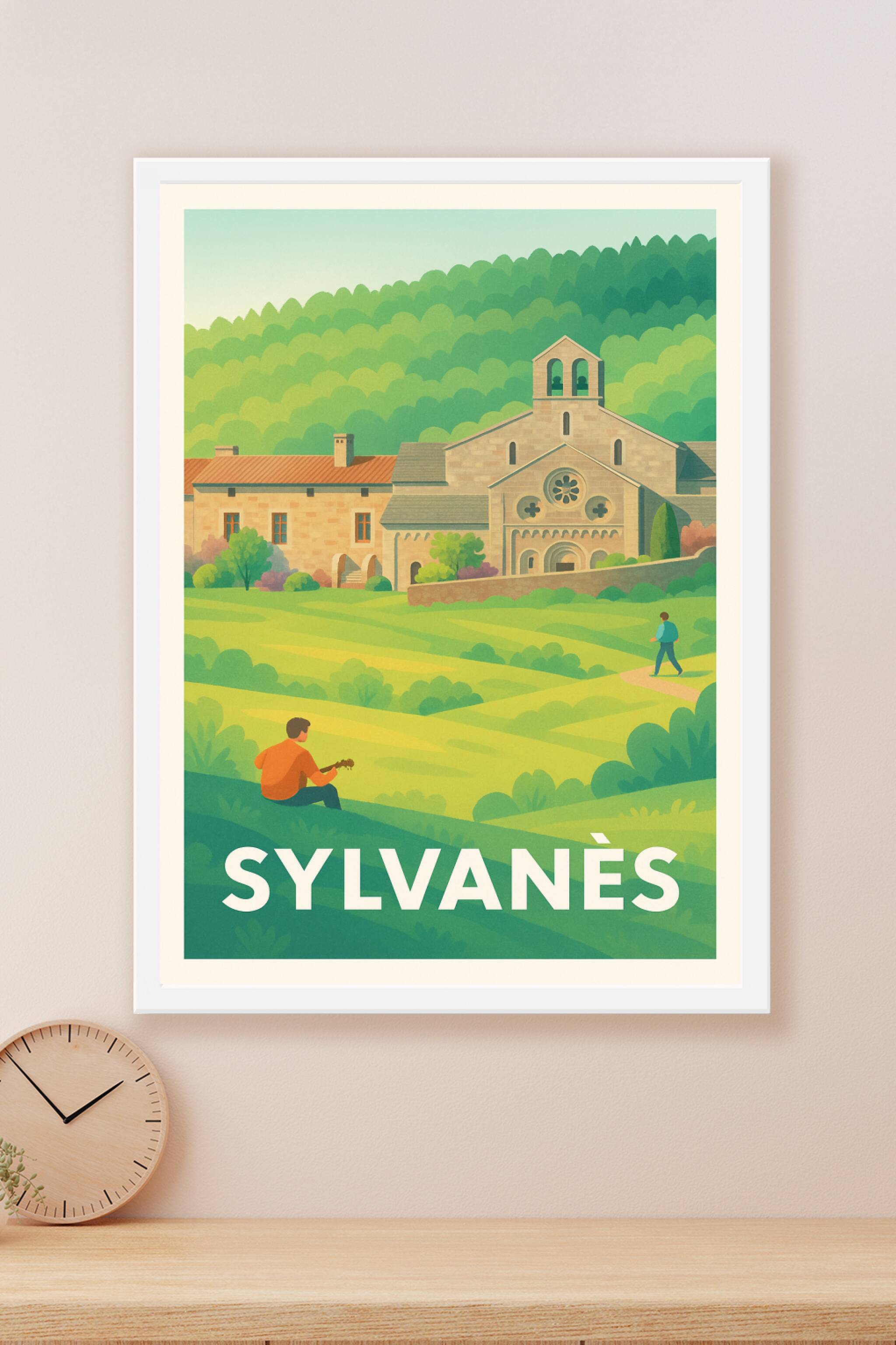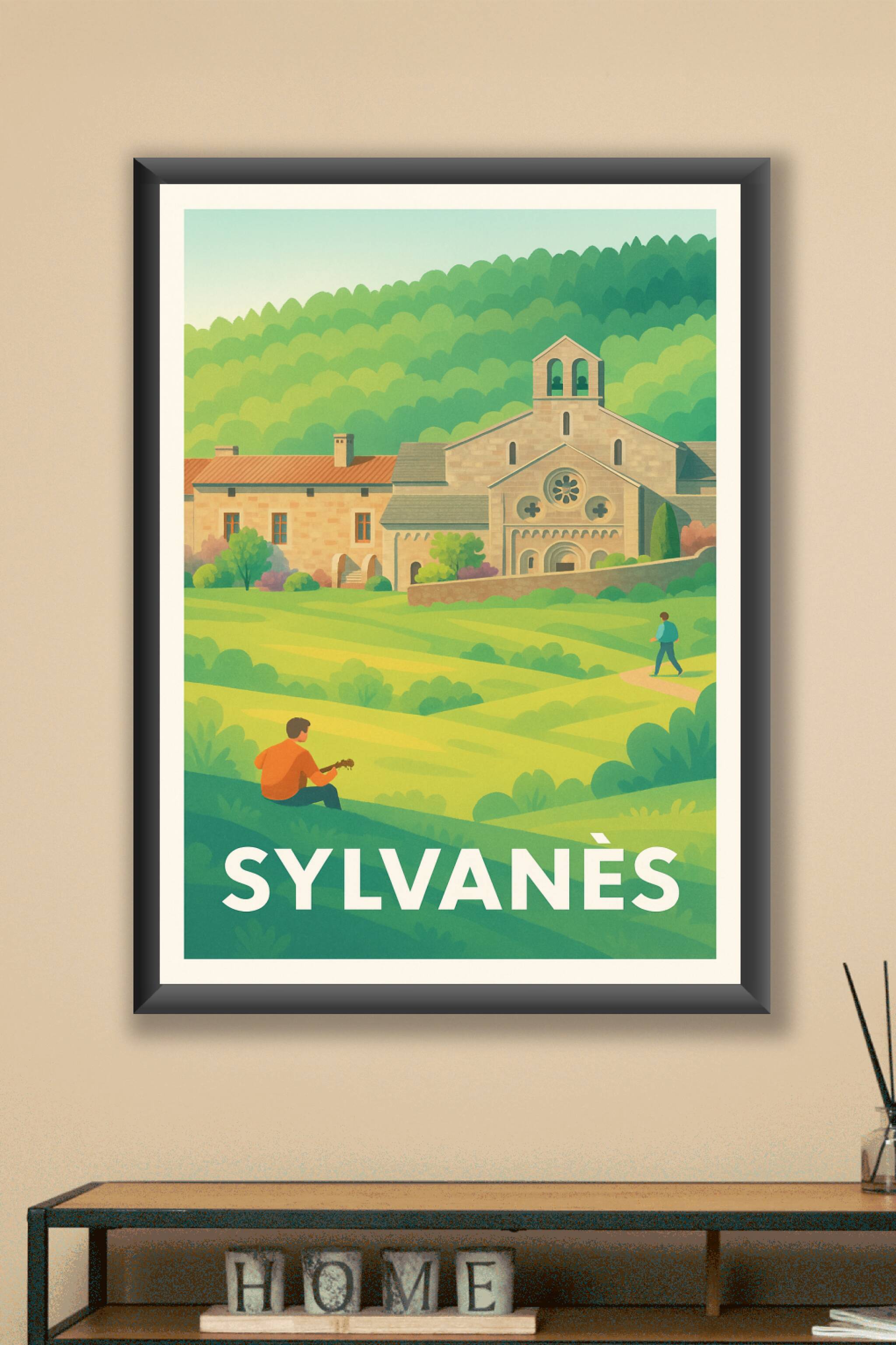 Découvrez l'atmosphère paisible et verdoyante de Sylvanès avec cette affiche illustrée présentant l'abbaye emblématique nichée au cœur de paysages ...