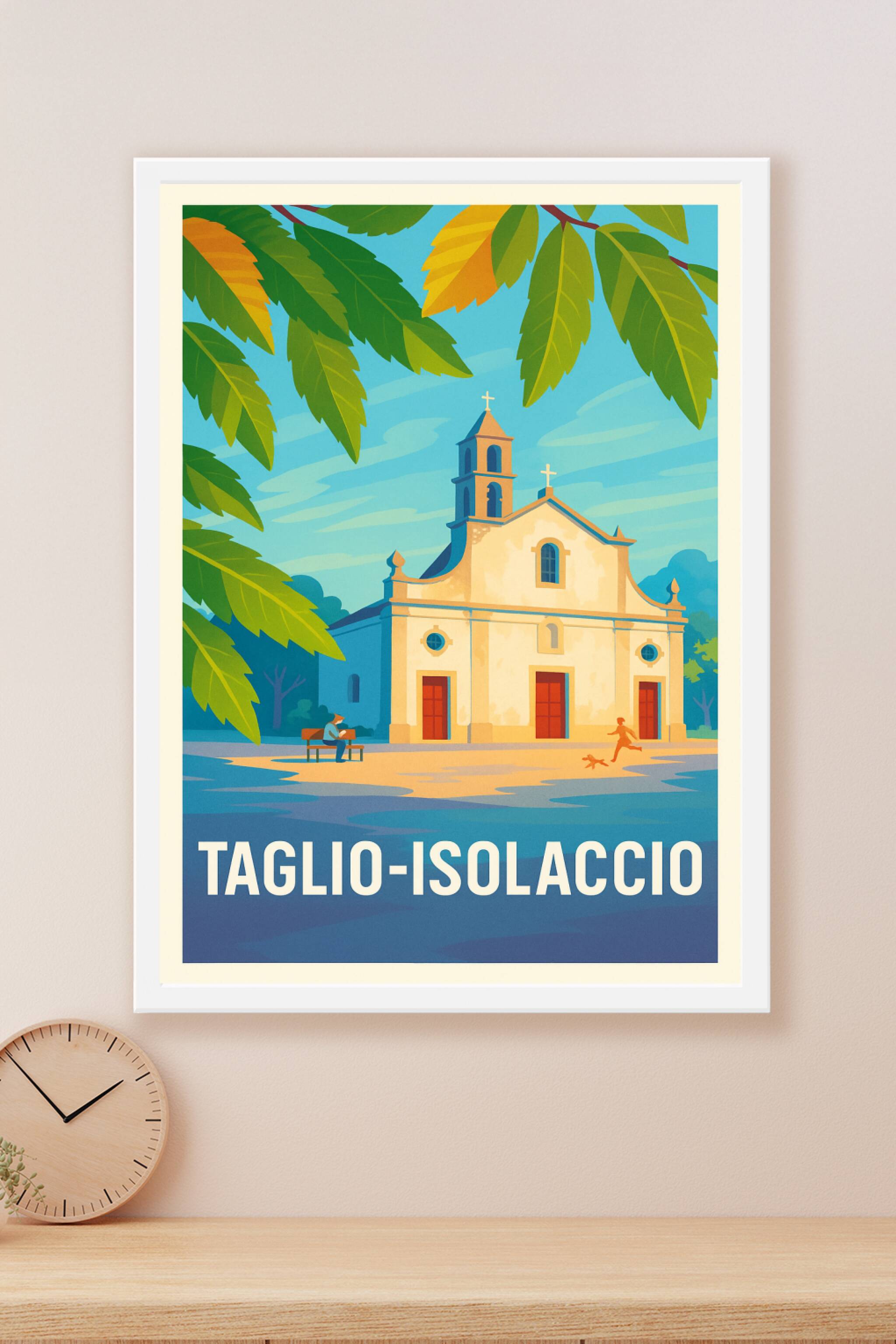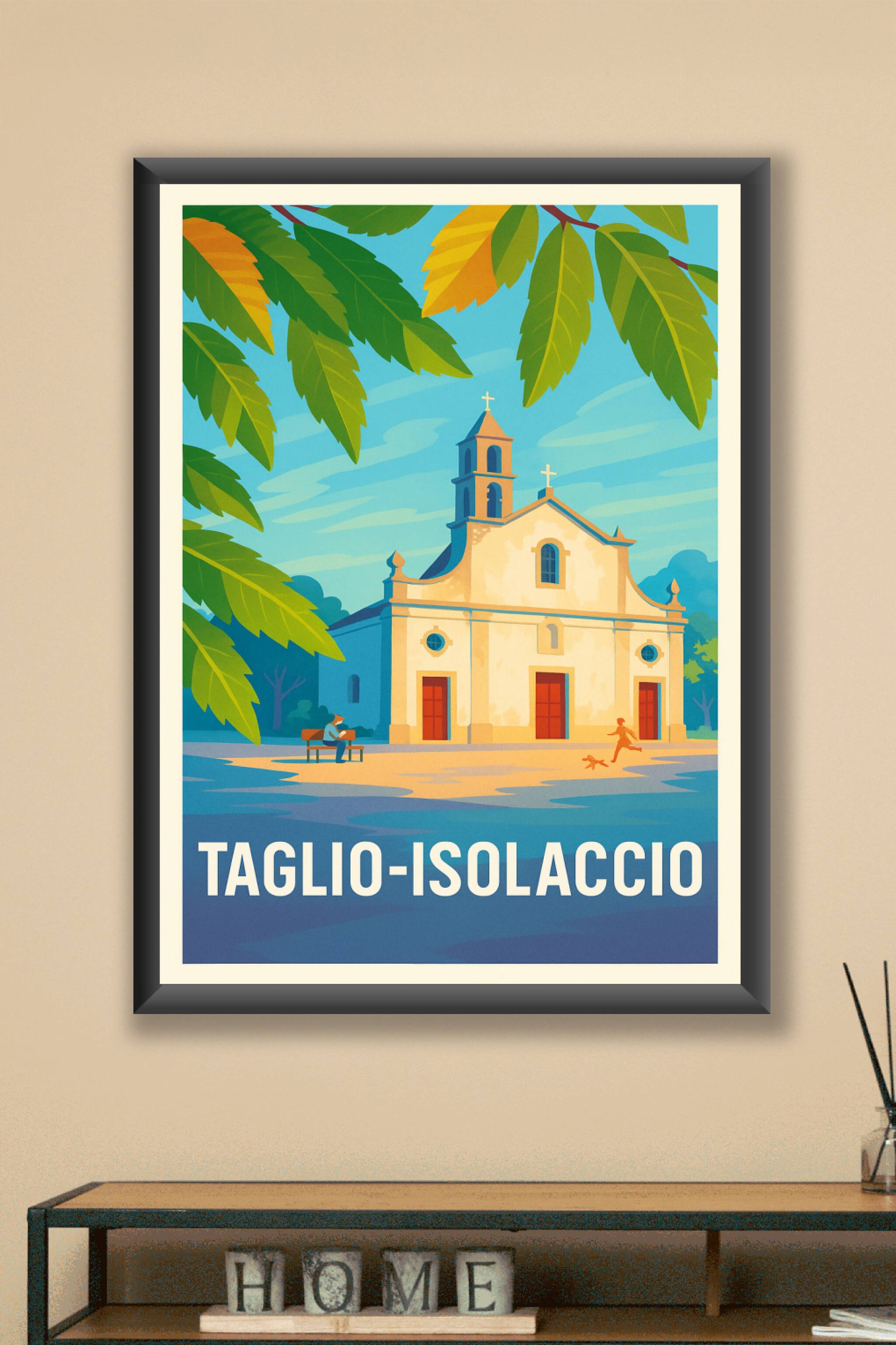 Découvrez la douceur de vivre de Taglio-Isolaccio avec cette affiche illustrée mettant en scène un monument emblématique baigné par la lumière chal...