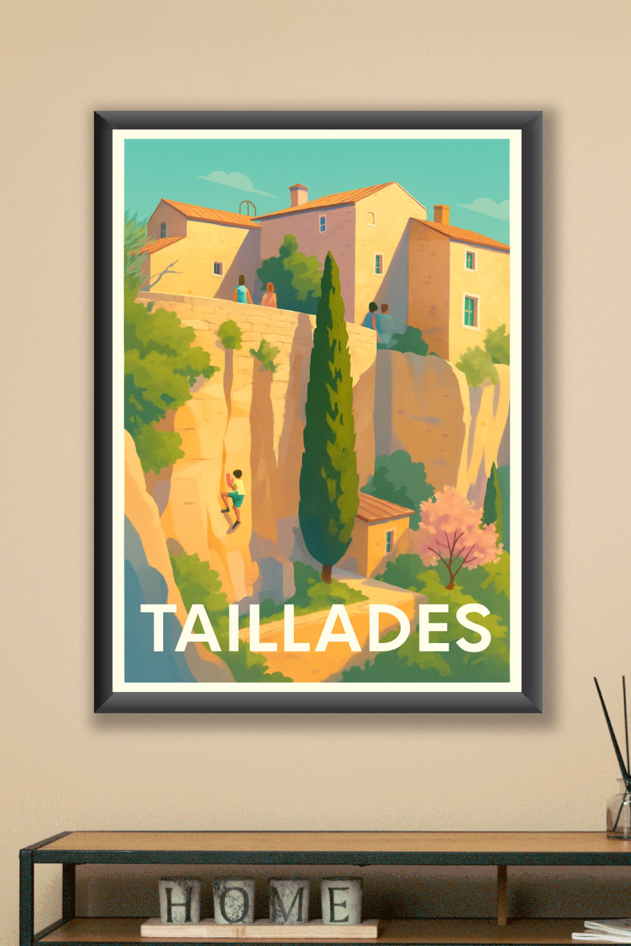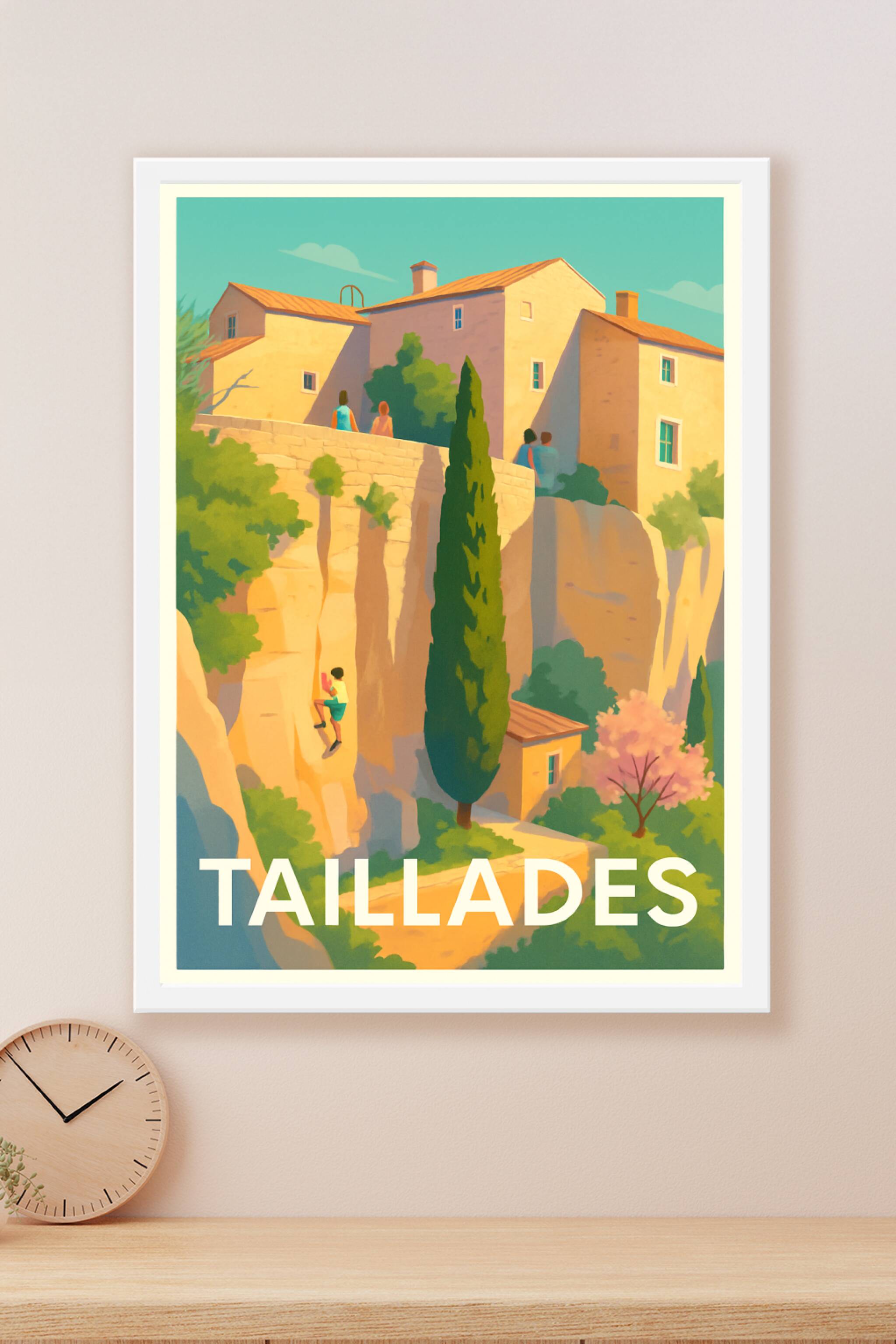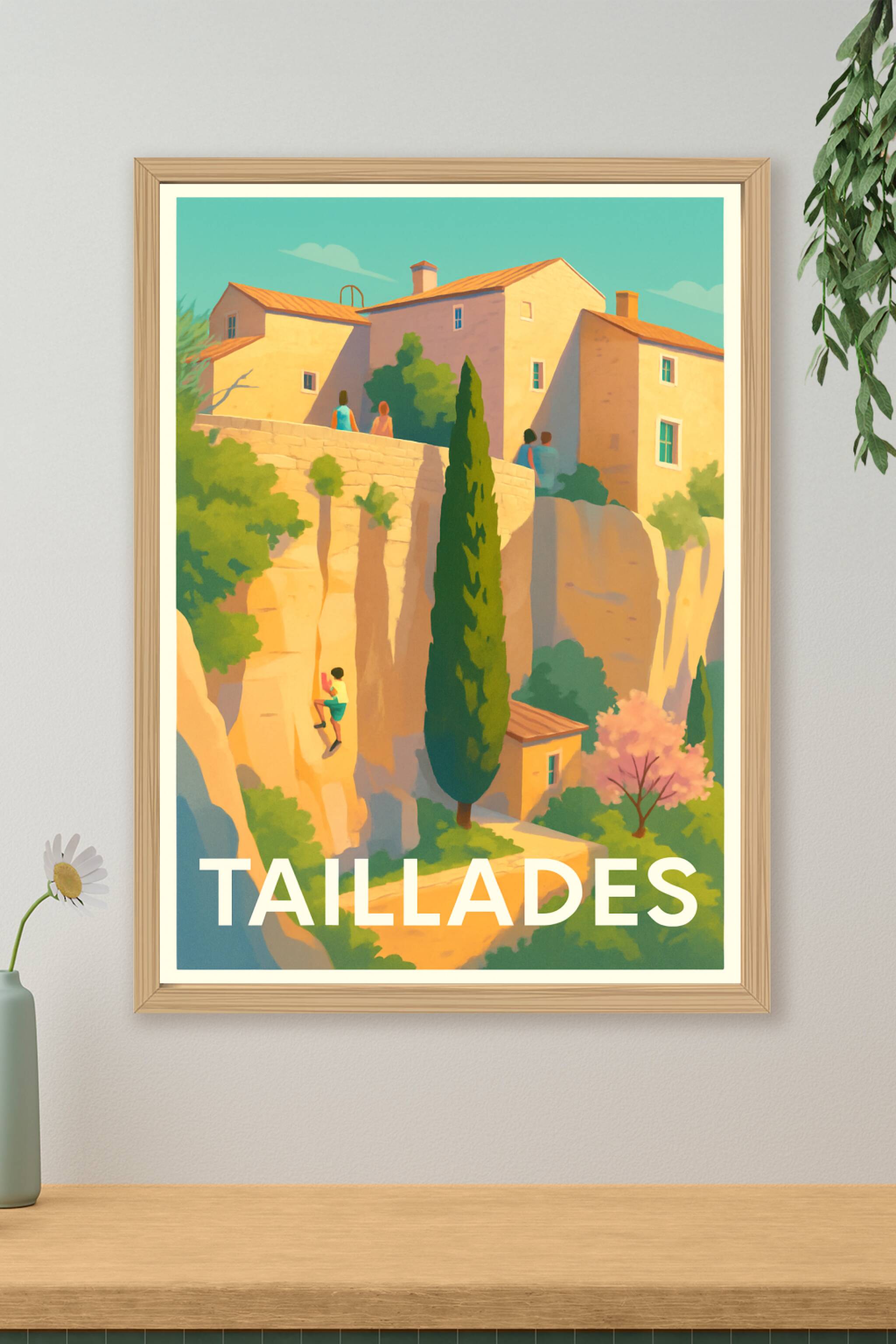 Découvrez l'ambiance chaleureuse et pittoresque de Taillades à travers cette affiche au style illustratif unique. Ce poster met en lumière les maisons en pierre baignées de lumière dorée, les paysages verdoyants et l'art de vivre typique de cette belle région provençale. Imprimé en tirage "Fine Art" sur papier 305g coton, il garantit une qualité d'impression supérieure avec des couleurs éclatantes et une durabilité optimale. Disponible en plusieurs formats, de A1 à A4, avec ou sans cadre, cette affiche apportera une touche d'authenticité et de douceur à votre décoration intérieure. Parfait pour les amateurs d'art et de paysages méditerranéens, ce poster est une invitation au voyage et à la découverte, à offrir ou à s'offrir.