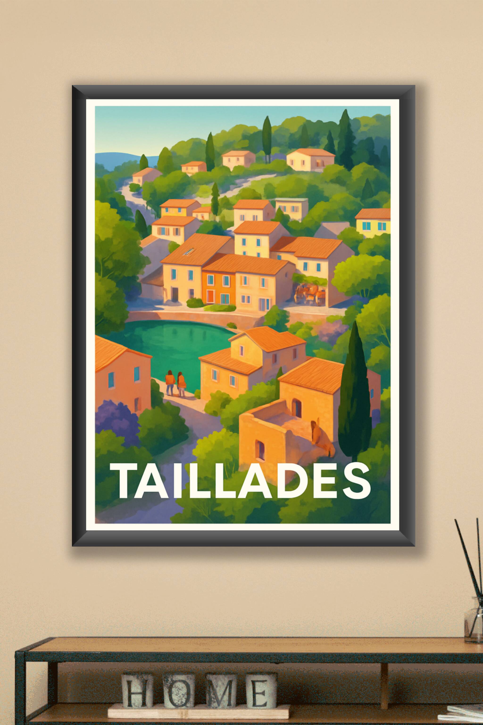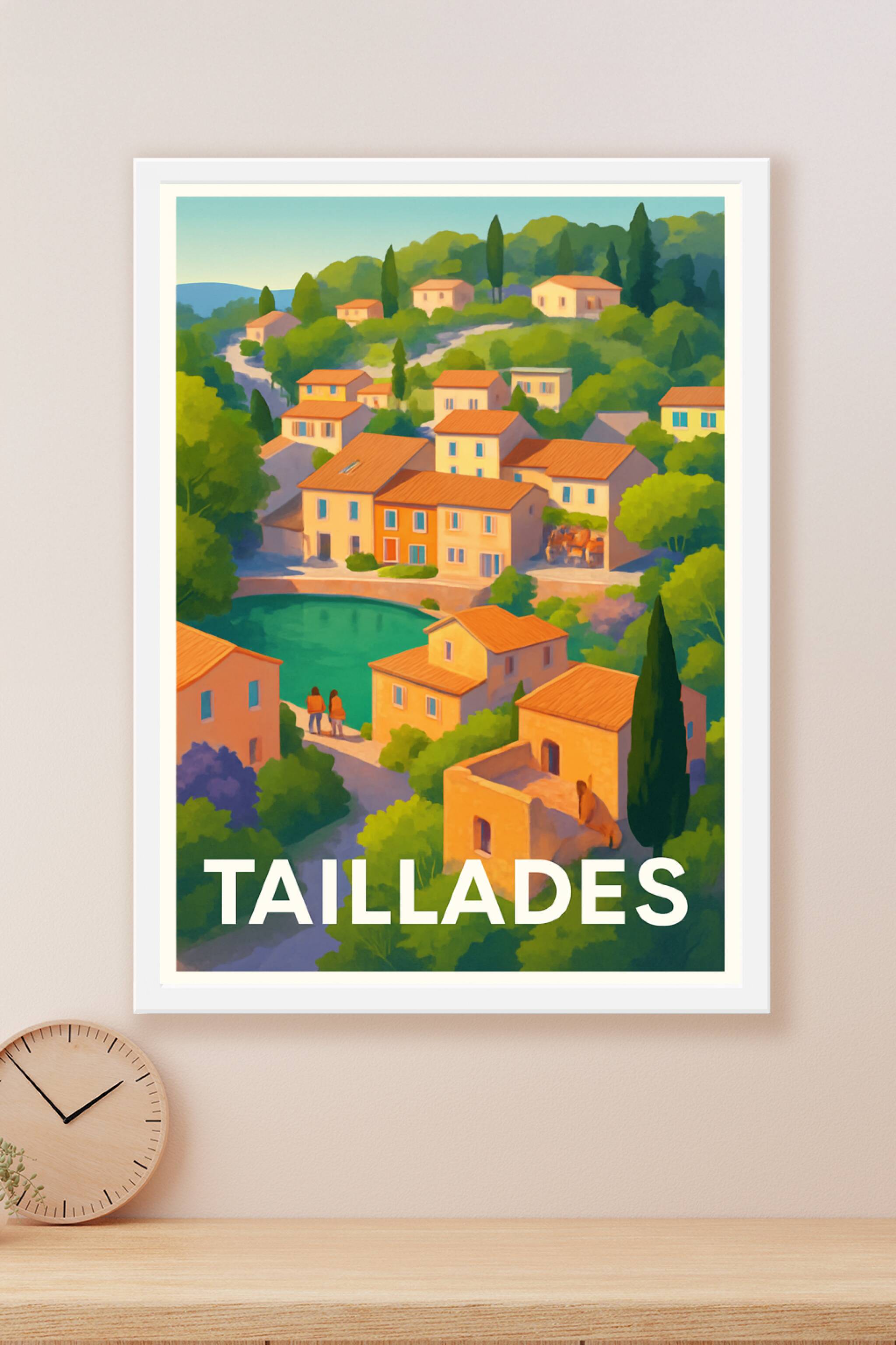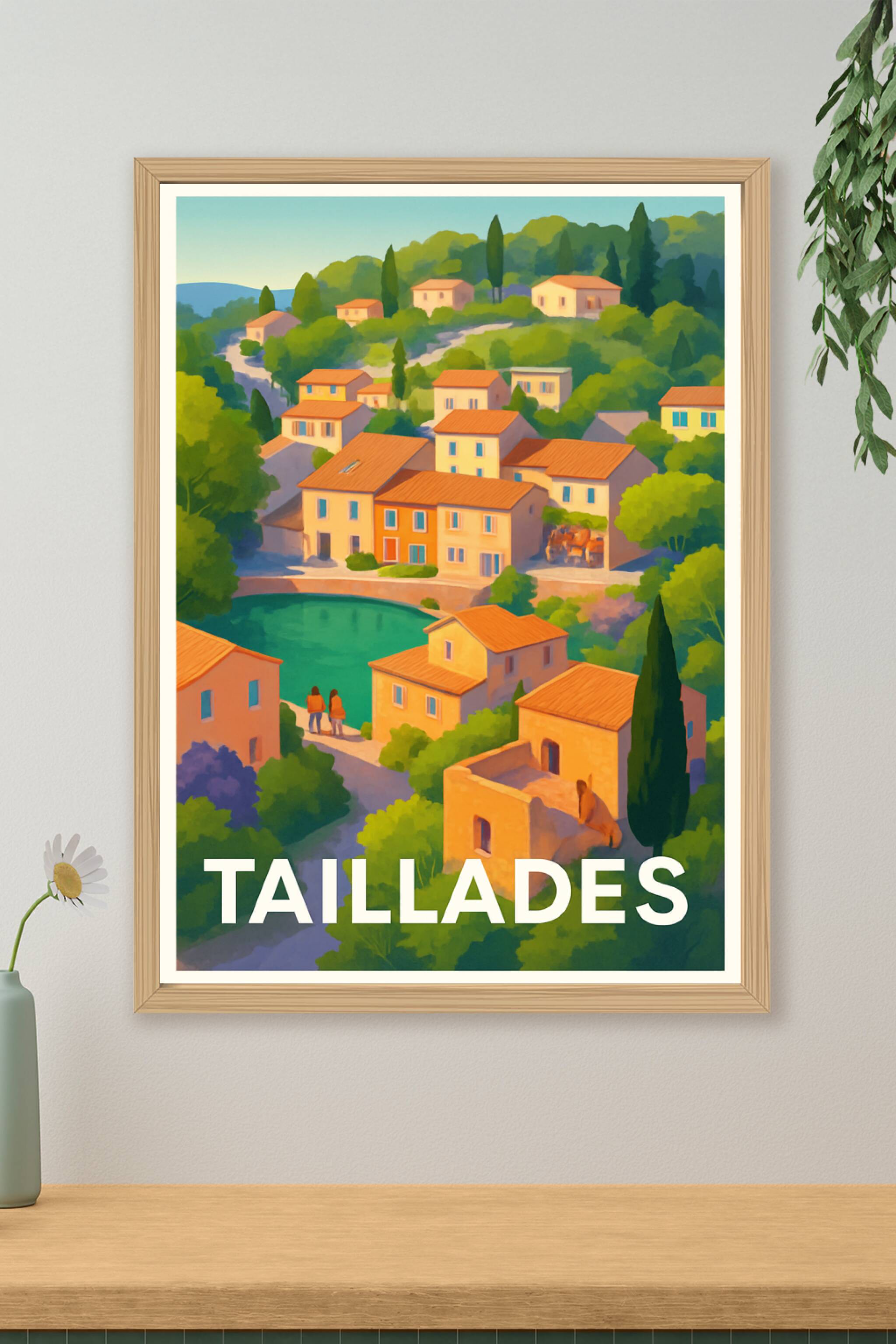 Découvrez l'atmosphère paisible et pittoresque de Taillades à travers cette magnifique affiche illustrée au style chaleureux et coloré. Ce poster capture l'essence d'un village provençal typique, avec ses toits de tuiles rouges, ses maisons anciennes nichées dans la verdure et son petit bassin aux eaux calmes. Imprimée en tirage "Fine Art" sur papier 305g coton, cette affiche garantit une qualité d'impression exceptionnelle, parfaite pour sublimer votre intérieur ou pour offrir un cadeau raffiné aux amoureux de la Provence. Disponible en formats A1 à A4, avec ou sans cadre, ce poster s'adapte à tous les espaces et styles de décoration, ajoutant une touche de douceur méridionale et d'authenticité à votre habitat.