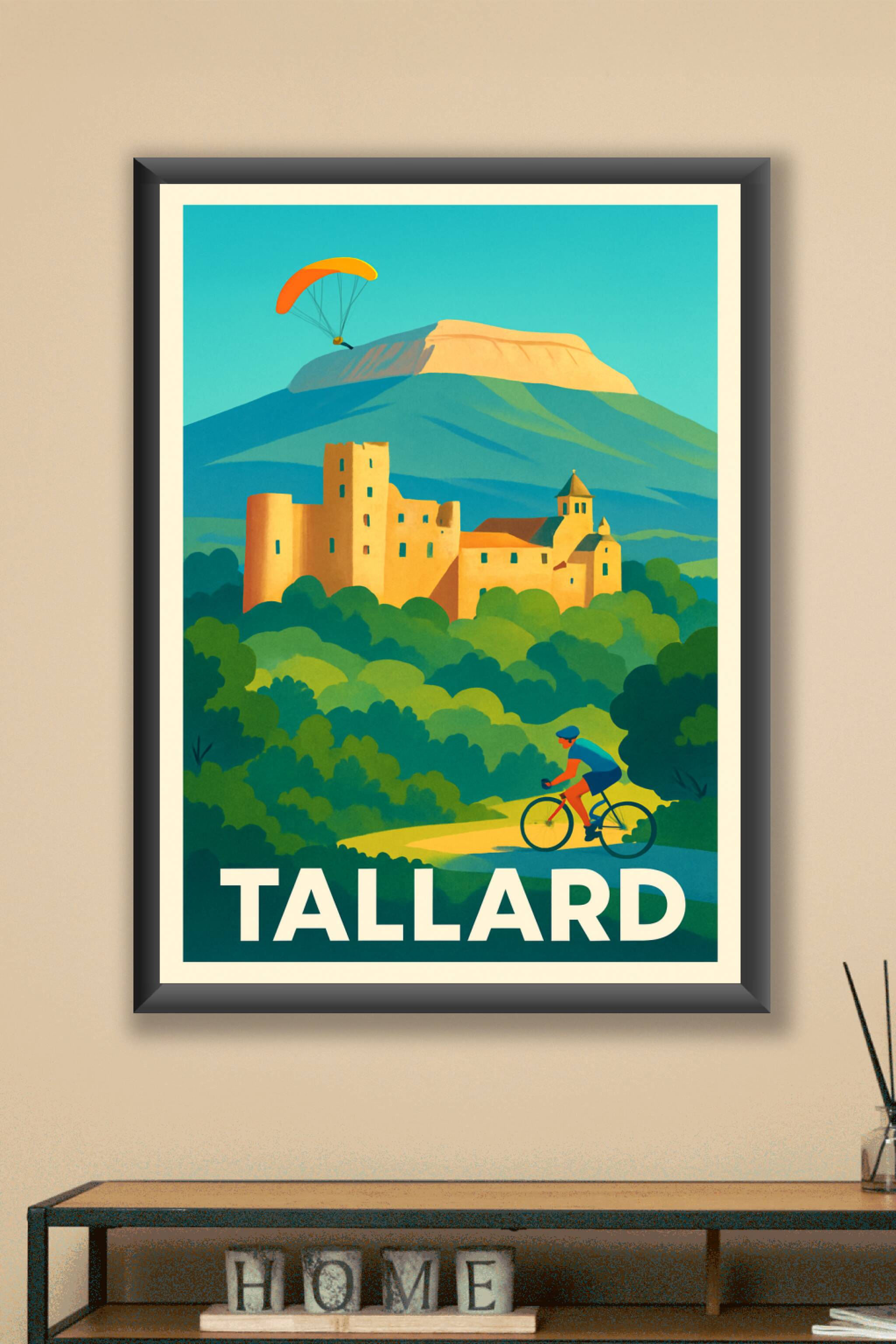 Découvrez Tallard à travers cette affiche aux couleurs éclatantes qui met en lumière son château emblématique et les activités de plein air, avec un cycliste en mouvement et un parapente planant dans le ciel bleu. Ce poster invite à explorer la beauté naturelle et historique de cette charmante ville.Admirez un tirage "Fine Art" réalisé sur papier 305g coton, garantissant une qualité d'impression exceptionnelle et une longue tenue des couleurs. Cette affiche est disponible en différents formats, de A1 à A4, avec ou sans cadre pour s'adapter parfaitement à votre intérieur. Apportez une touche vintage et dynamique à votre décoration ou offrez ce poster à tous les amoureux des paysages authentiques et des aventures en plein air.