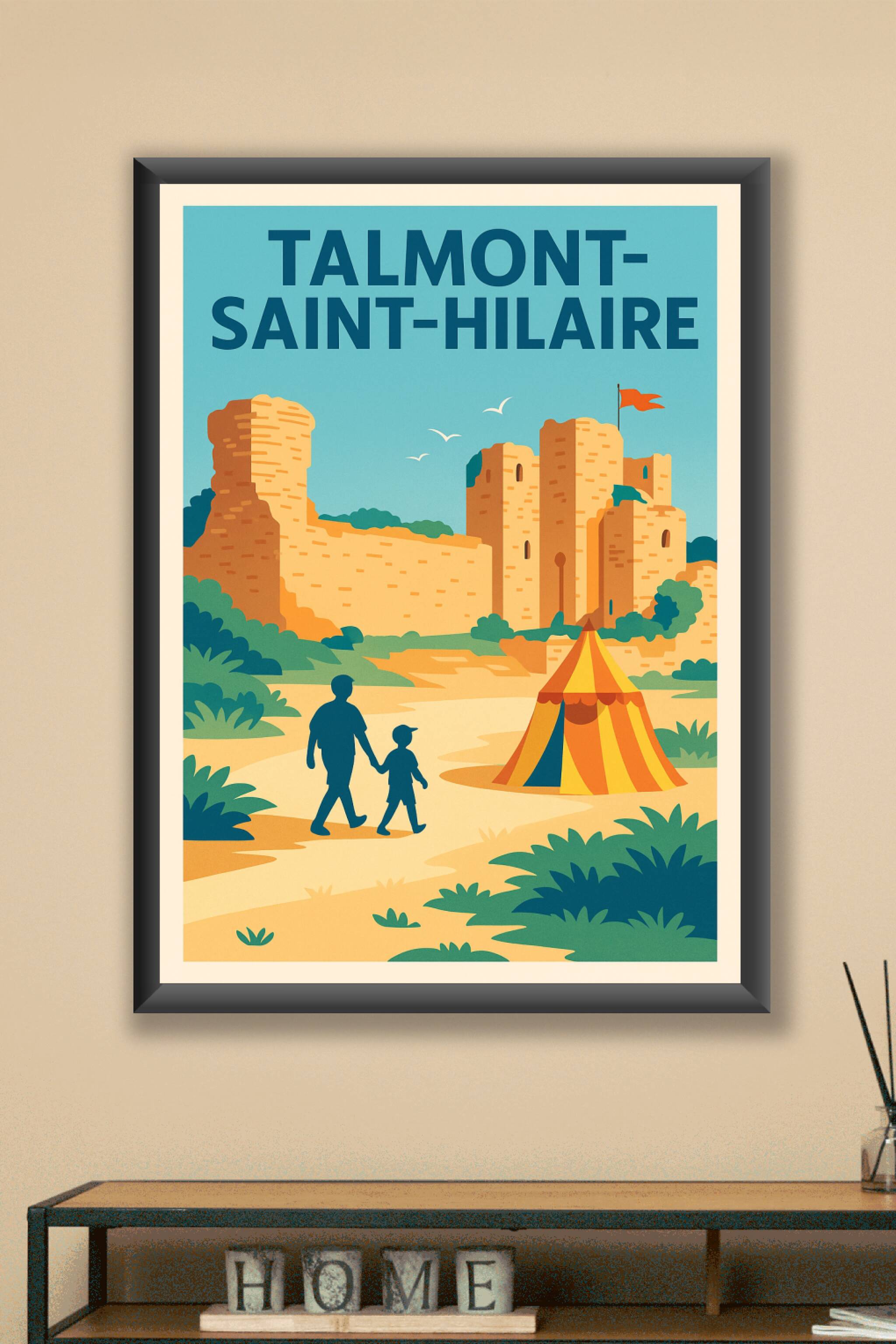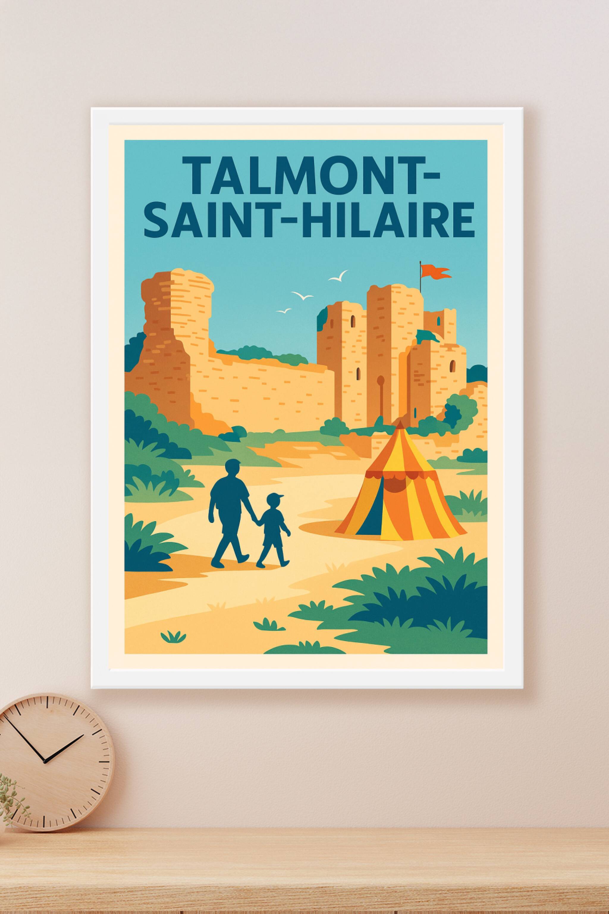 Découvrez le charme unique de Talmont-Saint-Hilaire avec cette affiche illustrée mettant en lumière son célèbre château médiéval et son ambiance fa...