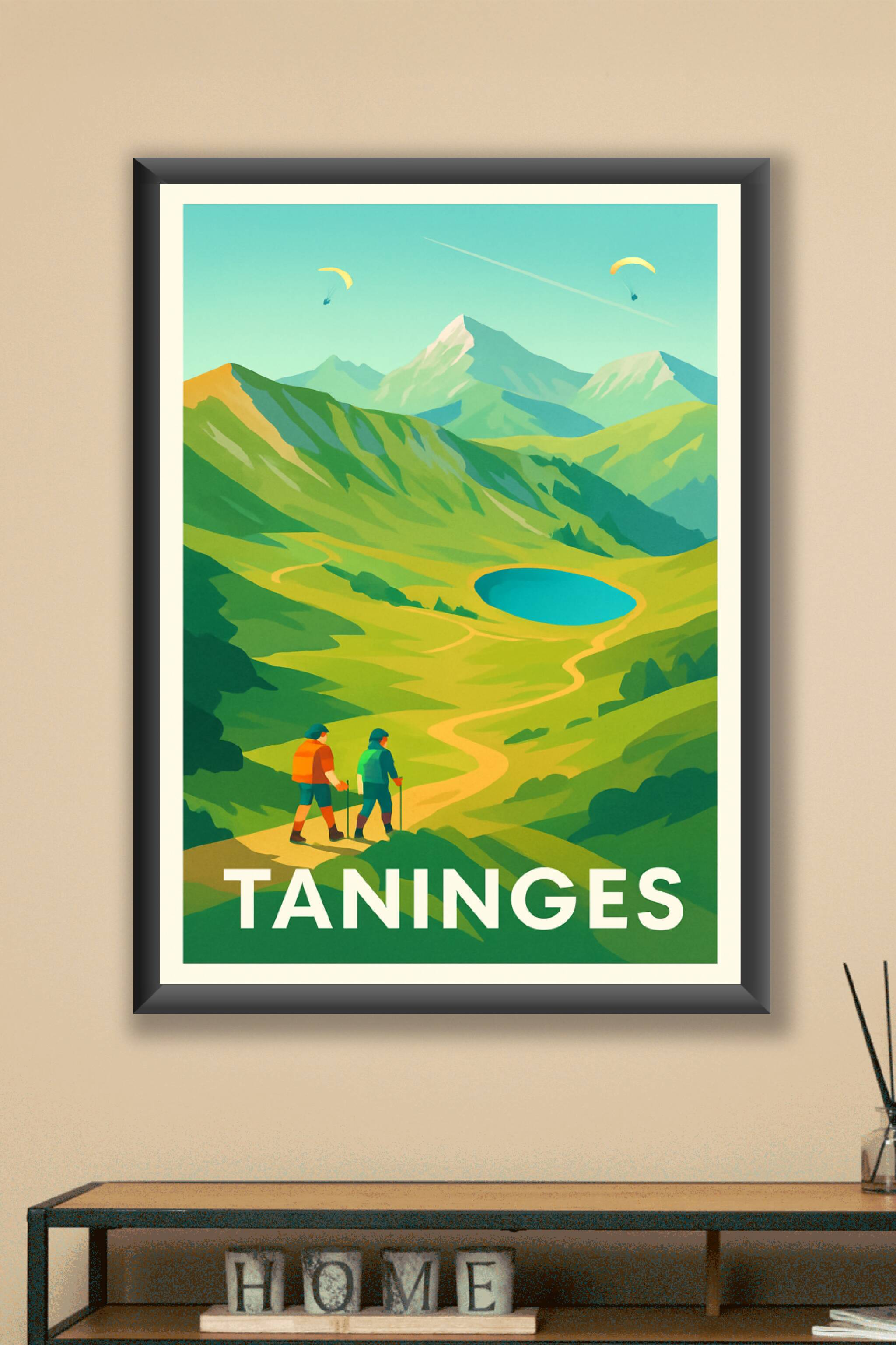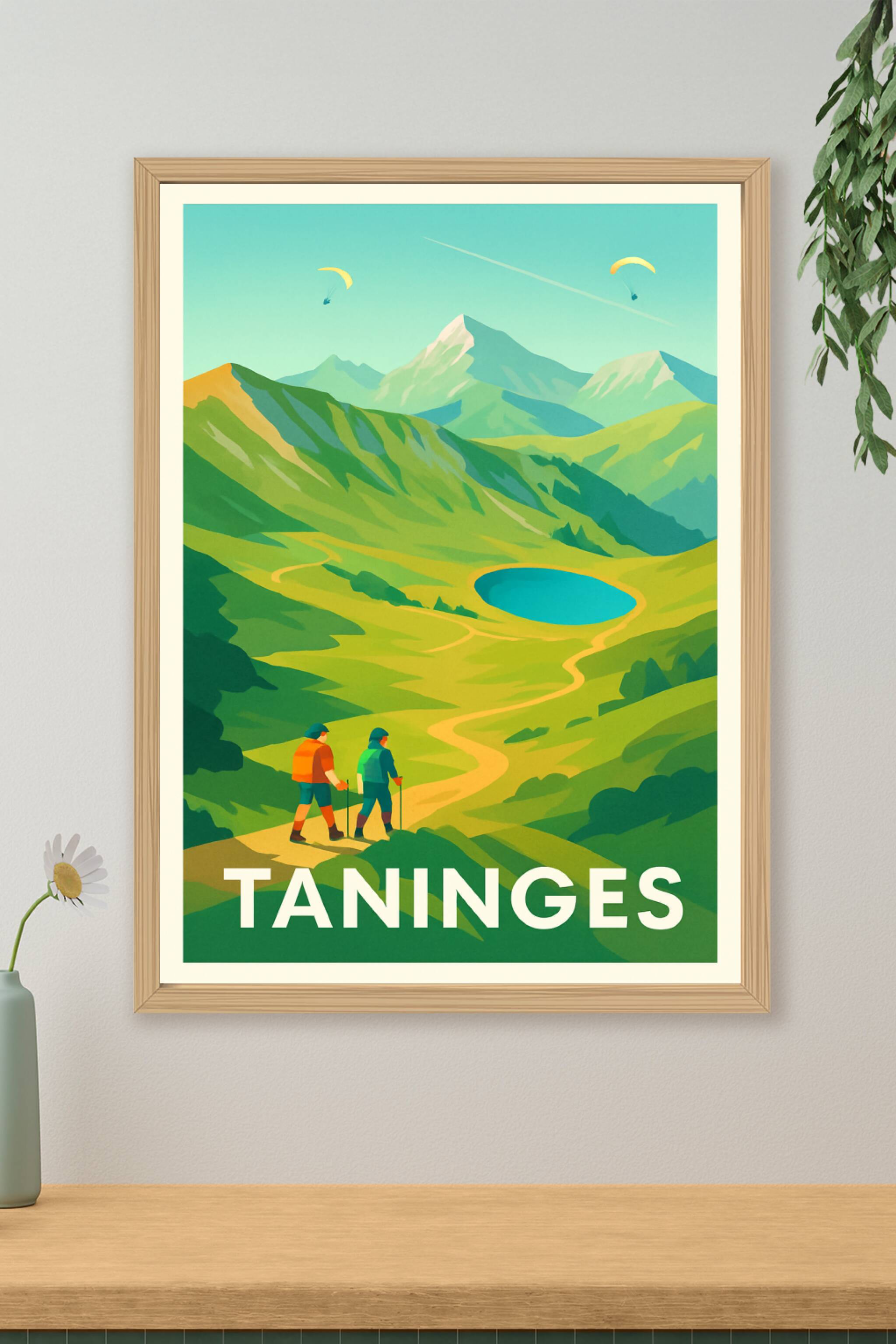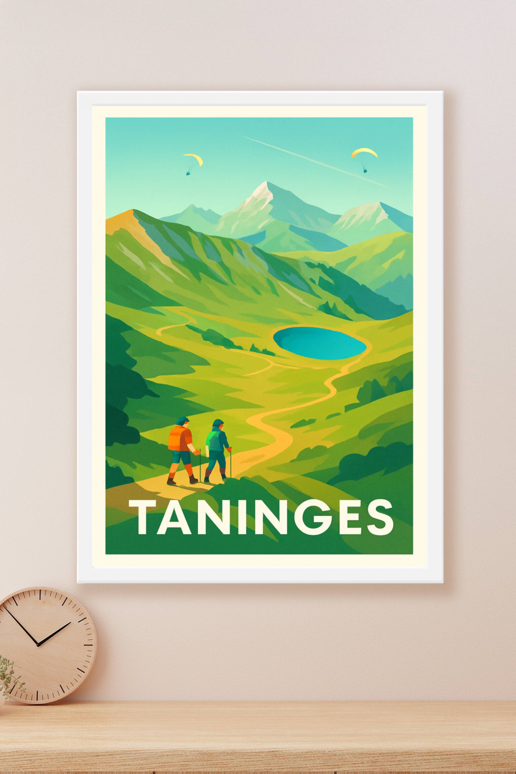 Découvrez l'affiche qui capture l'essence sauvage et poétique de Taninges, une invitation à la randonnée et à l'aventure dans un décor de montagnes verdoyantes et de lacs azurés. Ce poster au style vintage met en scène deux marcheurs contemplant un paysage grandiose parsemé de parapentes, symbole de liberté et de détente en plein air.Cette superbe affiche est disponible en tirage "Fine Art" sur papier 305g coton, garantissant une qualité d'impression exceptionnelle avec des couleurs éclatantes et une finition haut de gamme. Choisissez parmi les formats A1 à A4, avec ou sans cadre, pour décorer votre intérieur ou offrir un cadeau unique aux amateurs de nature et de grands espaces.Fabriquée en France, cette affiche premium allie esthétisme et durabilité pour sublimer votre décoration murale avec une touche alpine authentique.