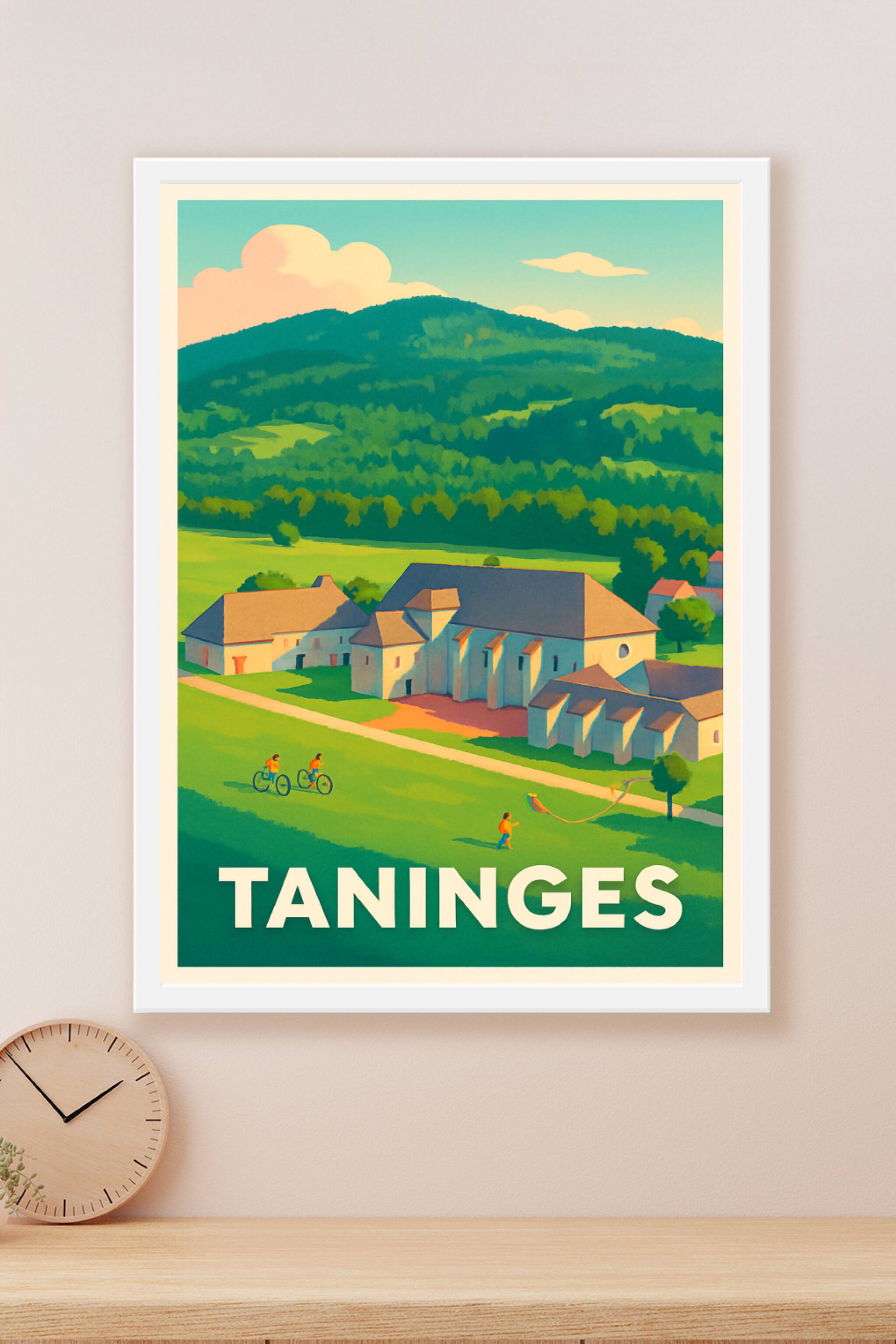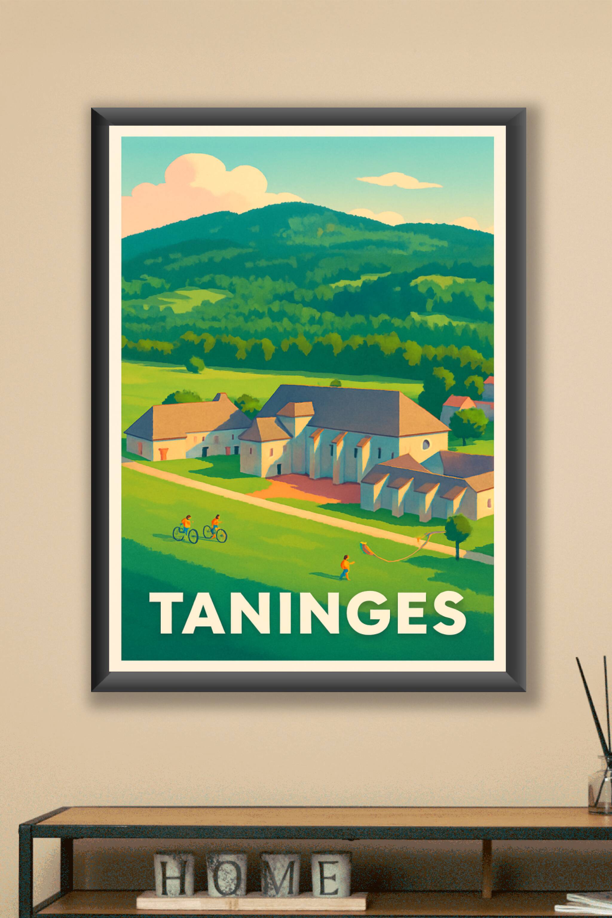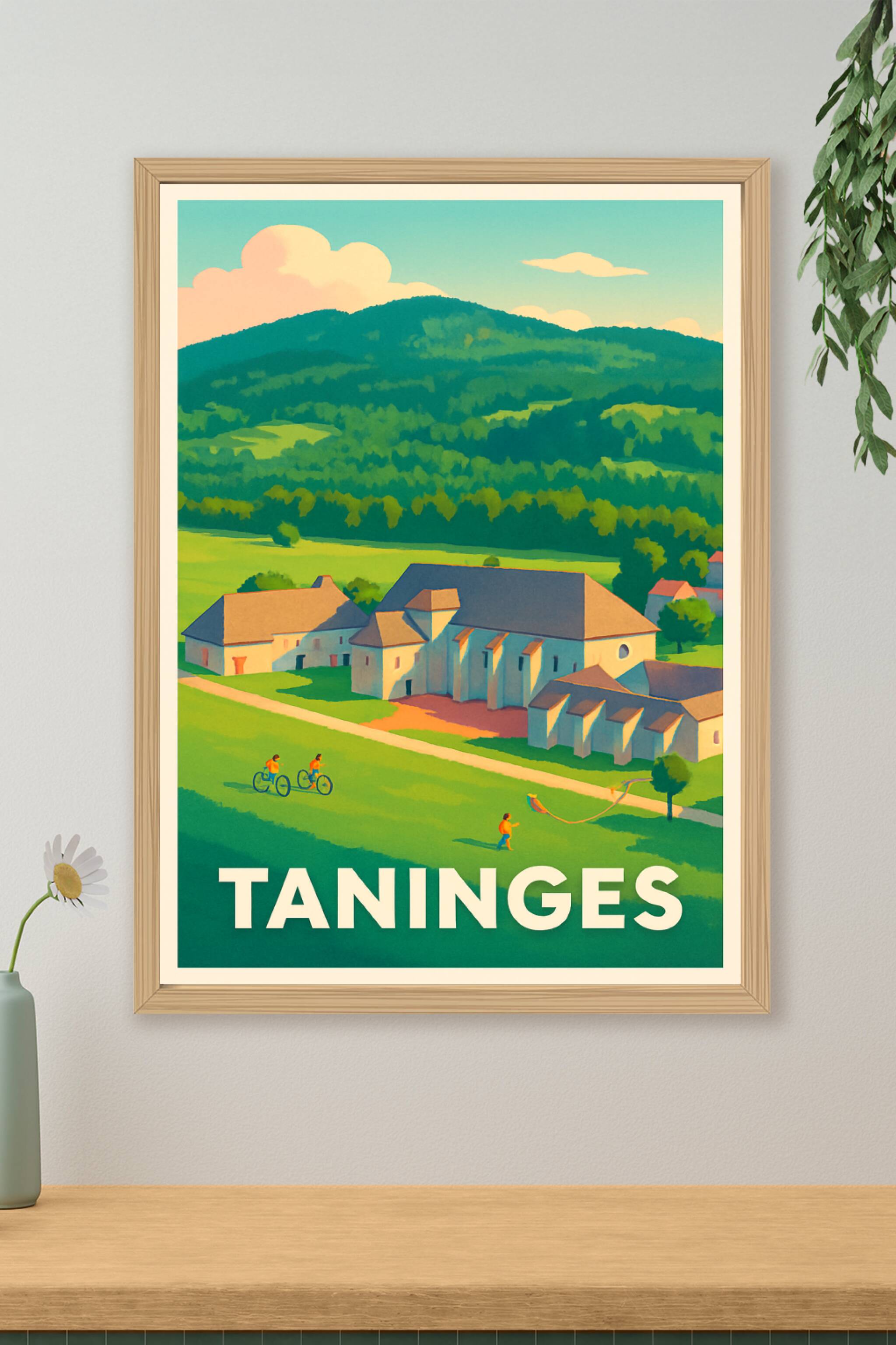 Découvrez la douceur de vivre à Taninges avec cette affiche illustrant un paysage paisible entre nature verdoyante et architecture traditionnelle. ...
