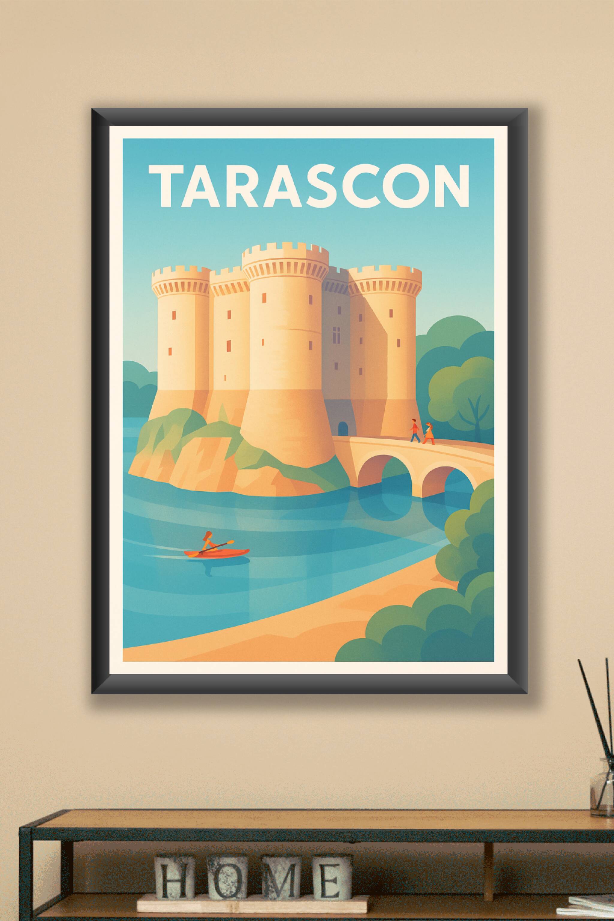 Découvrez l'envoûtante forteresse de Tarascon avec cette affiche graphique et lumineuse, illustrant son célèbre château au bord de la rivière. Ce p...