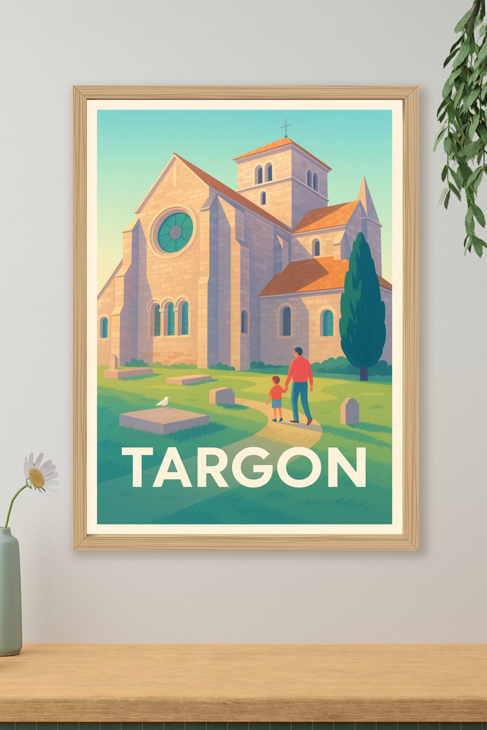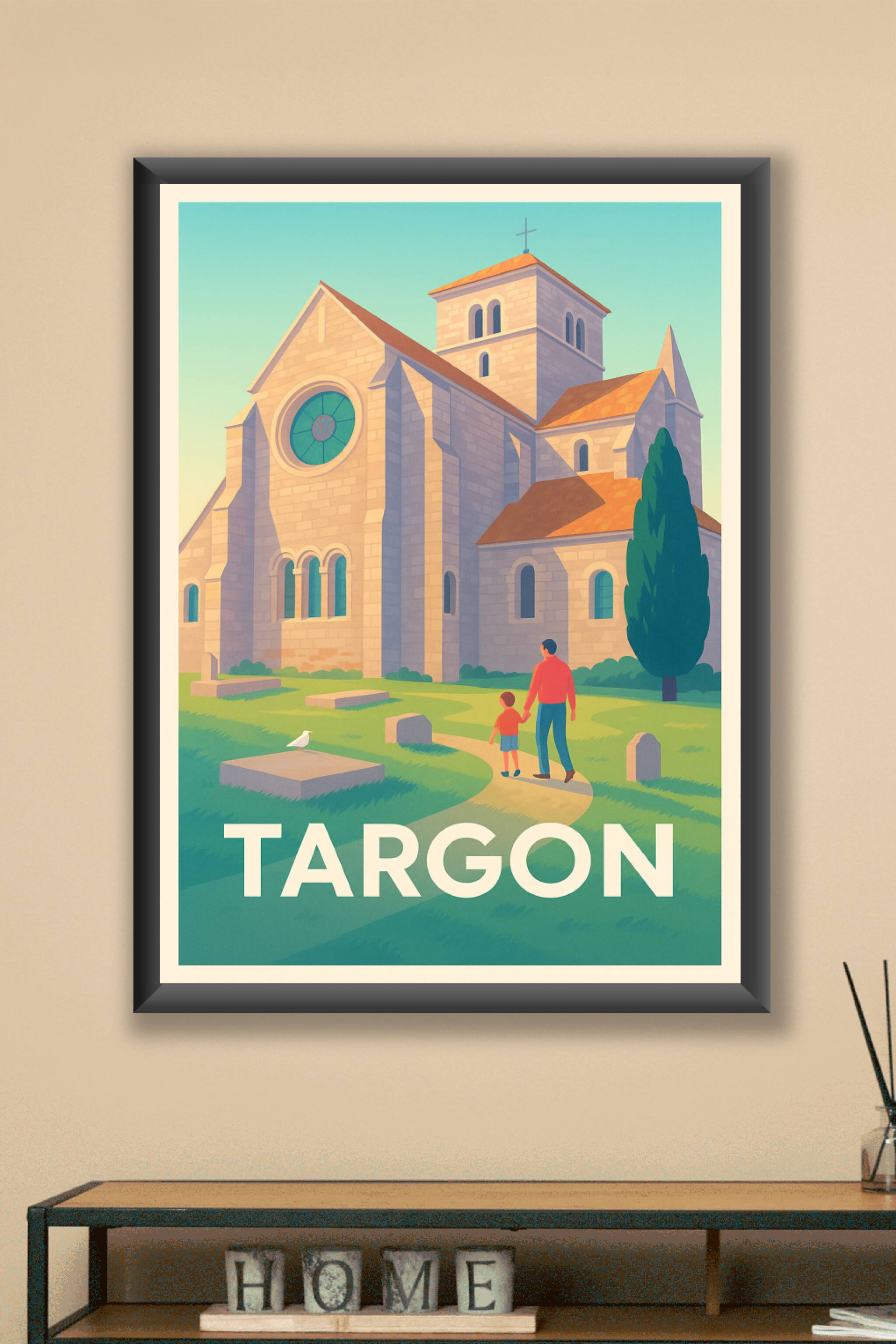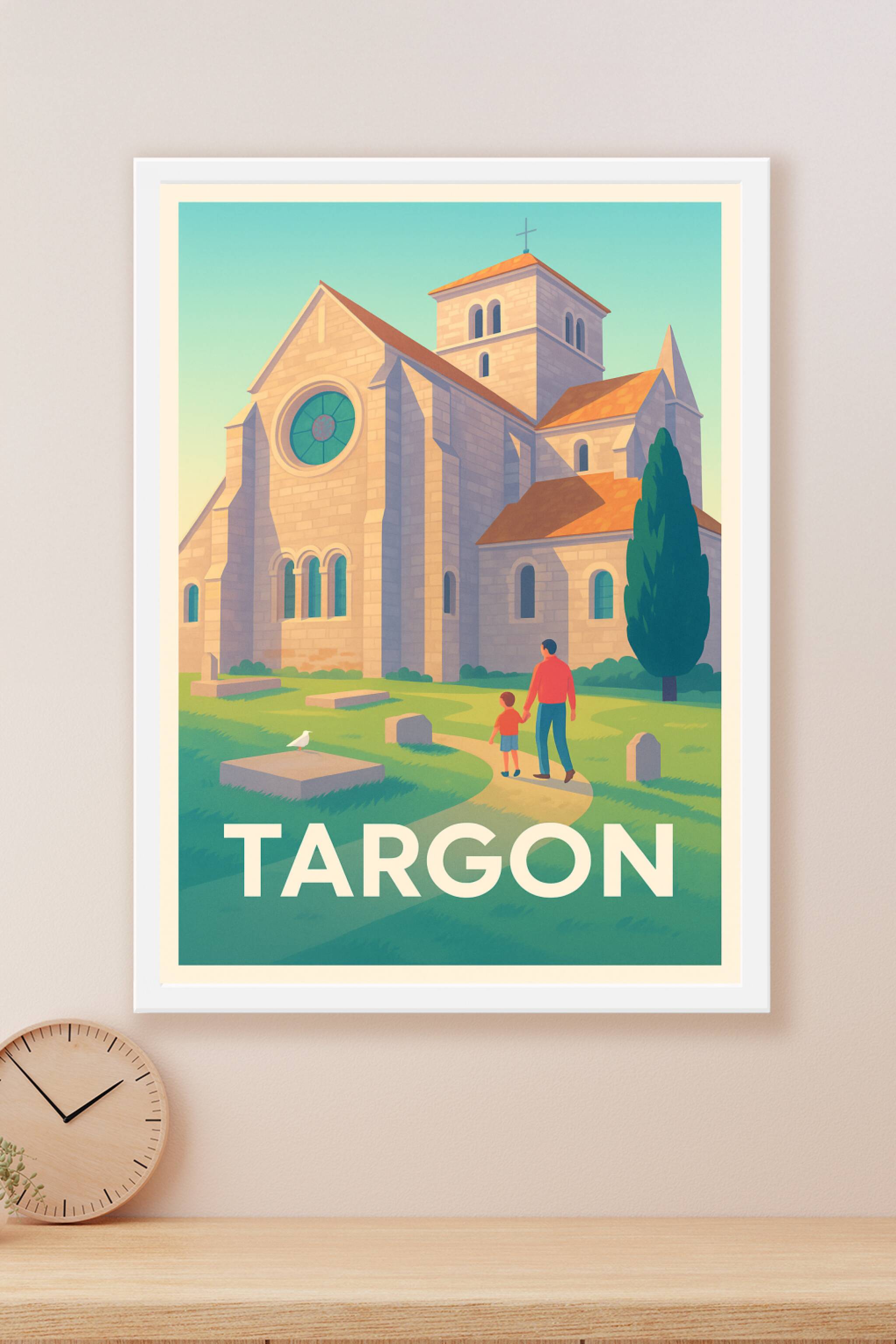 Découvrez l'atmosphère sereine et authentique de Targon avec cette affiche illustrée mettant en avant son église emblématique. Ce poster au style d...