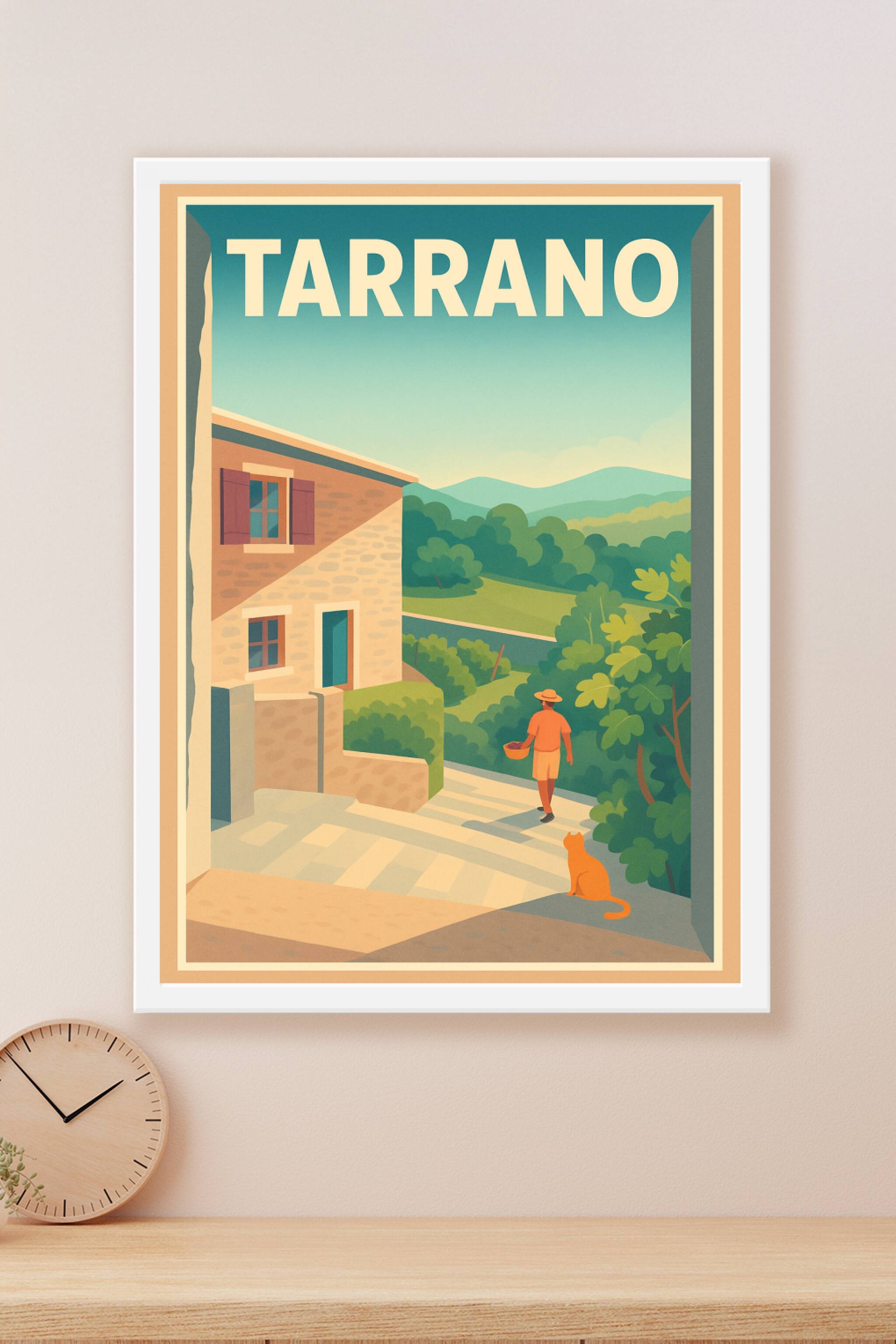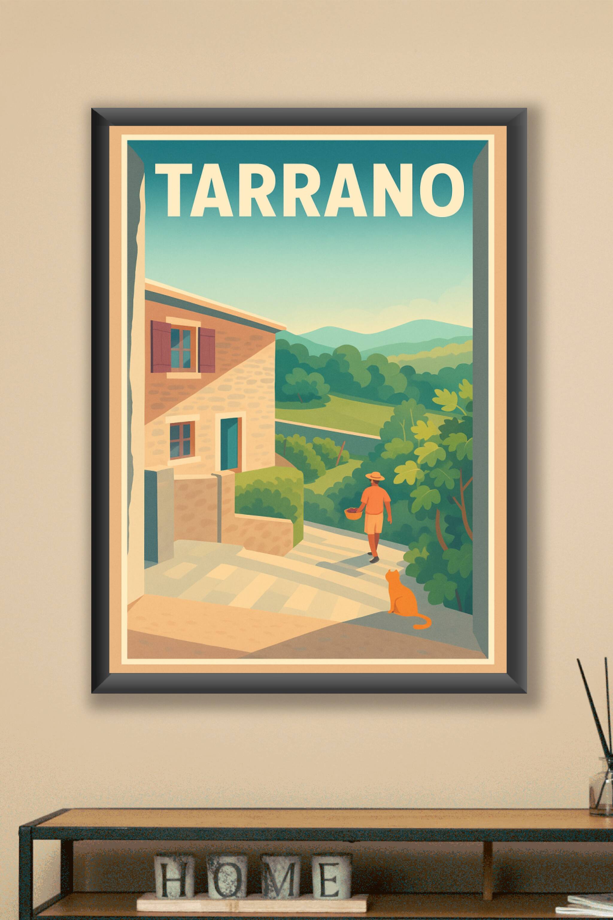 Découvrez la sérénité du village de Tarrano à travers cette affiche au style doux et chaleureux. Le poster illustre une scène paisible avec une mai...