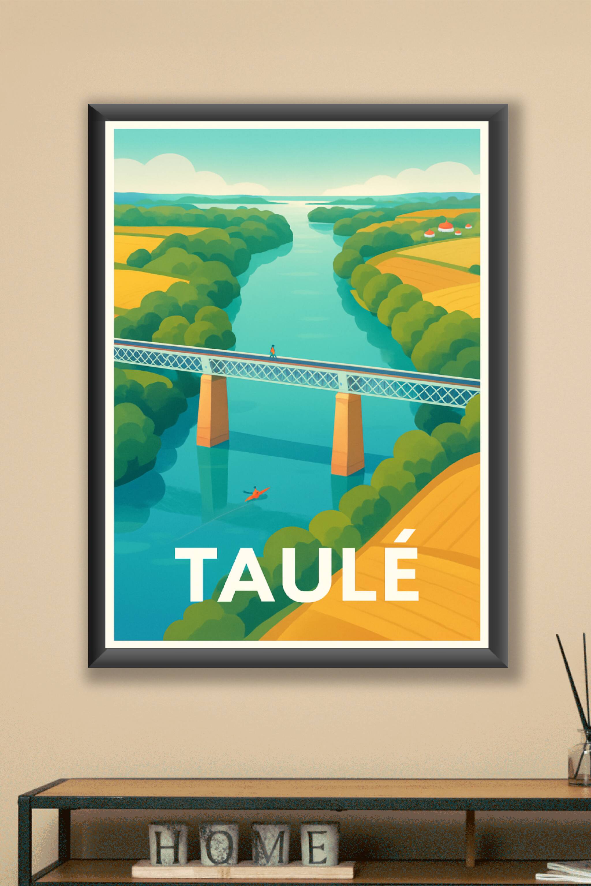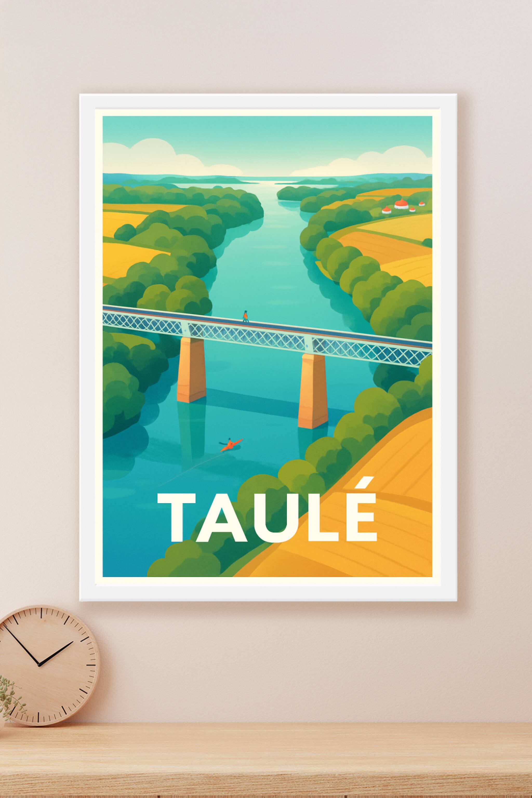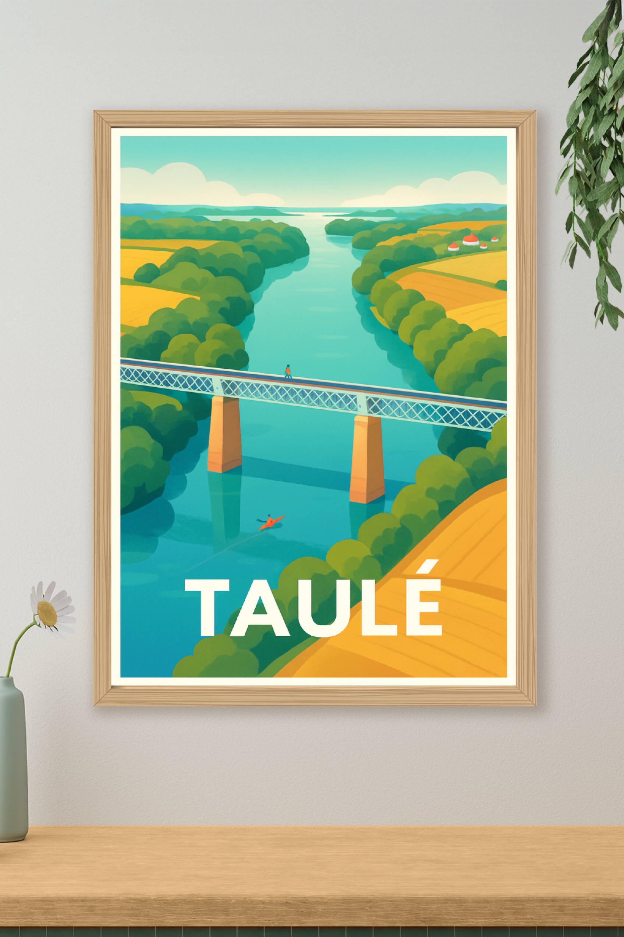 Découvrez la sérénité de Taulé à travers cette affiche alliant couleurs douces et paysages bucoliques. Ce poster illustre un pont emblématique surp...