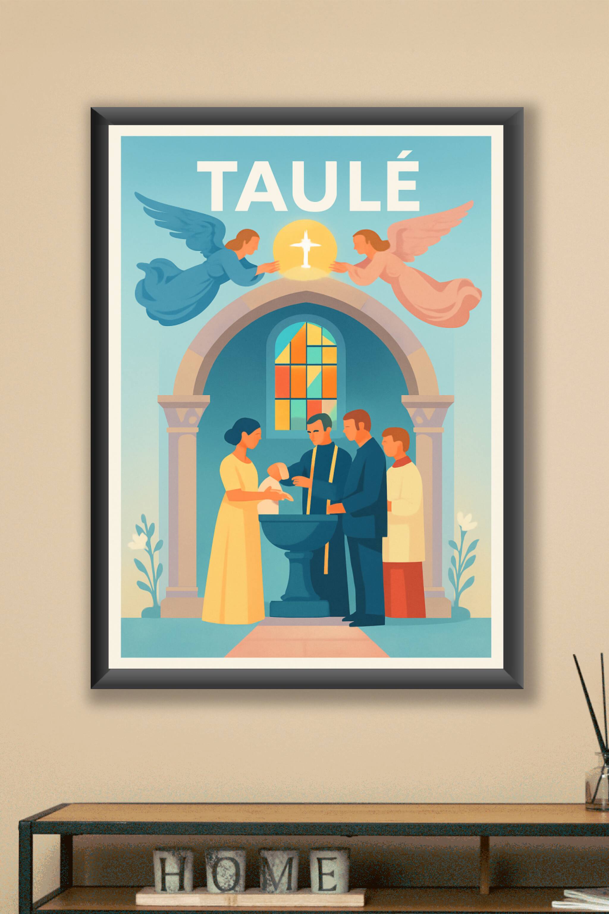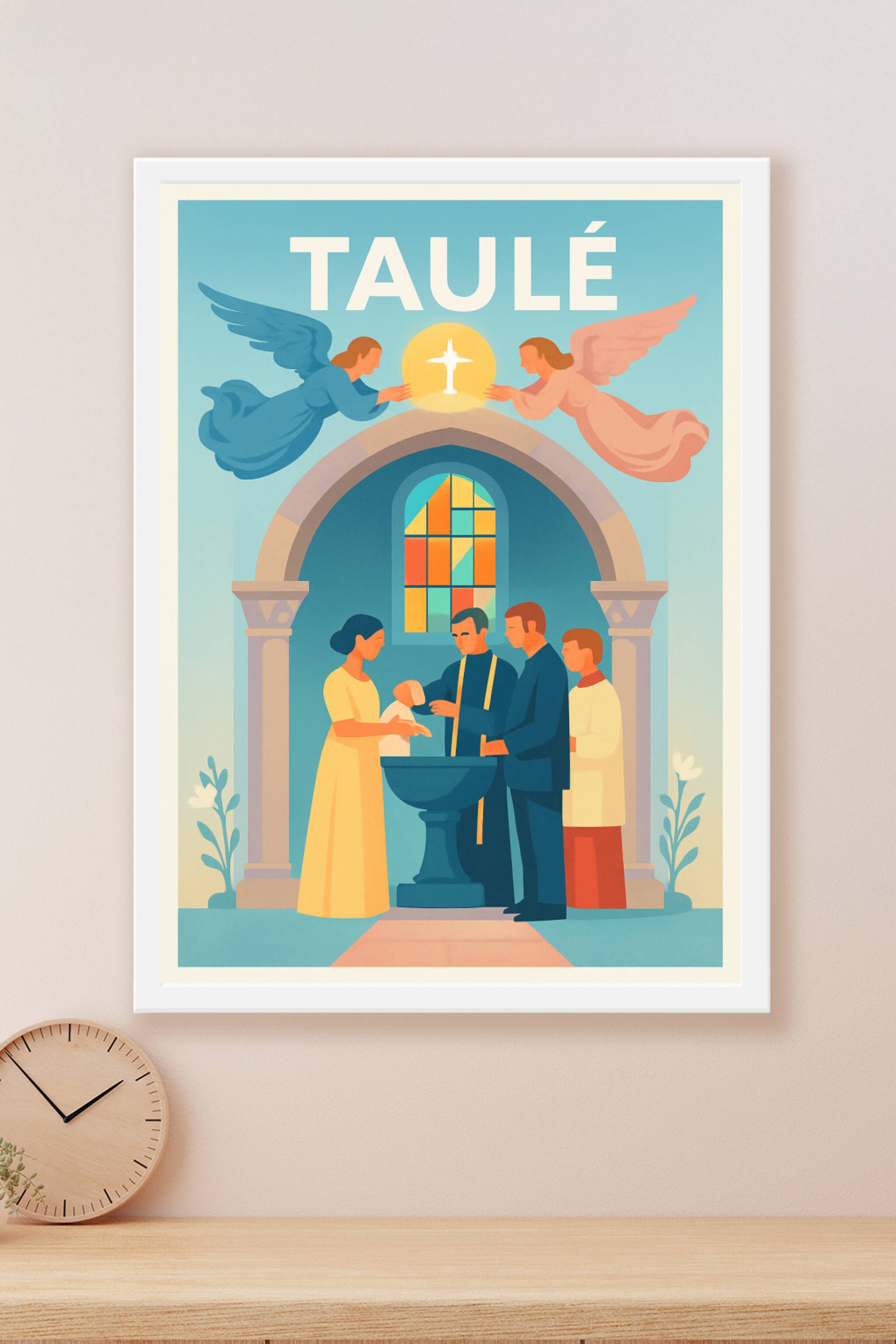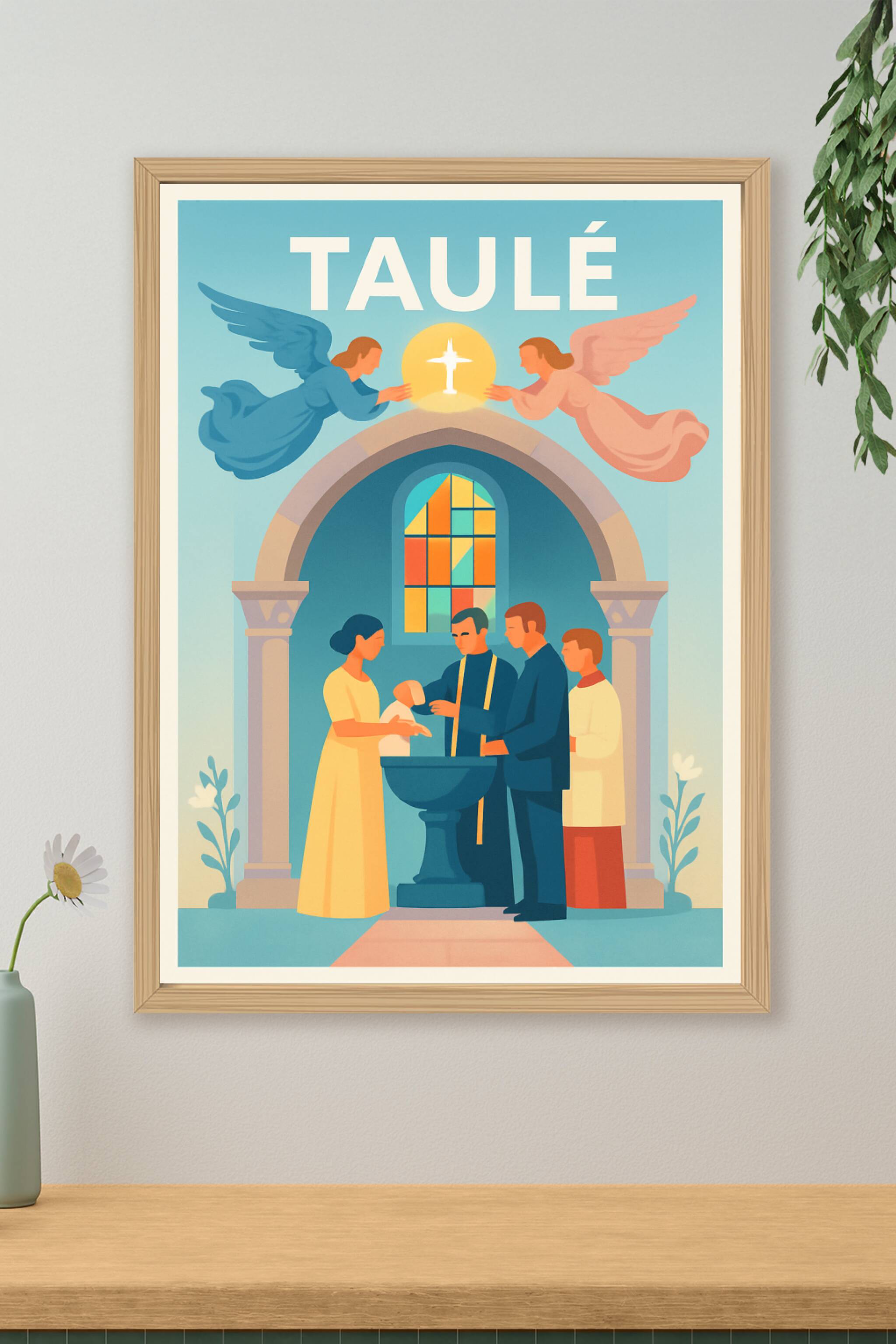 Découvrez cette magnifique affiche illustrant un baptême dans la charmante commune de Taulé. Ce poster aux couleurs douces et aux formes harmonieus...