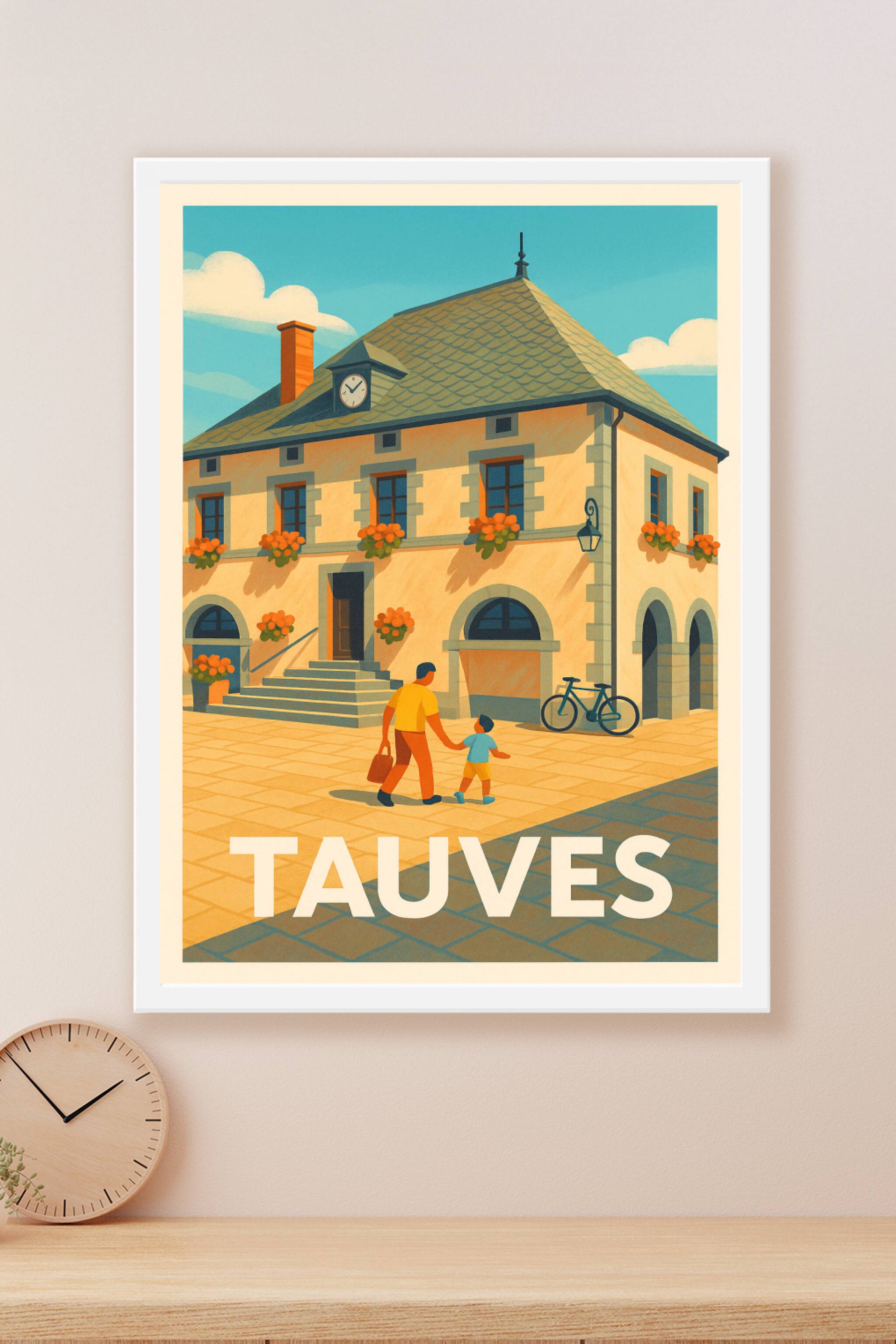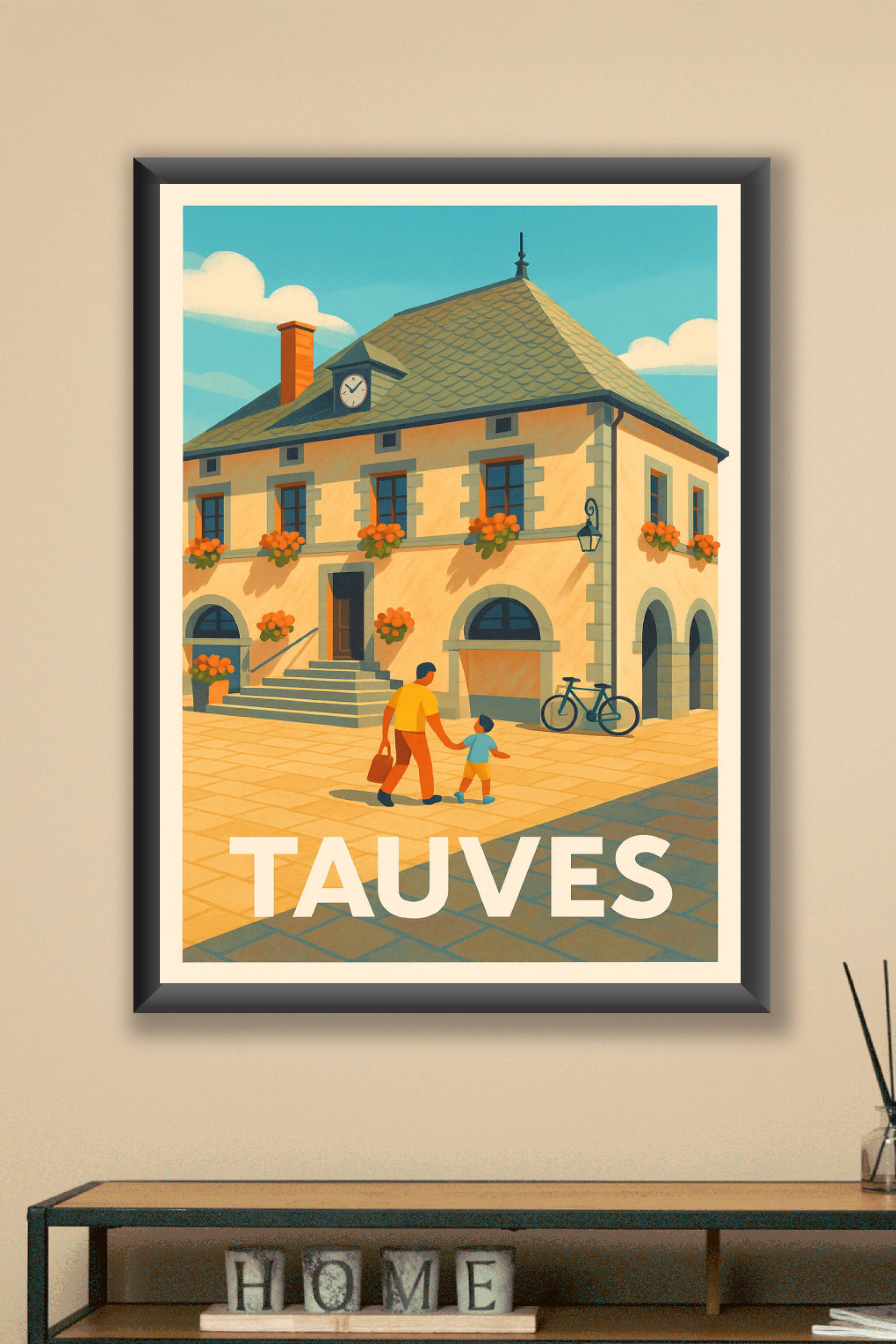 Découvrez l'élégance simple et la douceur de vivre de Tauves avec cette affiche illustrée représentant une scène paisible devant un bâtiment tradit...