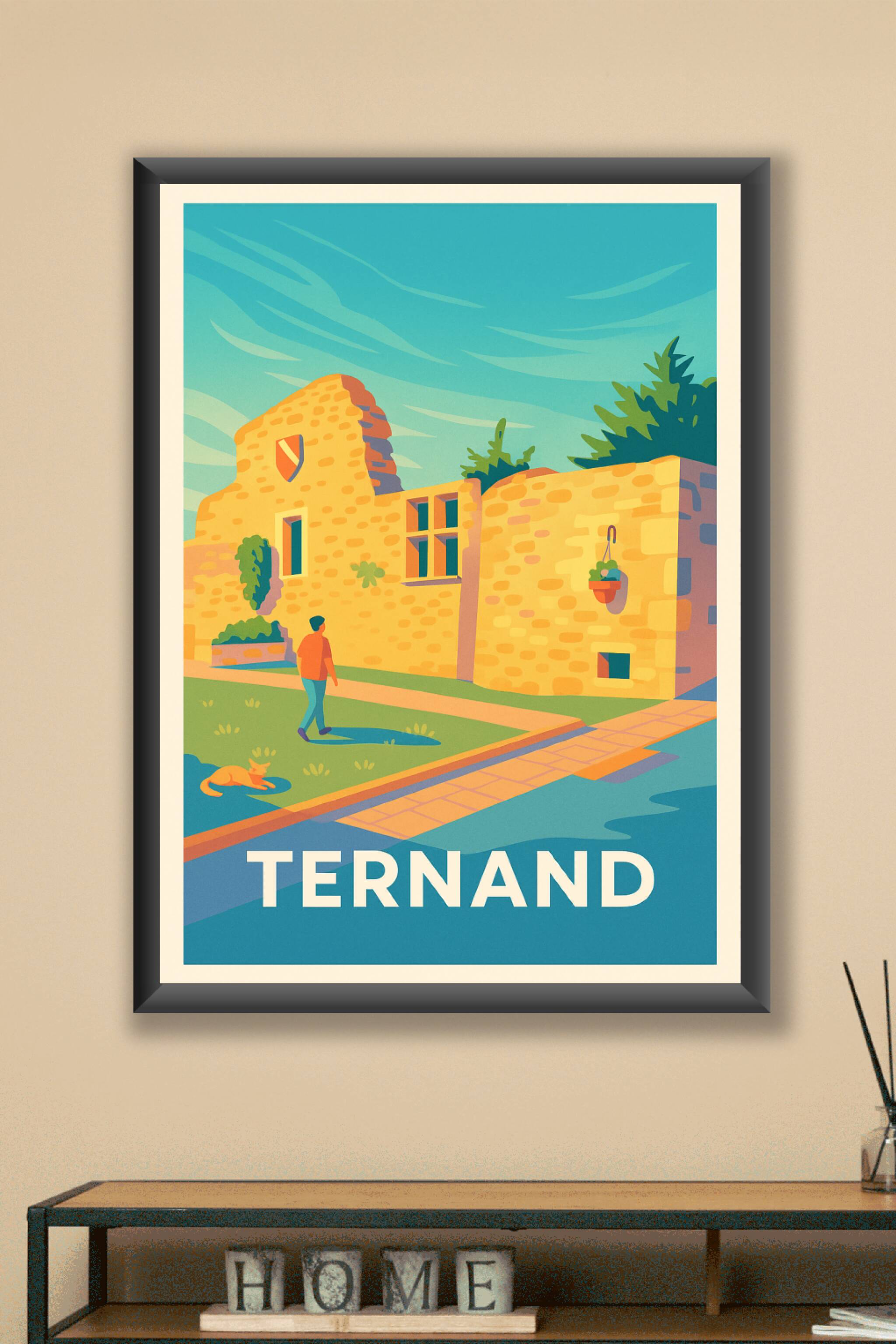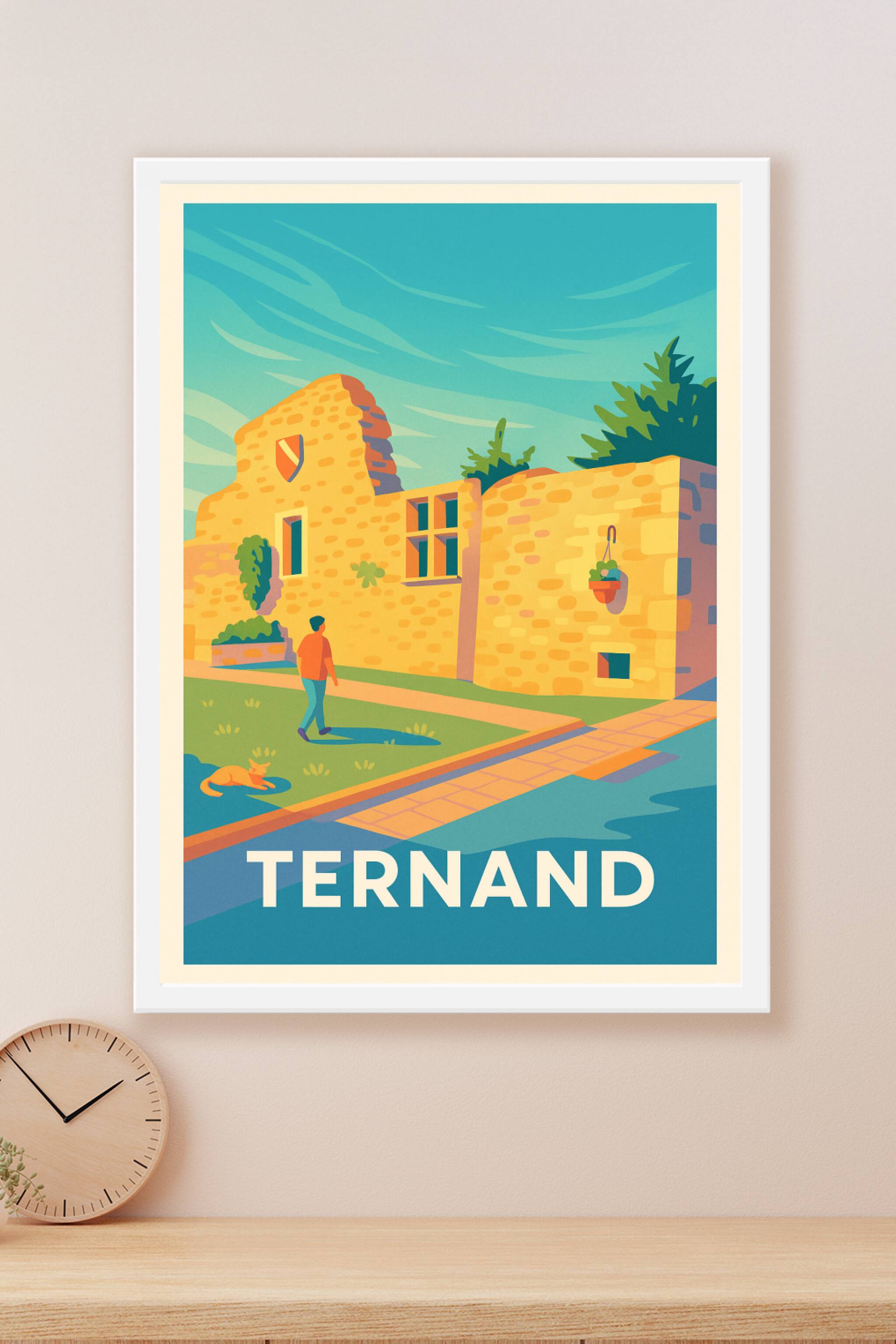 Découvrez l'affiche illustrée de Ternand, une invitation à la sérénité dans ce village au patrimoine riche et aux pierres dorées baignées par le so...
