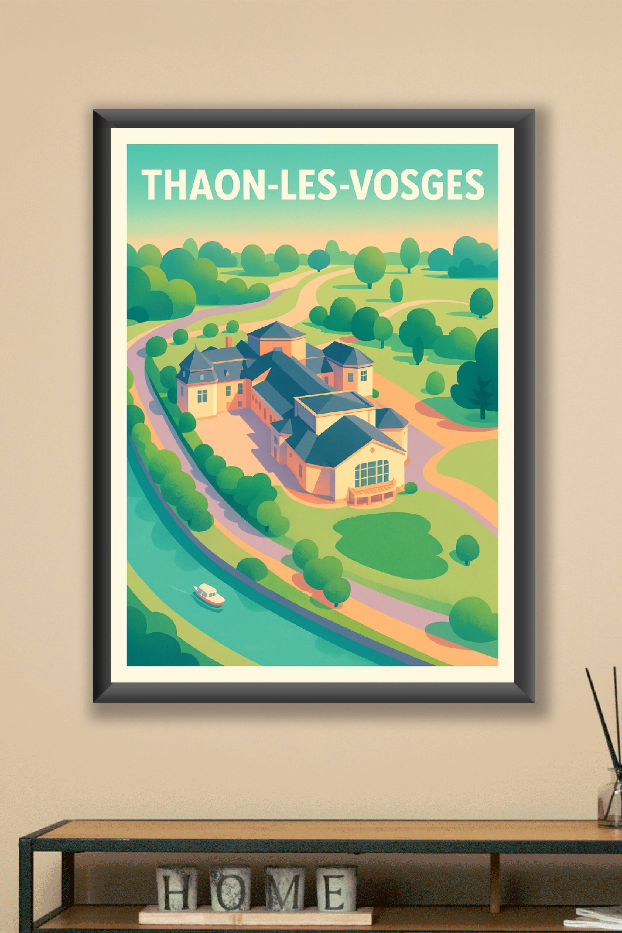 Découvrez le charme bucolique de Thaon-les-Vosges avec cette affiche au style graphique doux et lumineux qui met en valeur ses paysages verdoyants ...