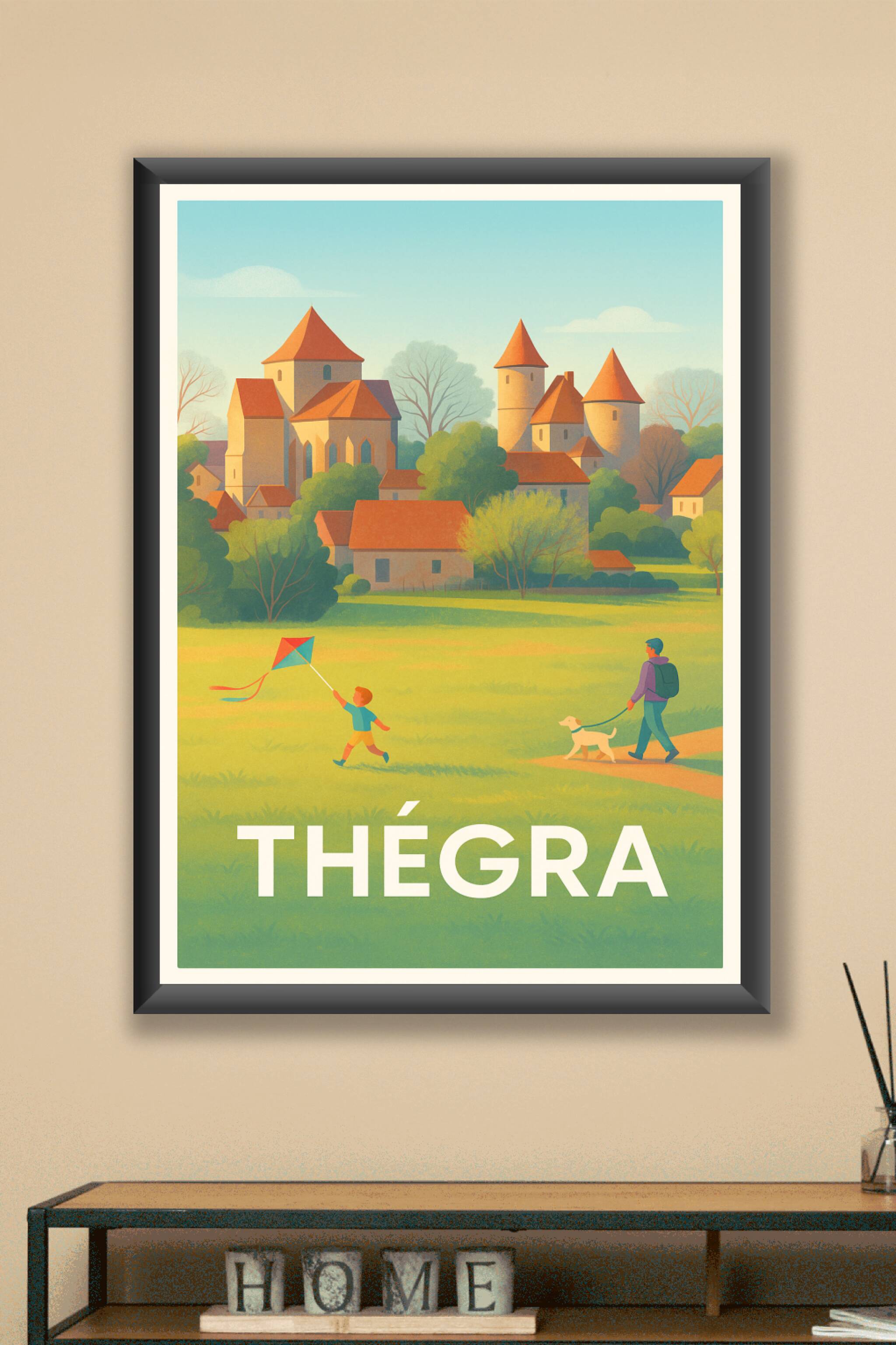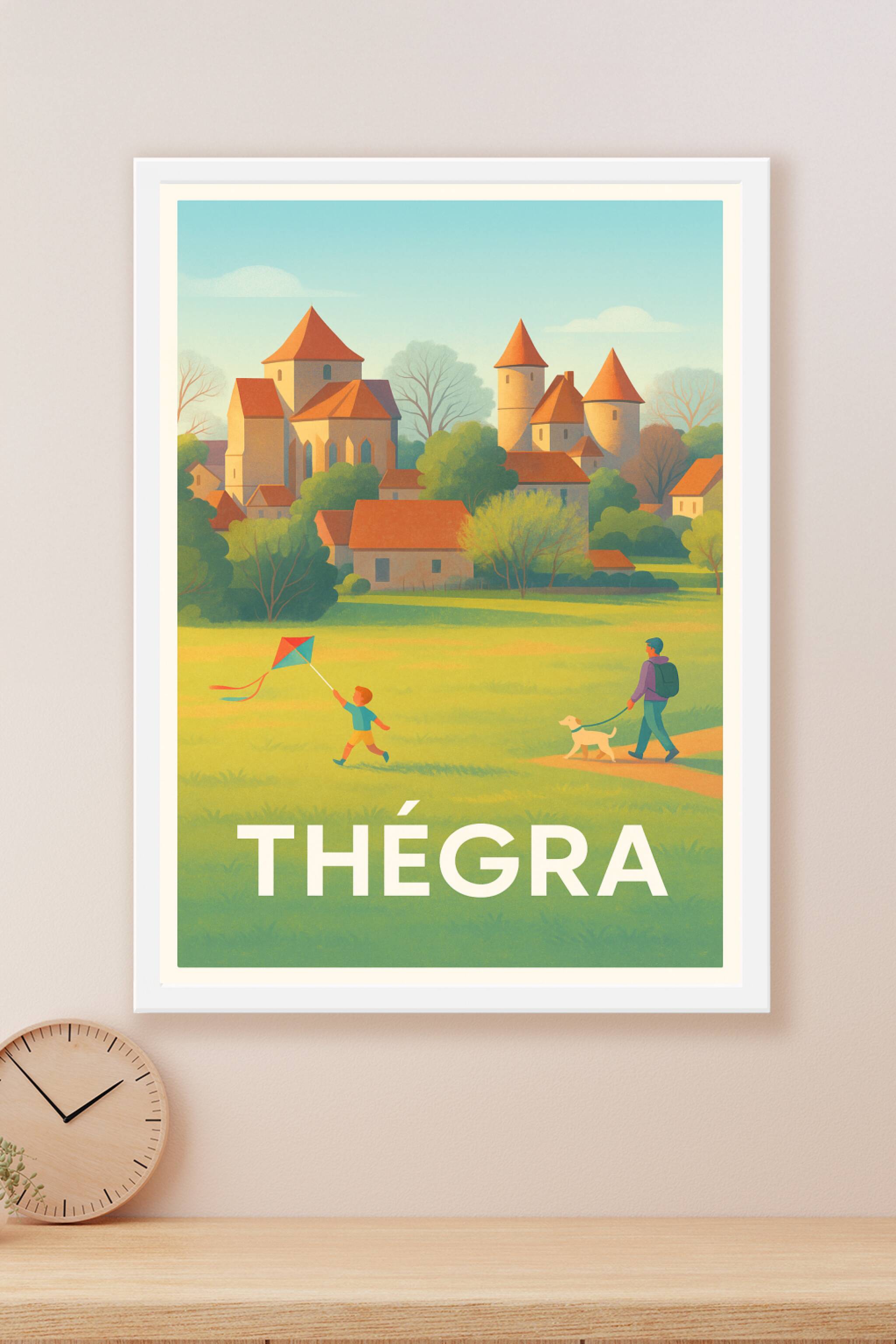Découvrez la douceur de vivre à Thégra avec cette affiche illustrant un paysage paisible où se mêlent verdure et patrimoine médiéval. Le poster met...