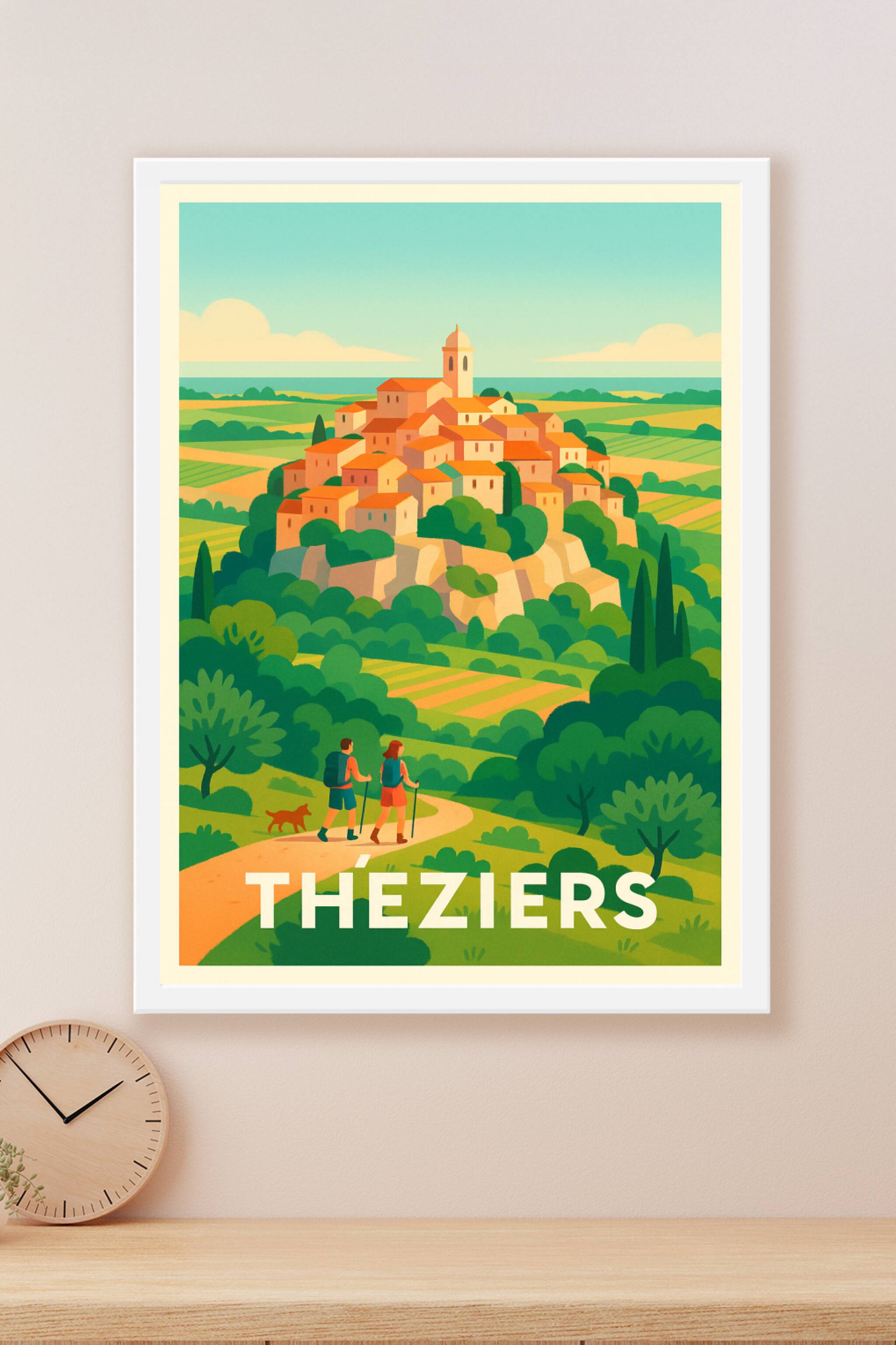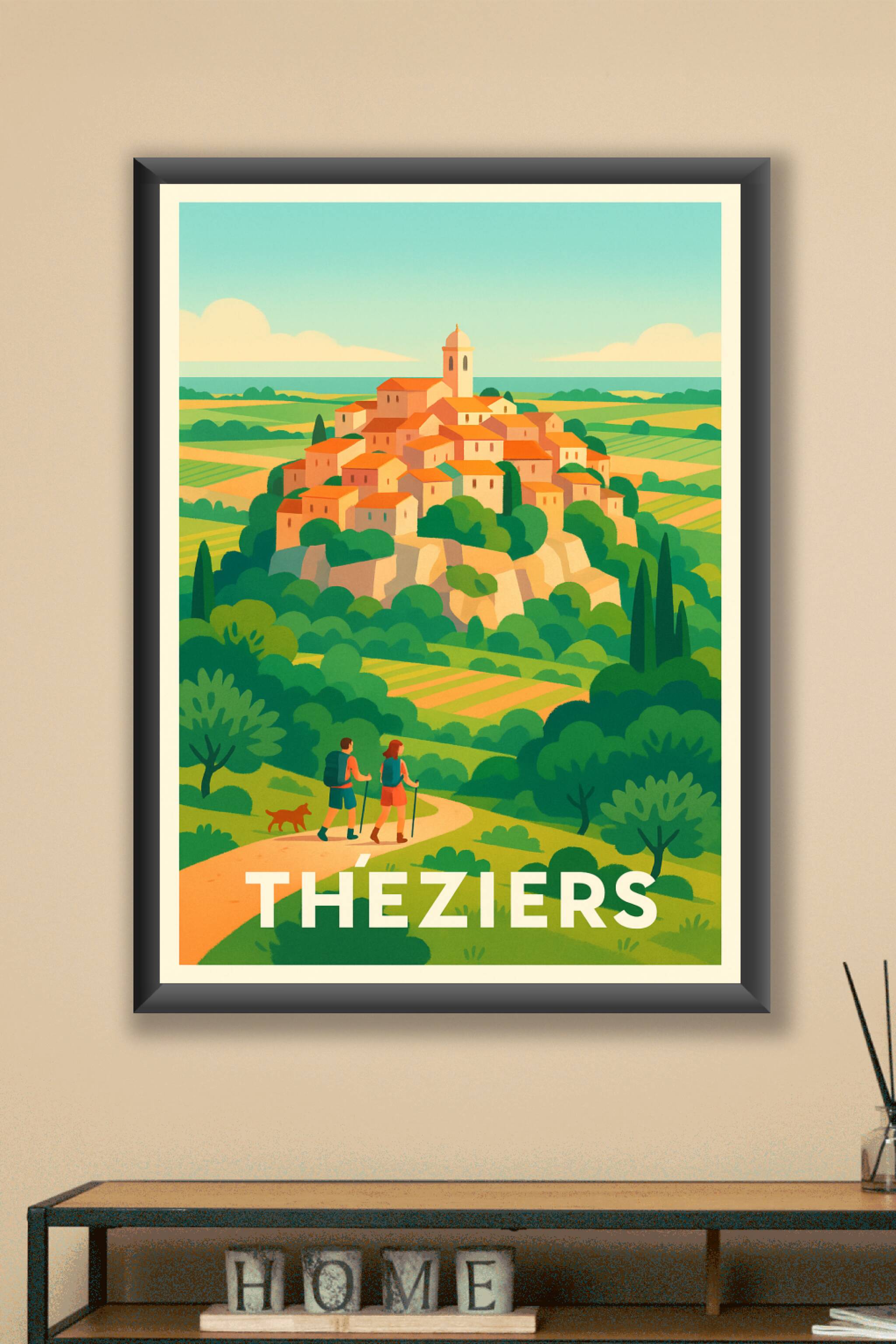 Découvrez la beauté pittoresque de Théziers avec cette affiche illustrée représentant le charmant village perché entouré de verdure luxuriante et d...