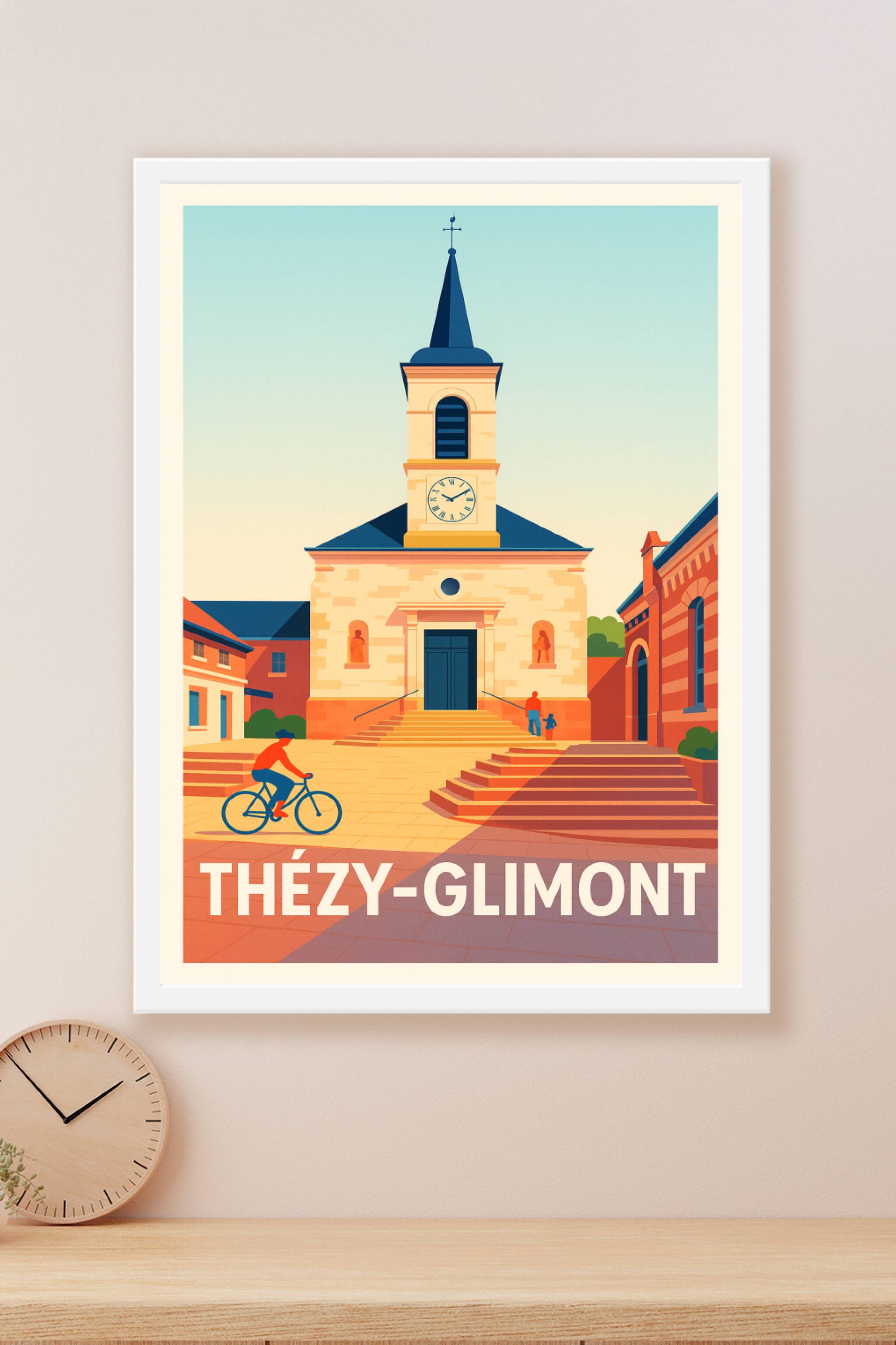 Découvrez l'élégance paisible de Thézy-Glimont avec cette affiche illustrée présentant un monument central baignant dans une lumière douce et chale...