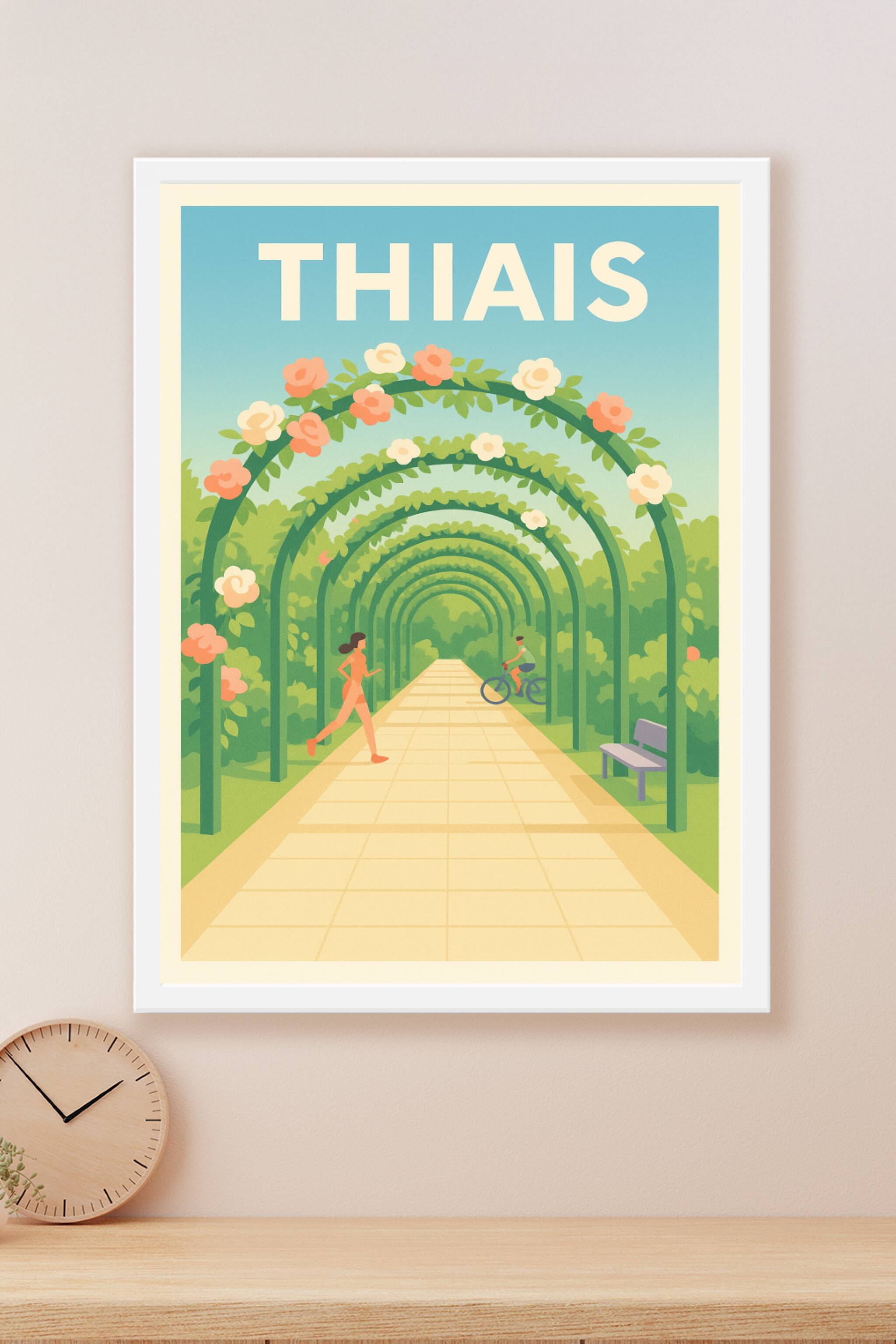 Découvrez l'élégance et la sérénité de Thiais avec cette affiche inspirée d'un chemin bordé d'arcs fleuris où promeneurs et cyclistes partagent un ...