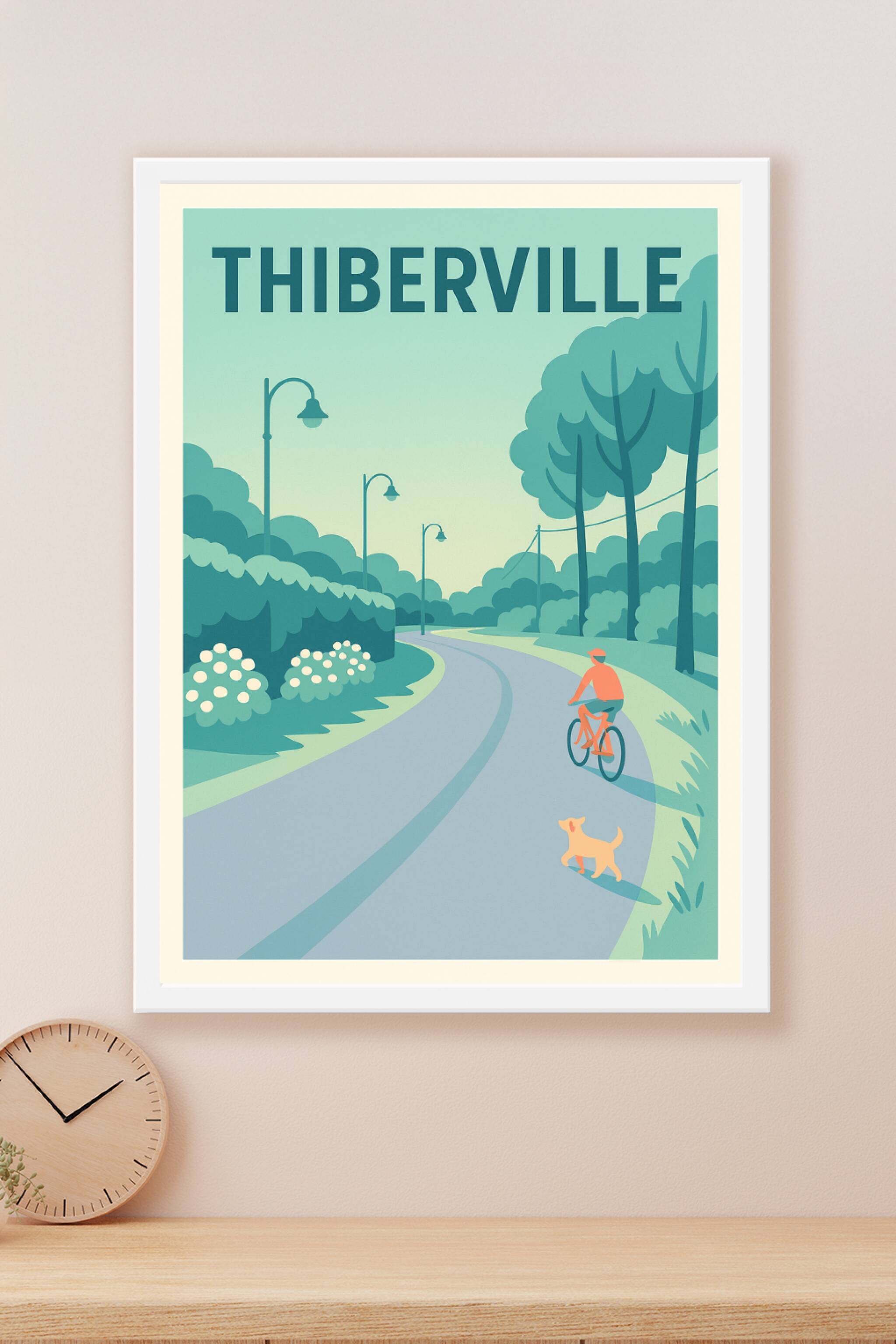 Découvrez l'ambiance paisible de Thiberville avec ce poster illustré mettant en scène une balade à vélo dans un cadre verdoyant. Ce chemin sinueux ...