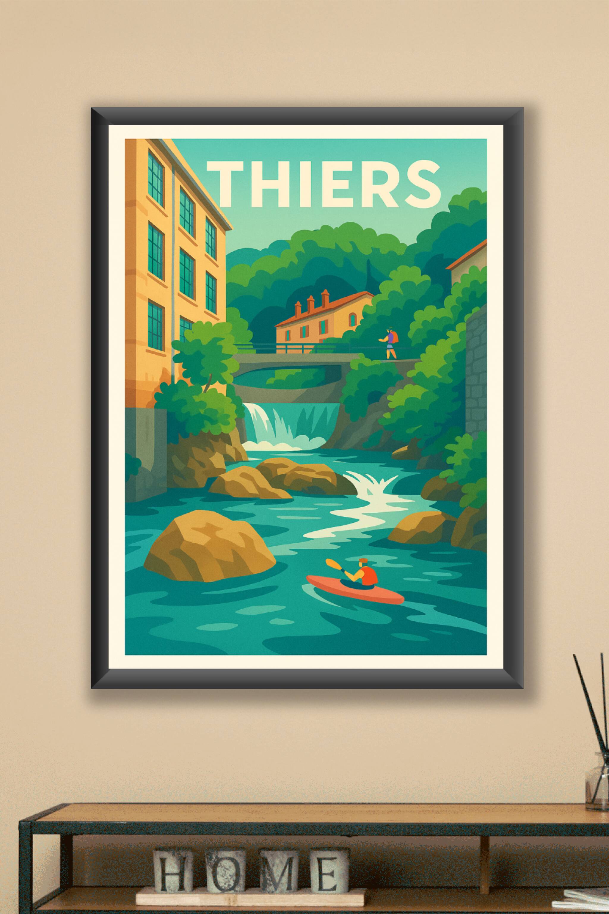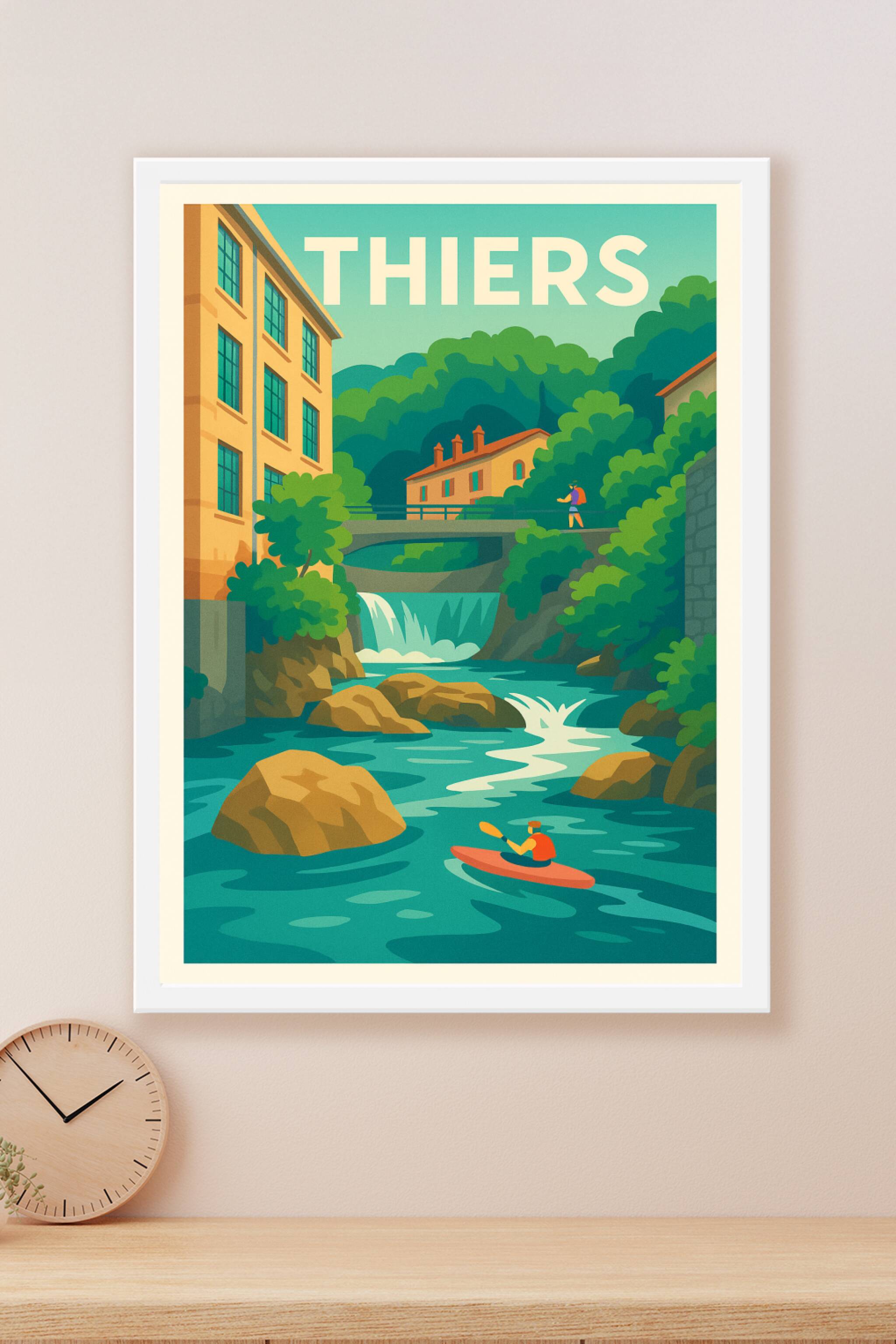 Découvrez la sérénité et la beauté naturelle de Thiers avec cette affiche illustrée qui met en scène un paysage riverain animé par un kayakiste et ...
