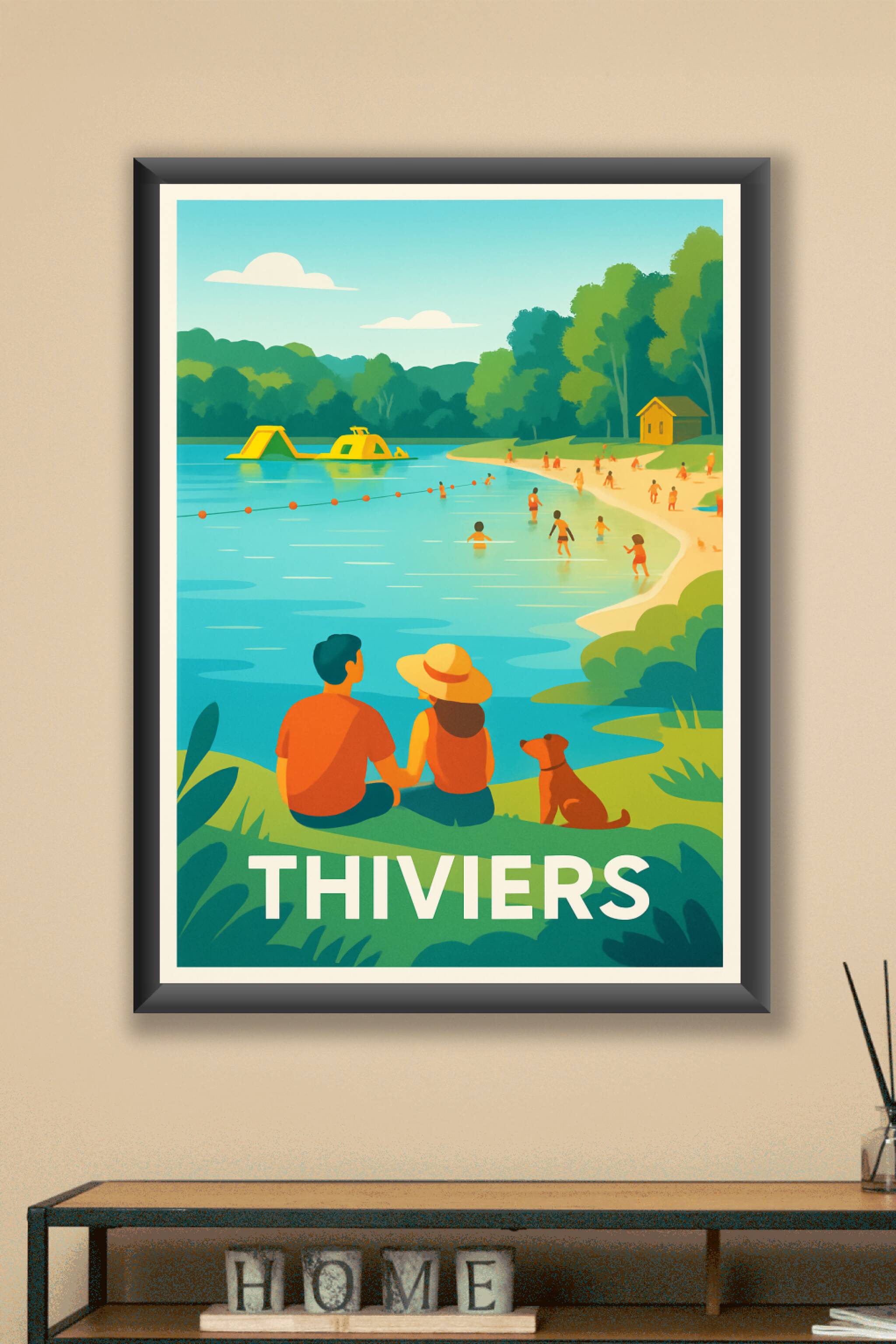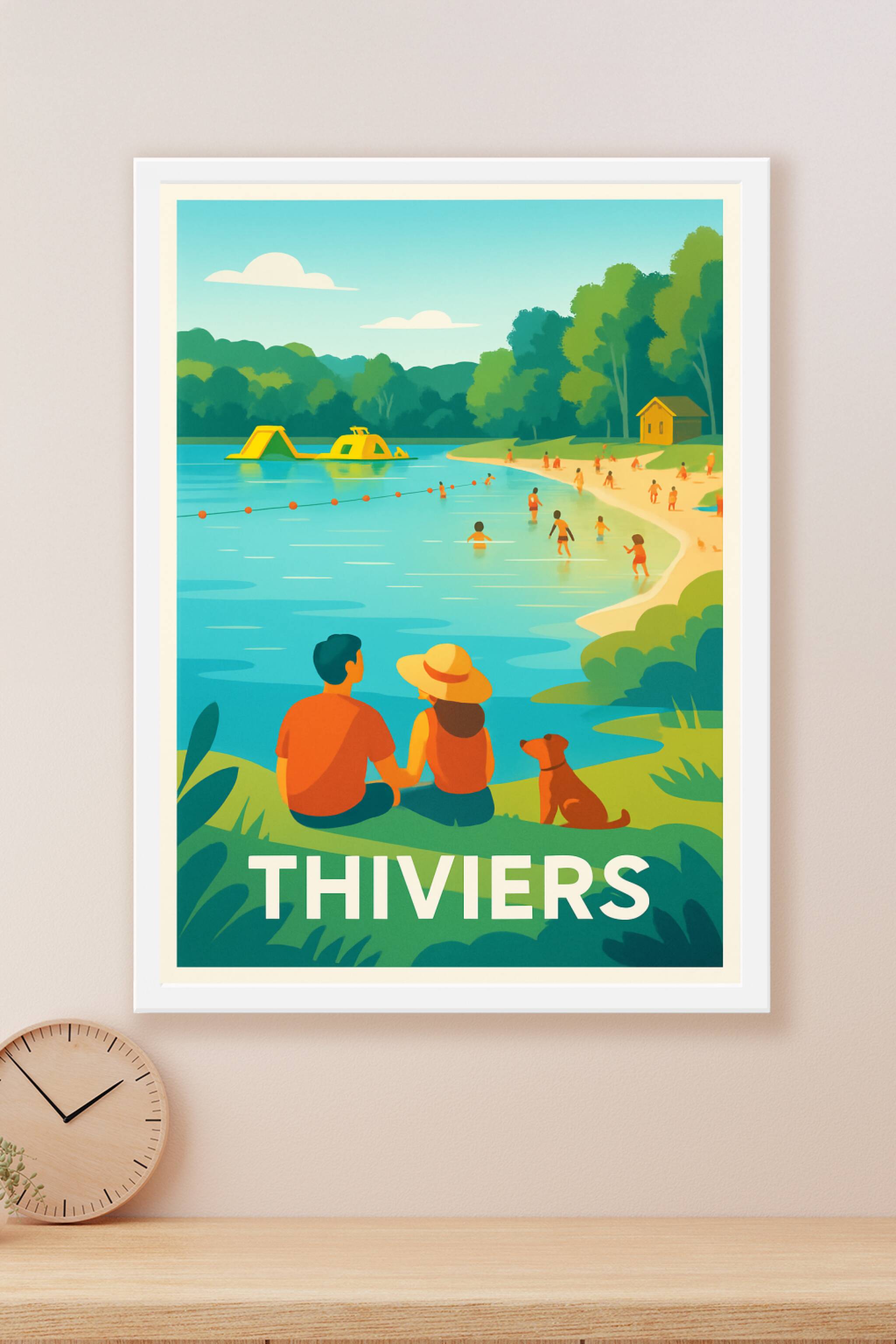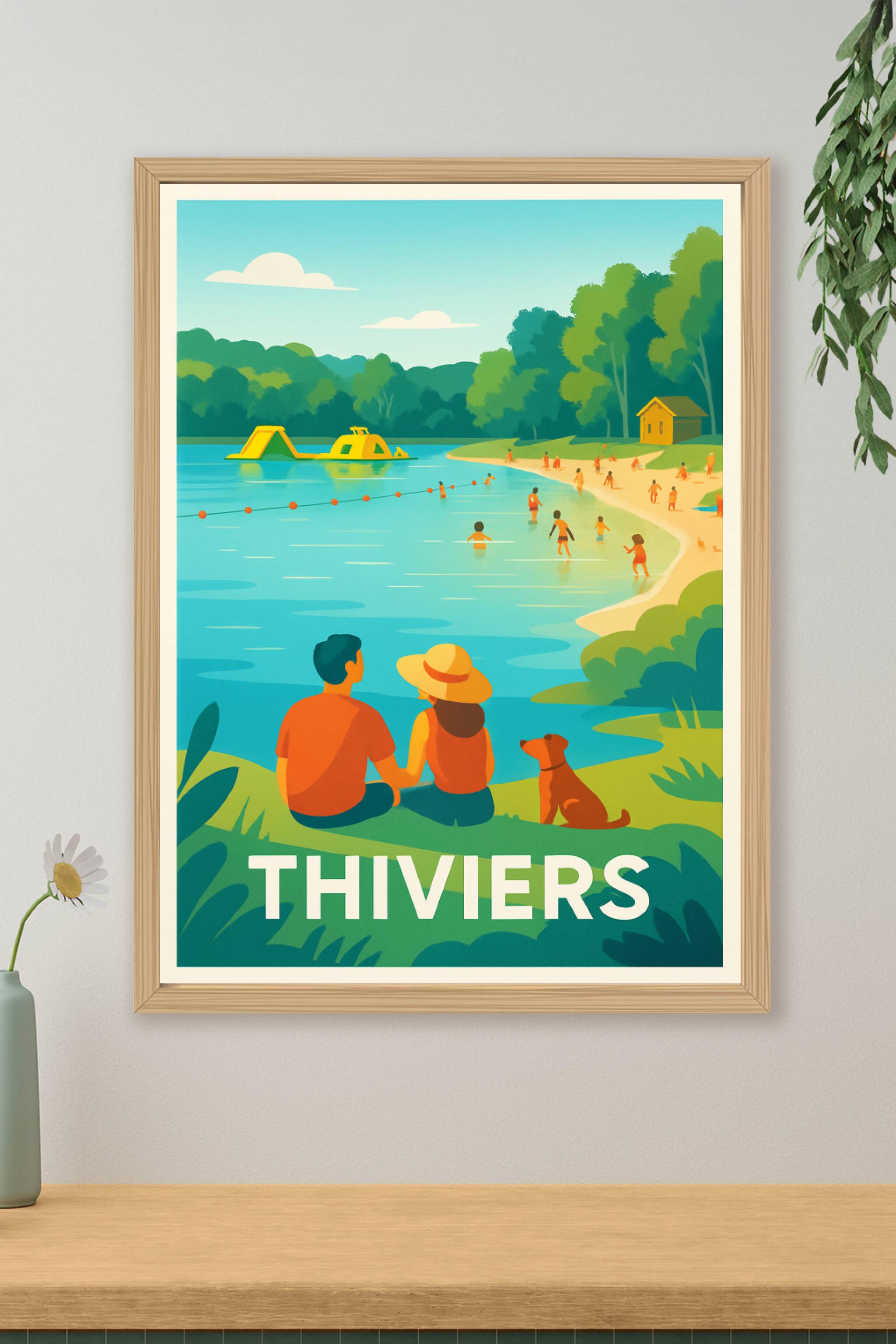 Découvrez l'atmosphère douce et relaxante de Thiviers avec cette affiche illustrée mettant en scène une journée ensoleillée au bord d'un plan d'eau...