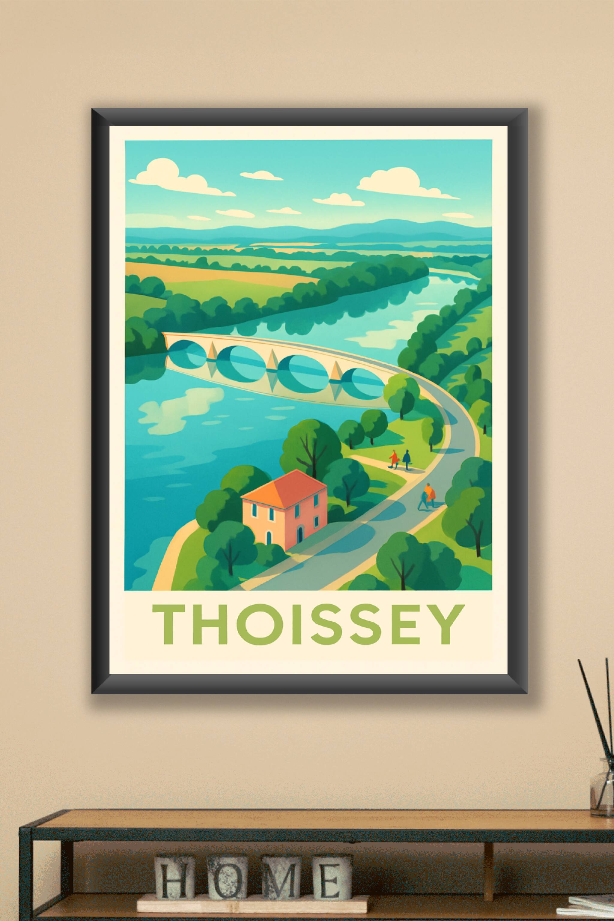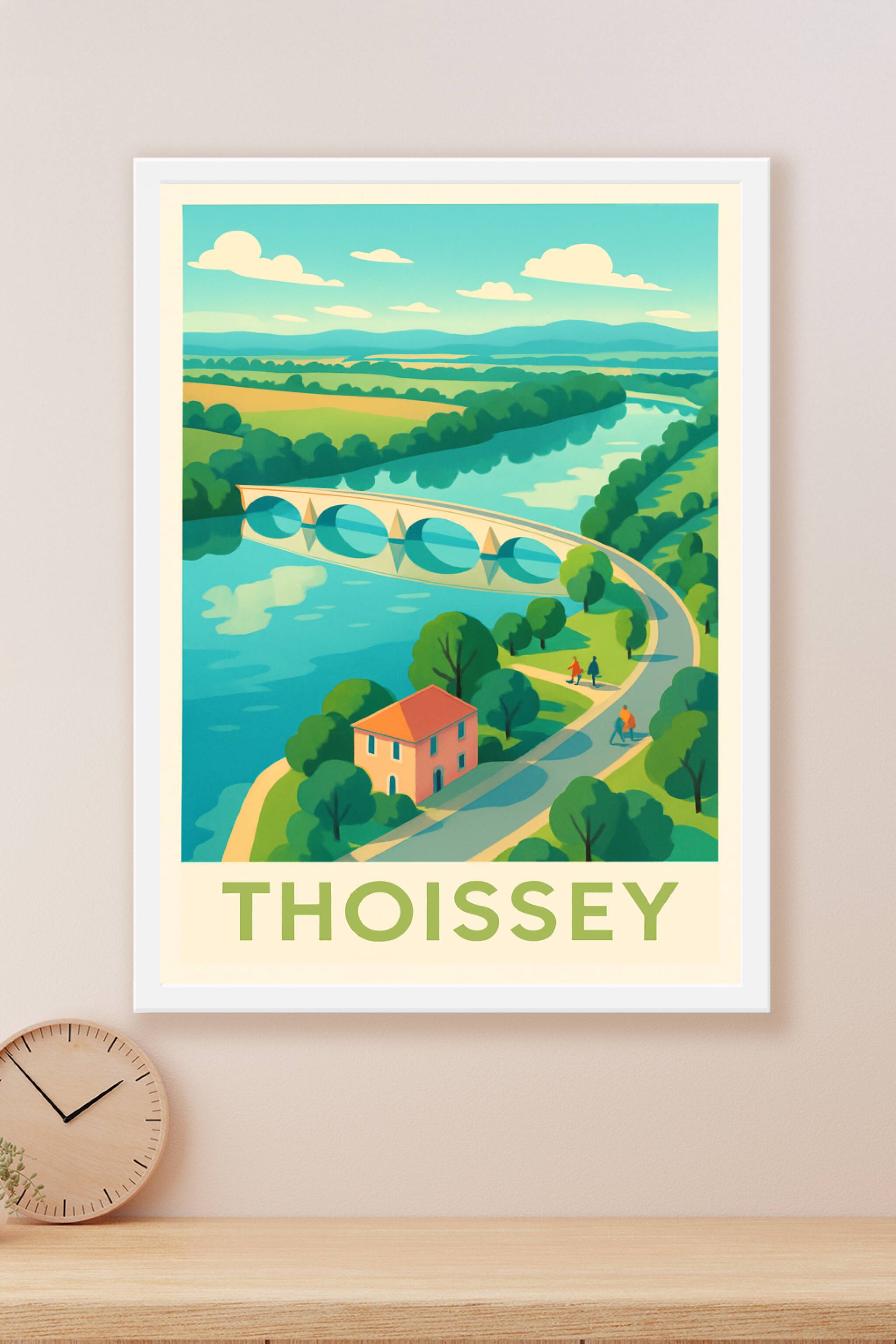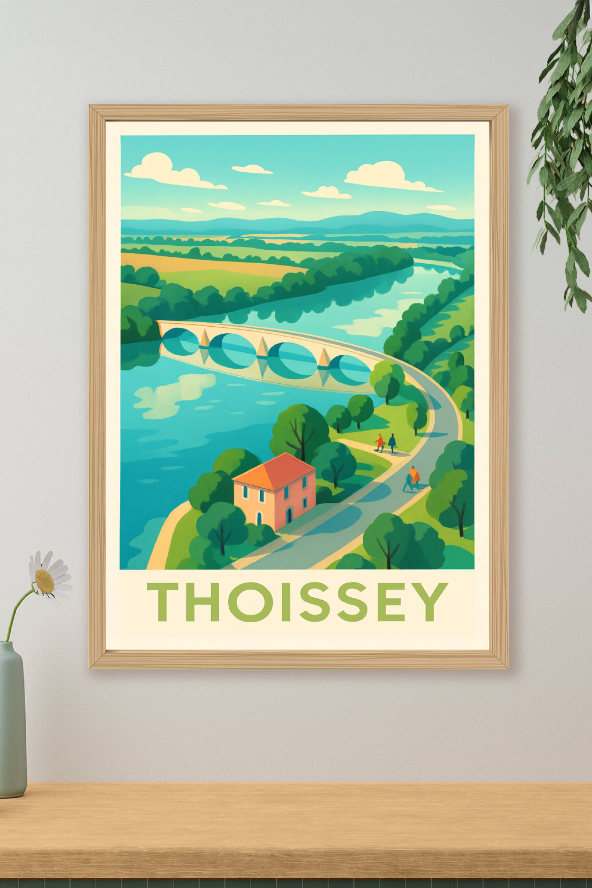 Découvrez la douceur de vivre à Thoissey avec cette affiche illustrant un paysage bucolique où rivière, pont et nature se mêlent harmonieusement. C...