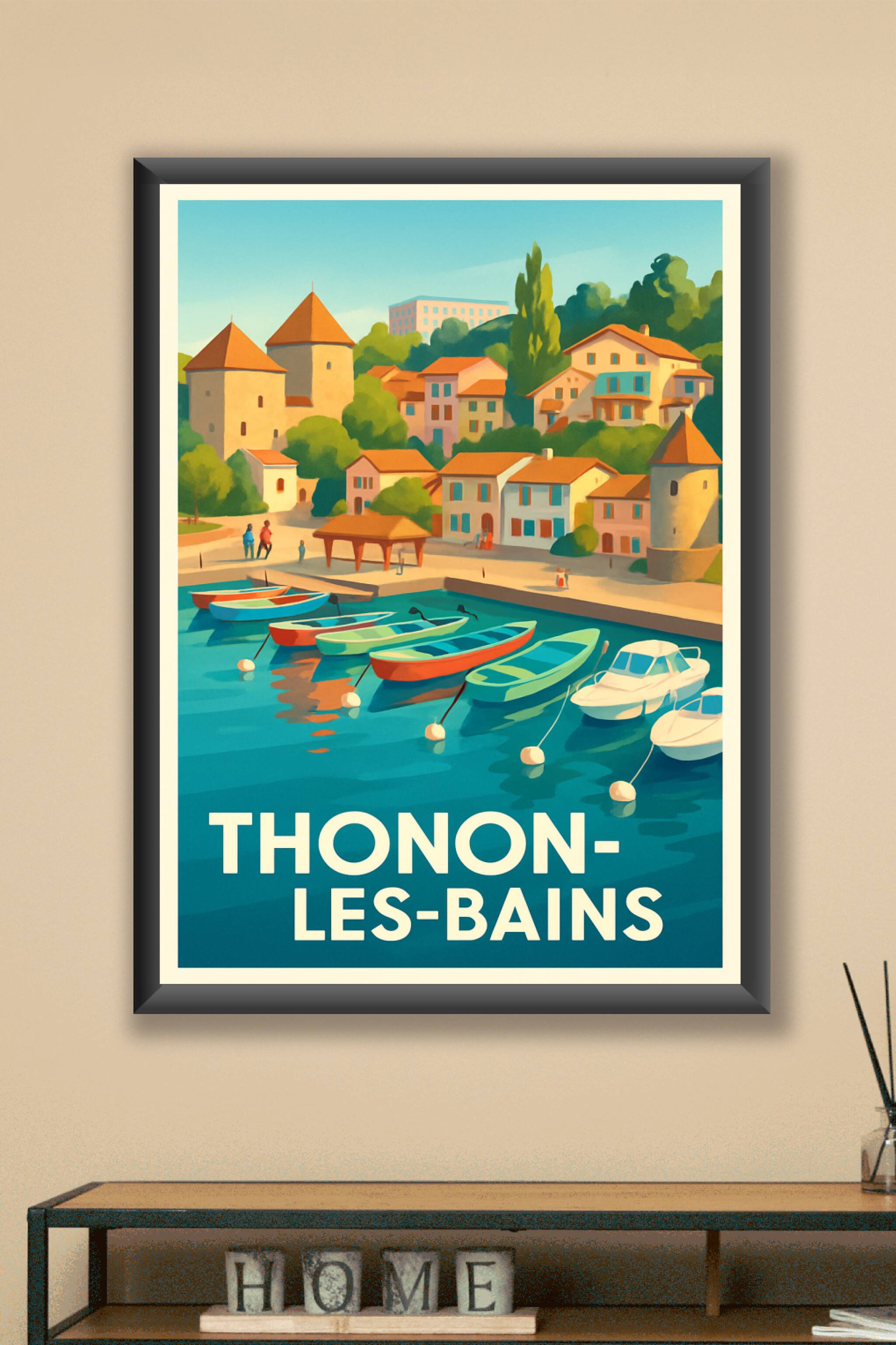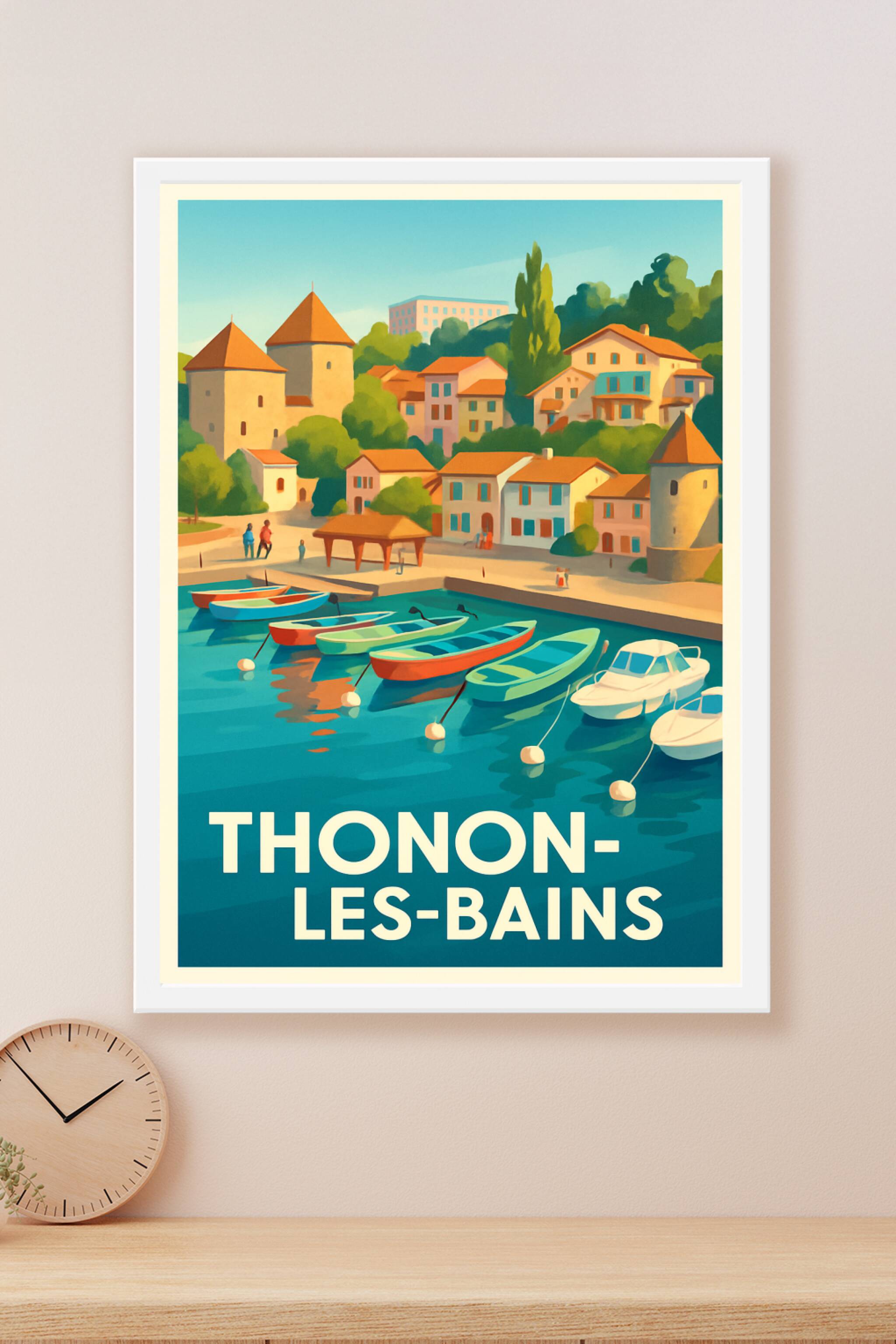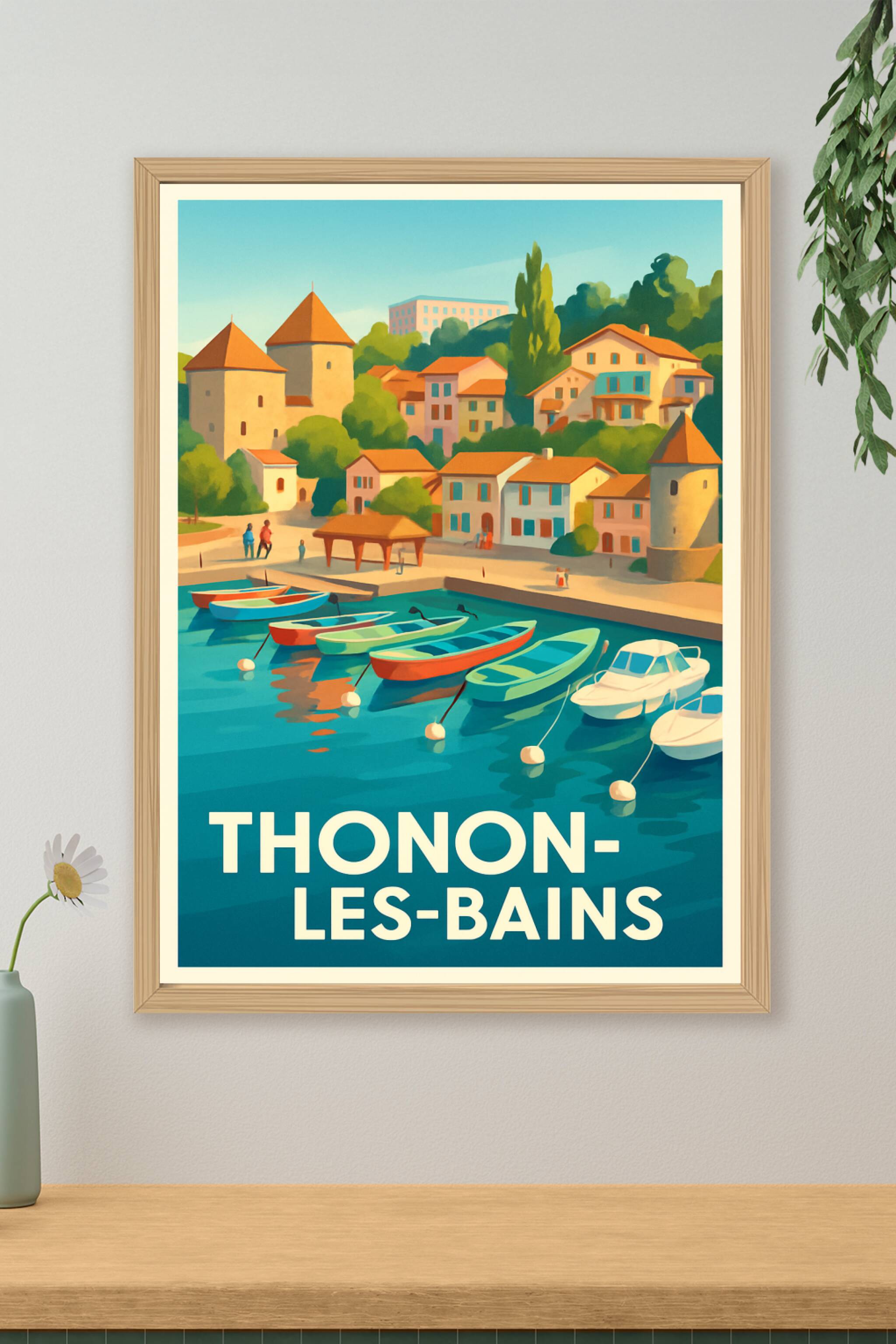 Découvrez l'élégance paisible de Thonon-les-Bains avec cette superbe affiche illustrée mettant en scène ses maisons typiques au toit rouge et son c...