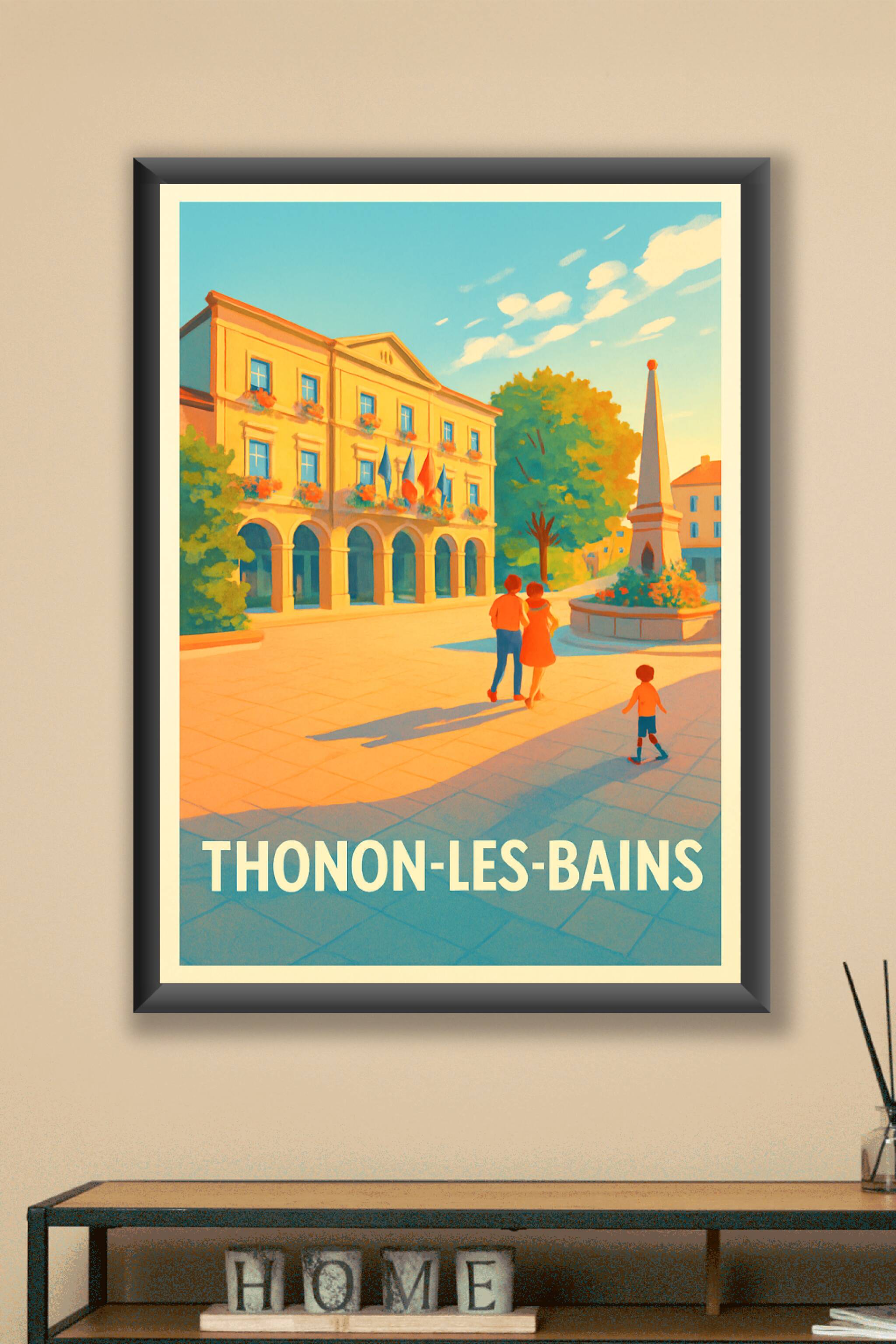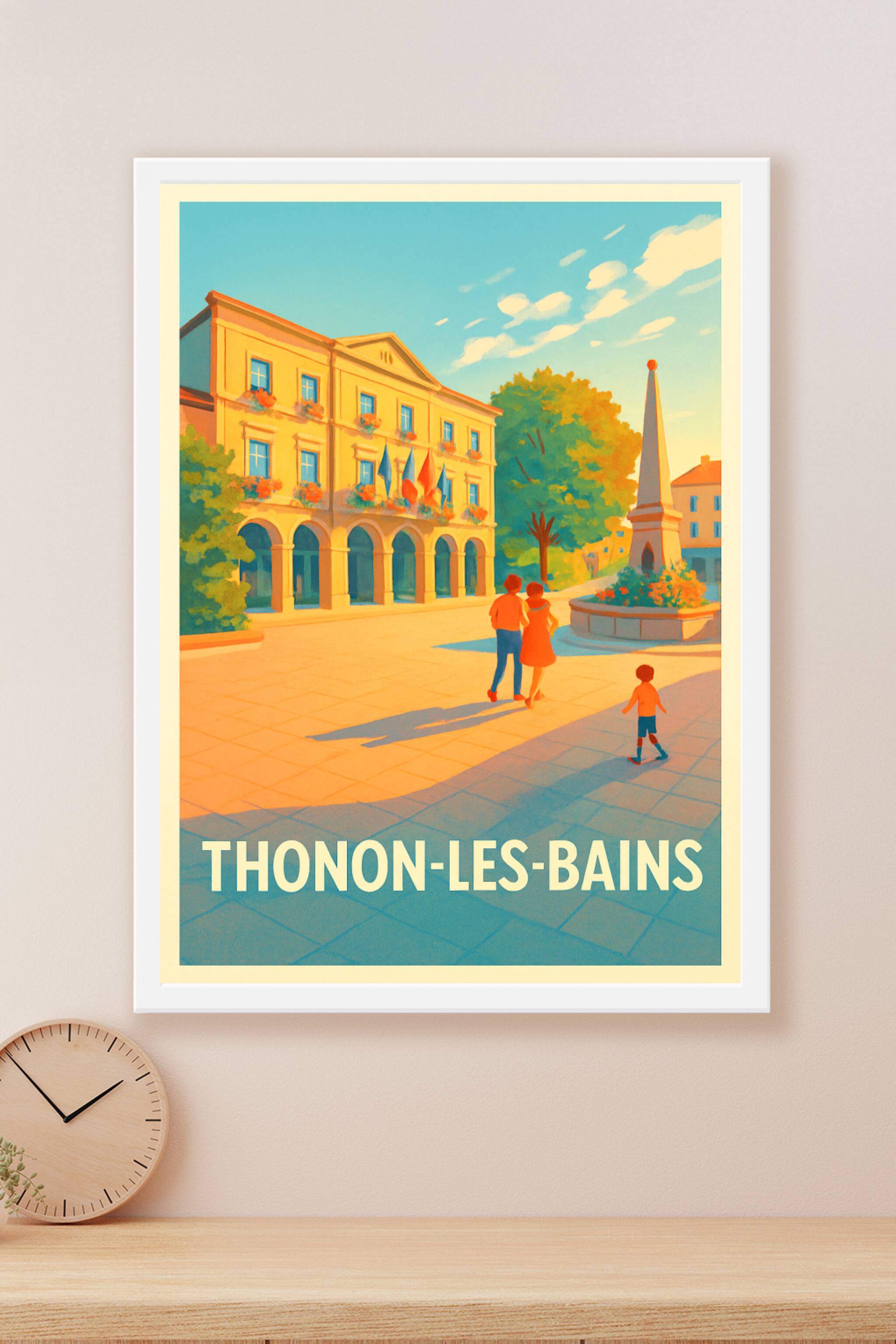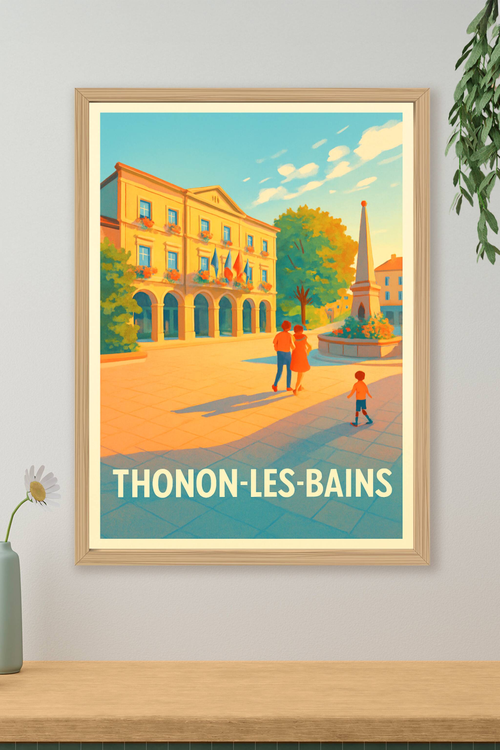 Découvrez cette superbe affiche illustrant une scène paisible et ensoleillée de Thonon-les-Bains, où le charme de la ville se révèle à travers ses ...