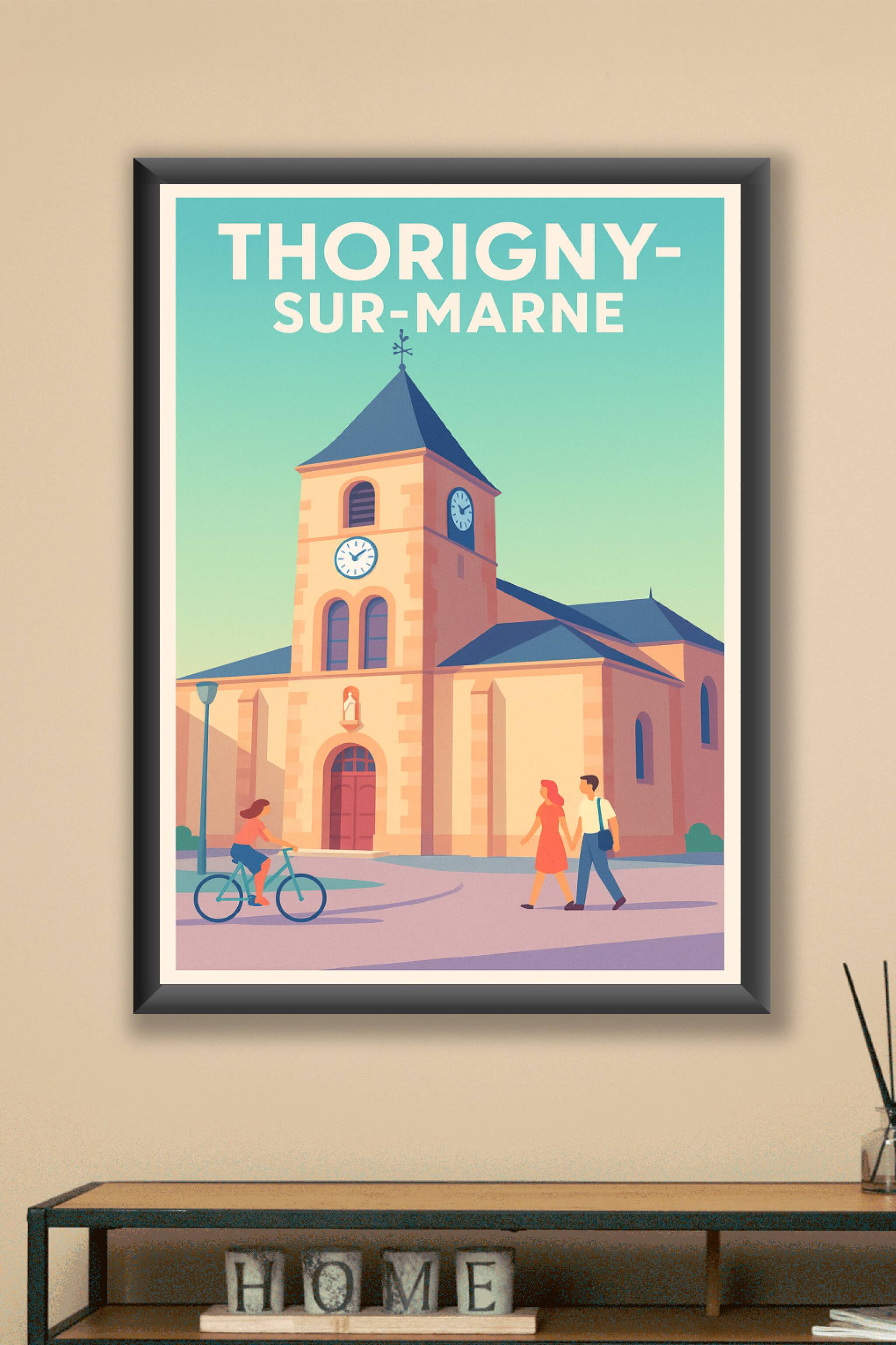 Découvrez cette affiche illustrée mettant en avant l'église emblématique de Thorigny-sur-Marne dans une ambiance paisible et lumineuse. Ce poster c...