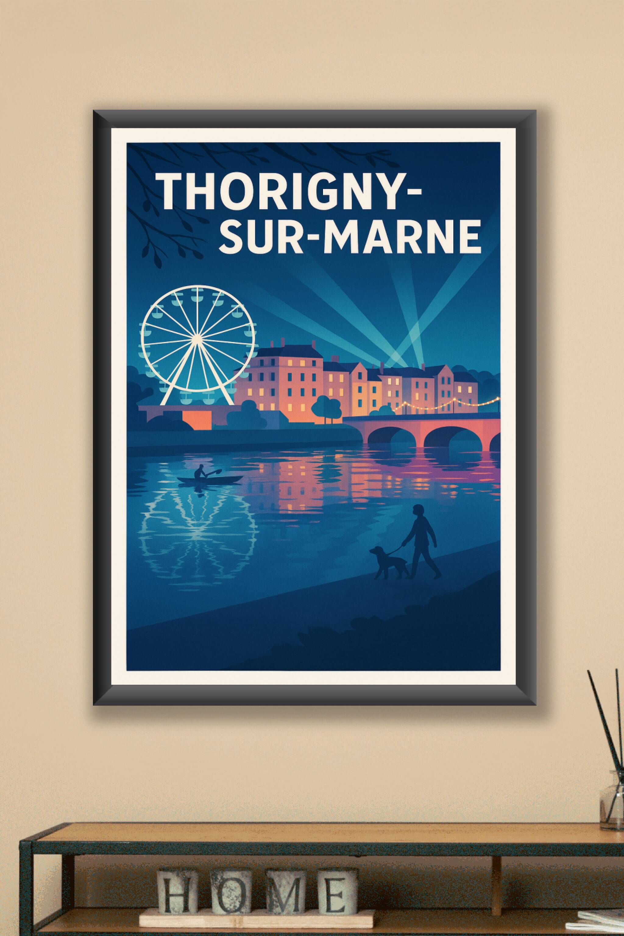 Découvrez l'élégance paisible de Thorigny-sur-Marne avec cette magnifique affiche illustrée, capturant une scène nocturne animée où la grande roue emblématique et les bâtiments illuminés se reflètent sur la Marne. Ce poster offre une ambiance douce et chaleureuse, idéale pour embellir votre intérieur avec une touche de tranquillité et de convivialité.Vous pouvez choisir ce poster en tirage "Fine Art" imprimé sur un papier premium 305g coton, garantissant une qualité d'impression et des couleurs éclatantes d'exception. Disponible en plusieurs formats allant de A1 à A4, avec ou sans cadre, ce tirage réhaussera votre décoration tout en offrant une finition soignée.Offrez-vous ou à vos proches un souvenir élégant et authentique de Thorigny-sur-Marne, sublimé par une impression haut de gamme 100% fabriquée en France.