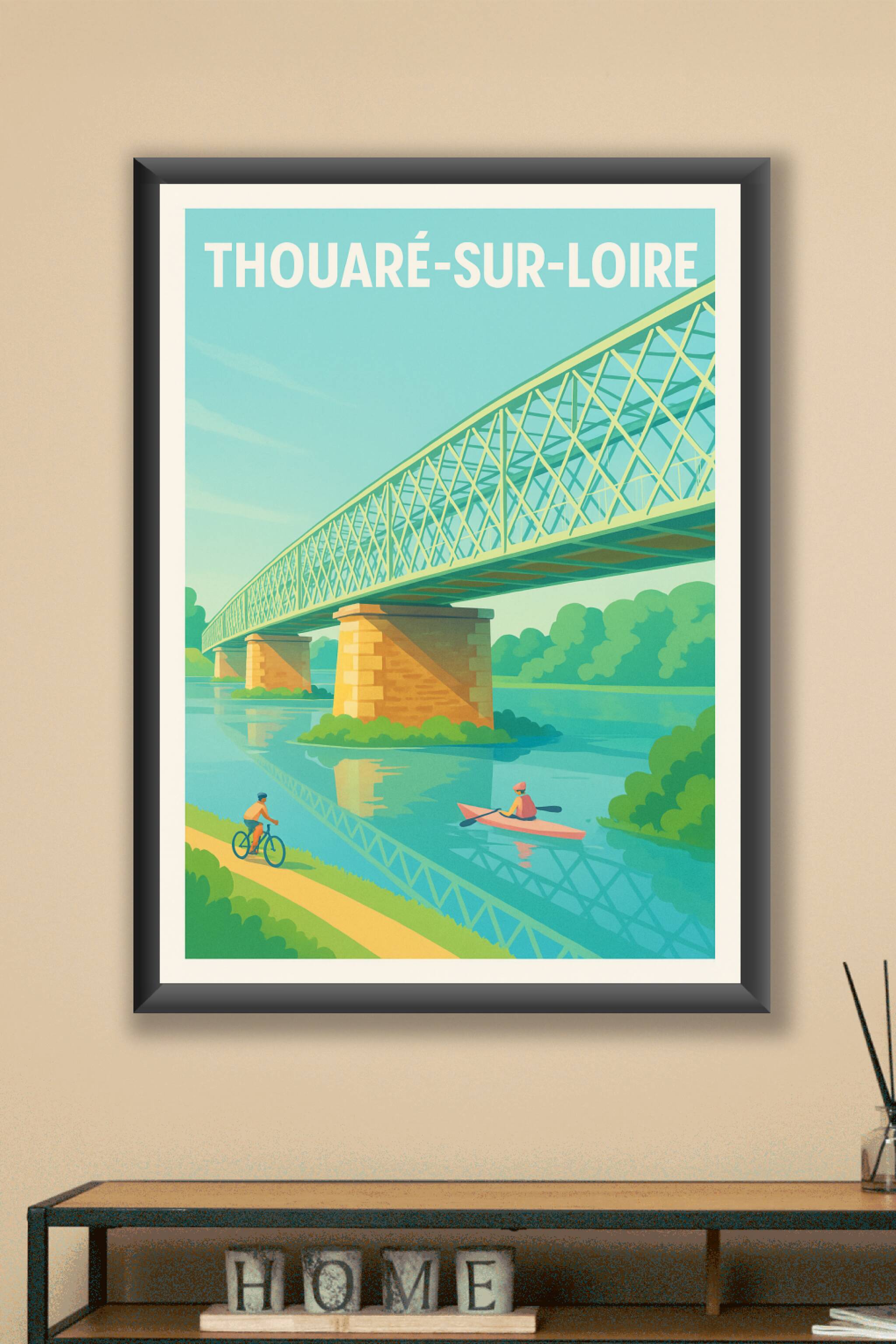 Découvrez l'élégance tranquille de Thouaré-sur-Loire avec cette affiche douce et lumineuse mettant en scène le pont emblématique qui traverse la Loire. Ce poster capture l'harmonie entre nature et architecture, avec un cycliste et un kayakiste profitant paisiblement du panorama. Idéale pour enrichir votre décoration, cette affiche est imprimée en tirage "Fine Art" sur papier 305g coton, garantissant une qualité d'impression optimale et des couleurs vibrantes. Disponible en formats A1 à A4, avec ou sans cadre, elle s'adapte parfaitement à tous les espaces, du salon à votre bureau. Offrez-vous un souvenir intemporel de la vie au bord de la Loire, avec une finition premium 100% made in France.