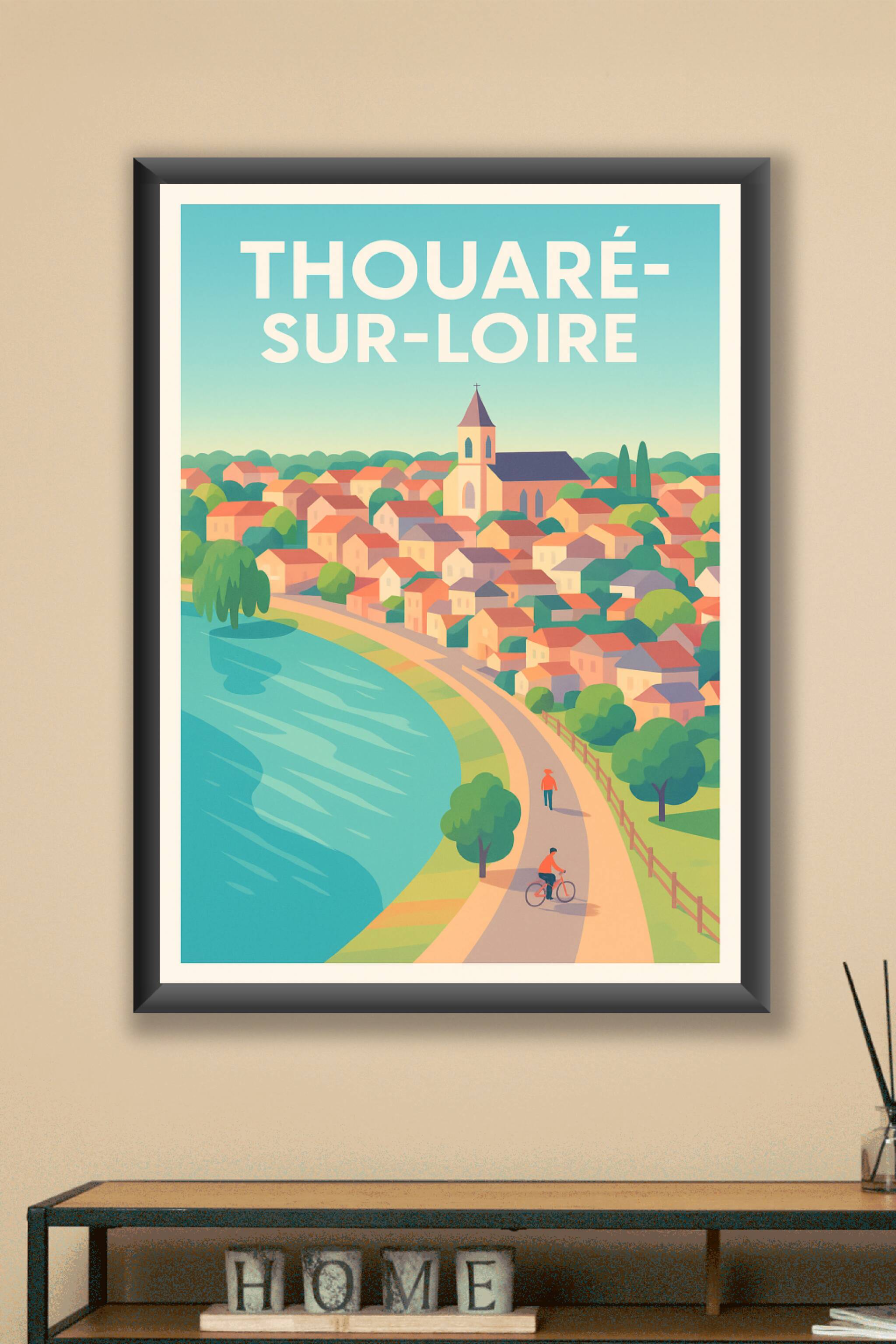 Découvrez la douceur et la sérénité de Thouaré-sur-Loire avec cette affiche illustrée qui met en valeur la beauté de ses maisons colorées et le che...