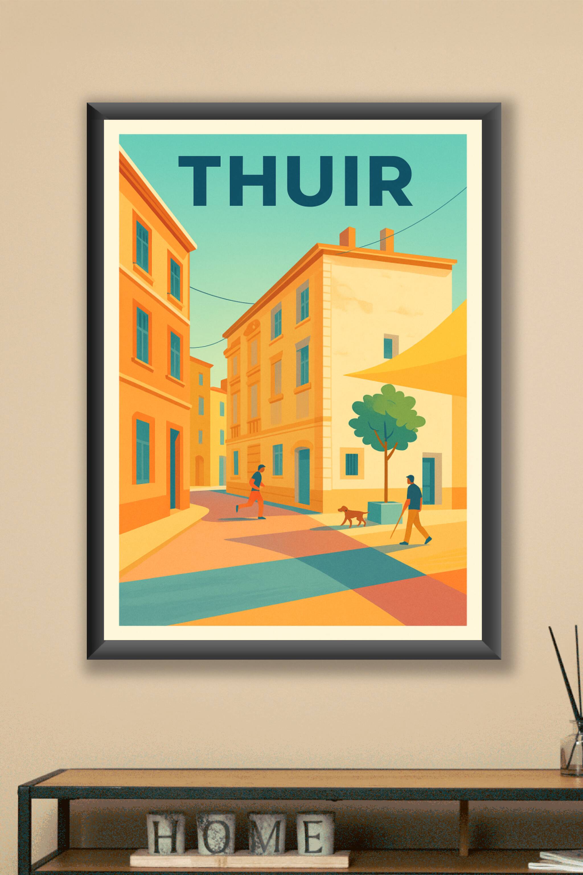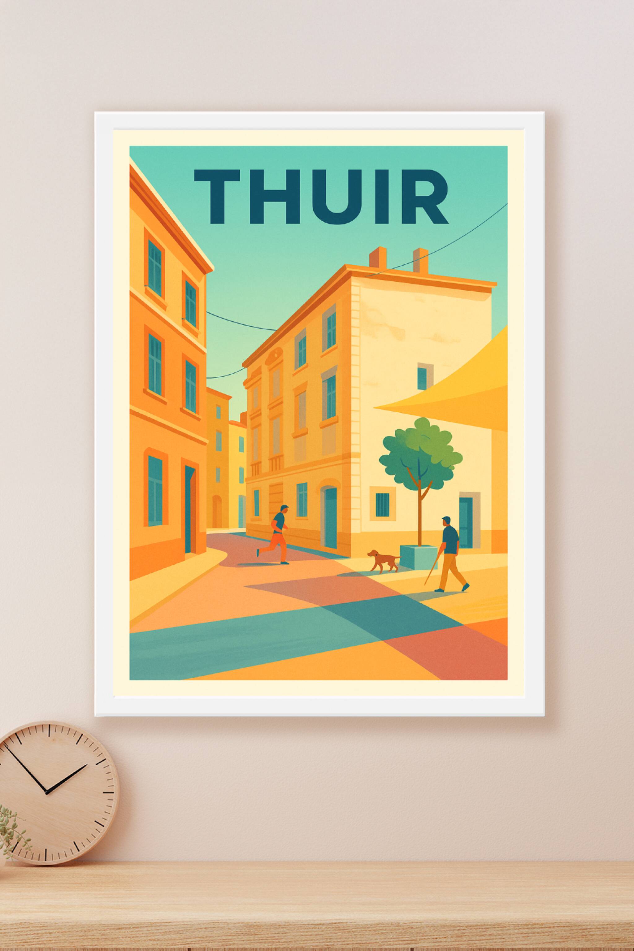 Découvrez le charme unique de Thuir capturé dans cette affiche au style graphique et lumineux. Les ruelles baignées de lumière douce et les bâtiments aux teintes chaleureuses racontent une scène de vie paisible pleine de douceur méridionale. Ce poster finement imprimé en qualité "Fine Art" sur papier 305g coton assure des couleurs éclatantes et une longue tenue dans le temps. Disponible en formats A1 à A4, avec ou sans cadre, cette affiche apporte une touche contemporaine et élégante à votre décoration intérieure. Offrez-vous ce tirage premium, 100% fabriqué en France, pour embellir votre intérieur ou comme cadeau original pour les amoureux de la ville de Thuir.